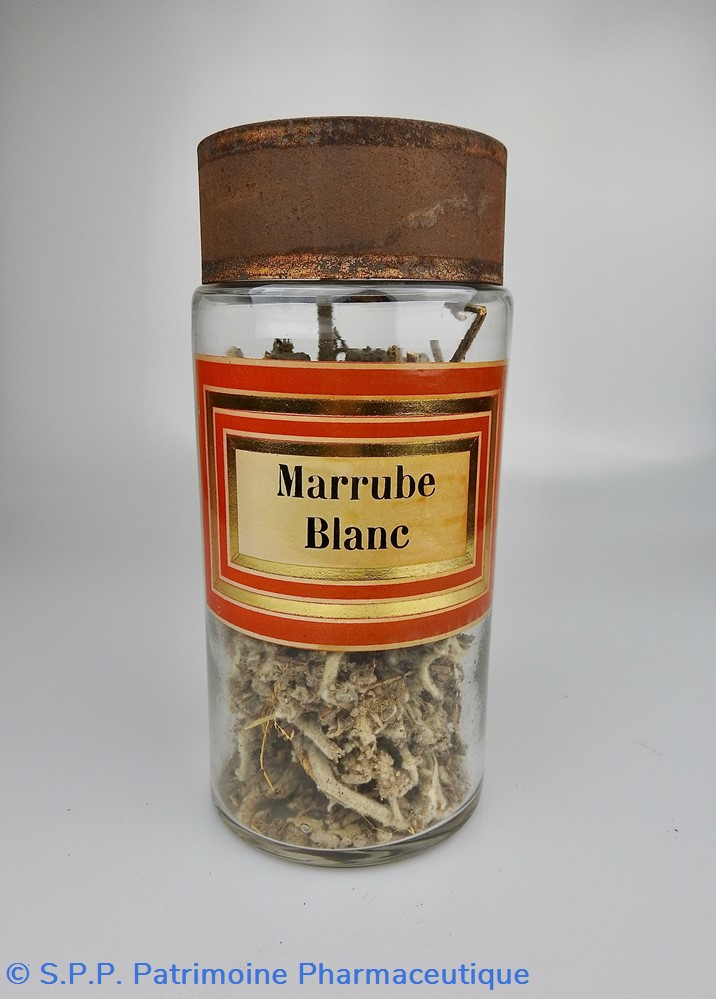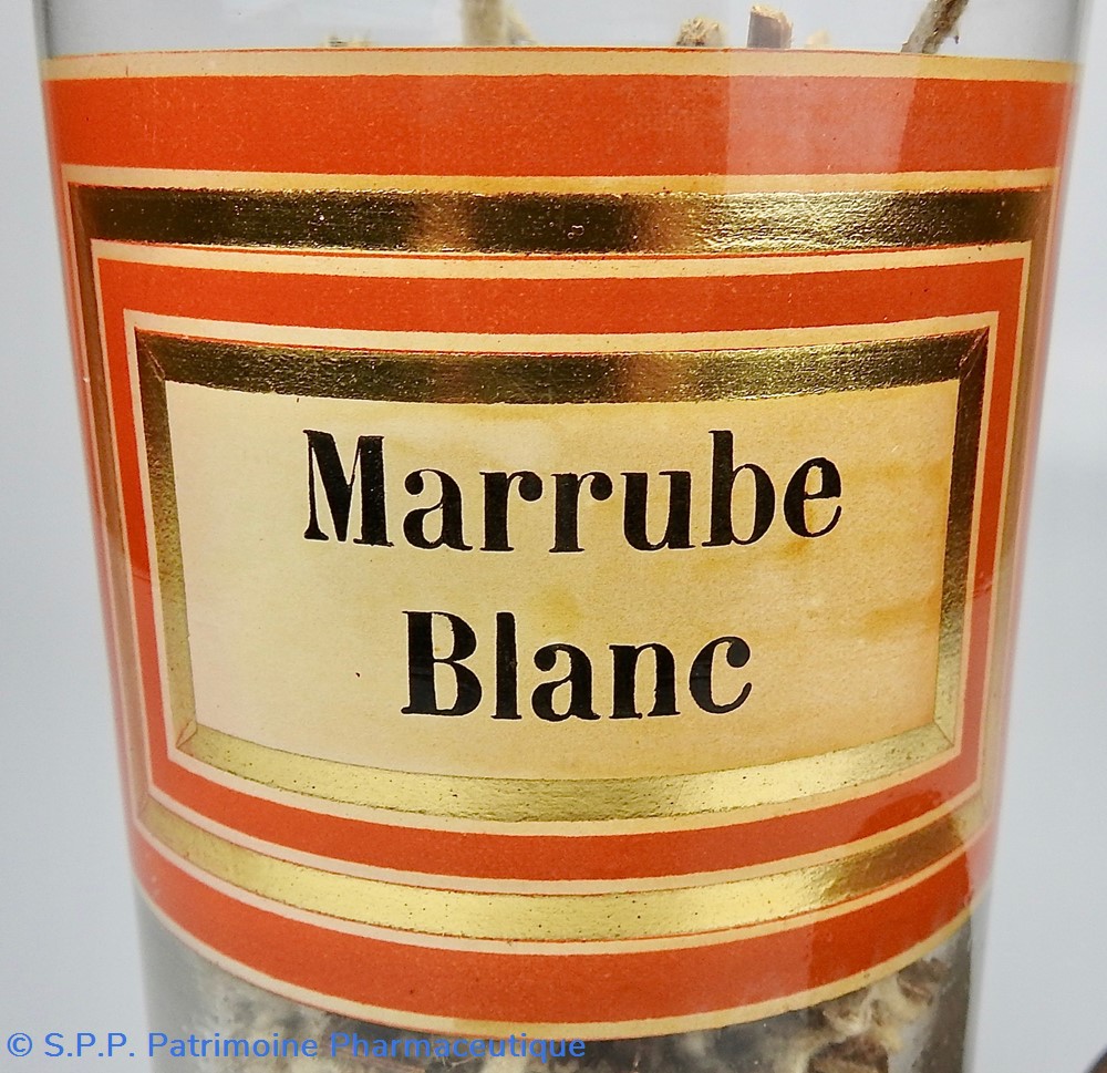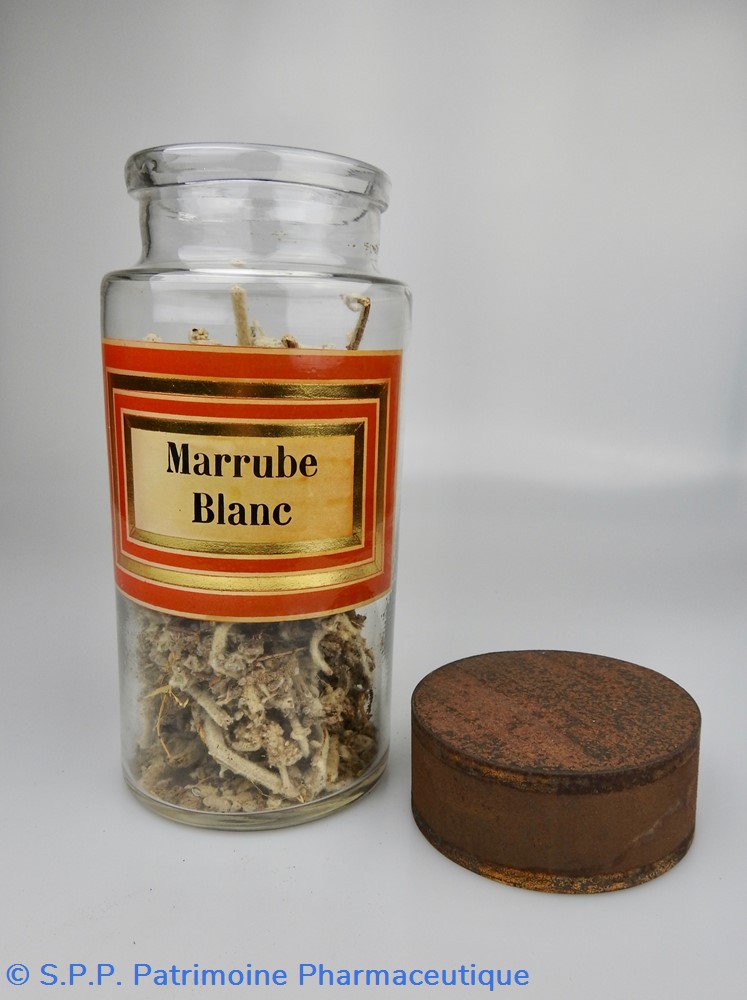 Flacon de pharmacie en verre soufflé à large ouverture supérieure permettant l'introduction facile de plantes. Etiquette collée à l'intérieur très joliment ornée d'encadrements alternés or et rouge. Le nom est inscrit en noir au milieu d'un rectangle beige. Un couvercle en tôle peinte mais fortement rouillé surmonte le flacon sans bouchon intérieur. Ce couvercle était initialement décoré à sa base et dans la partie supérieure d'un filet doré. Le flacon est encore rempli à moitié de Marrubium Album