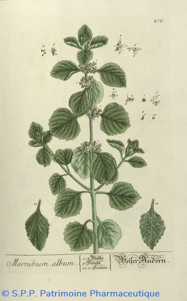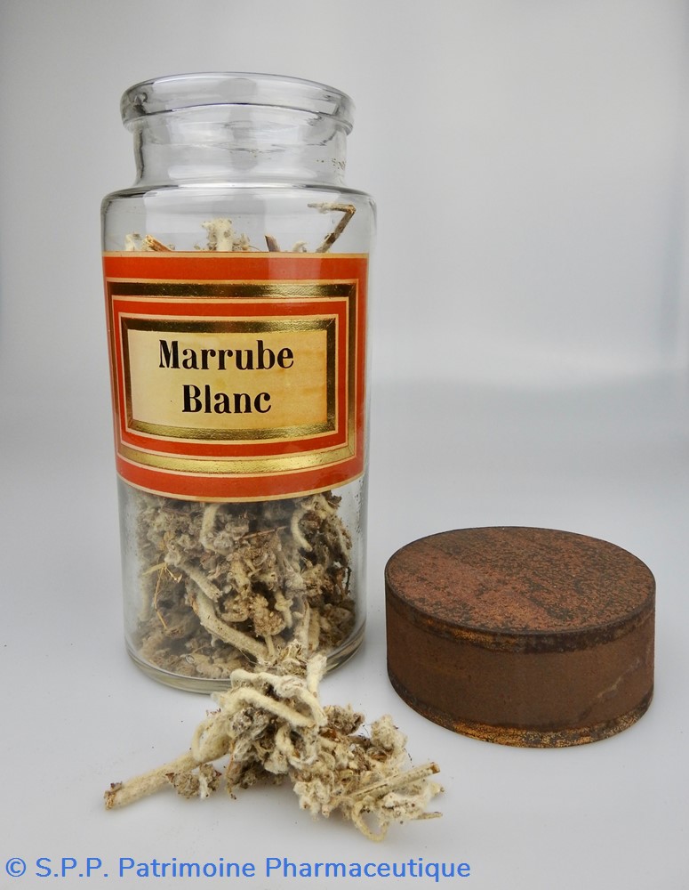 Le Marrubium Album ou Marrubium vulgare de la famille des Labieae est une plante herbacée vivace cotonneuse blanchâtre qui croît abondamment au bord des routes. Les sommités fleuries sont riches en diterpènes ( marrubine), en composés phénylpropaniques (verbascoside) et contiennent une faible quantité d'huile essentielle. Les parties aériennes fleuries de Marrube blanc sont inscrites à la Pharmacopée européenne, mongraphie 01/2019, n°1835.