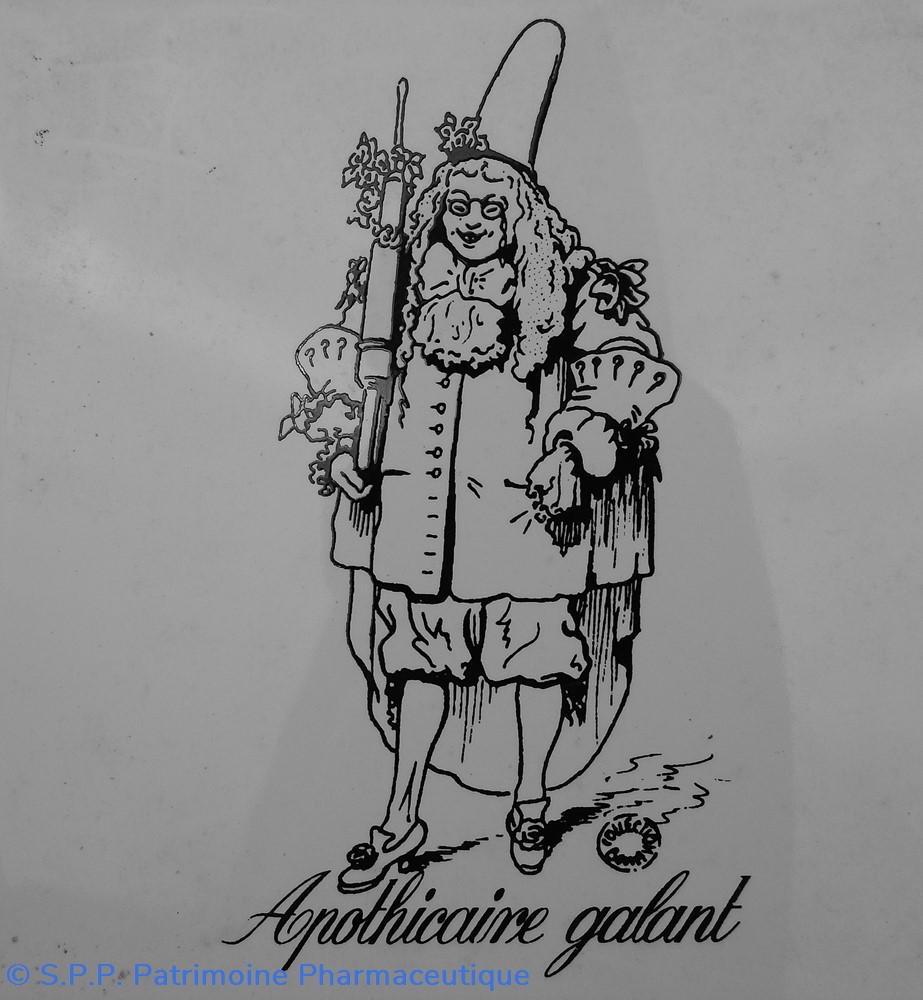 Apothicaire Galant en référence à Monsieur de Pourceaugnac de Molère. Carreau en faïence pour réaliser un carrelage à sujet pharmaceutique dans une pharmacie.