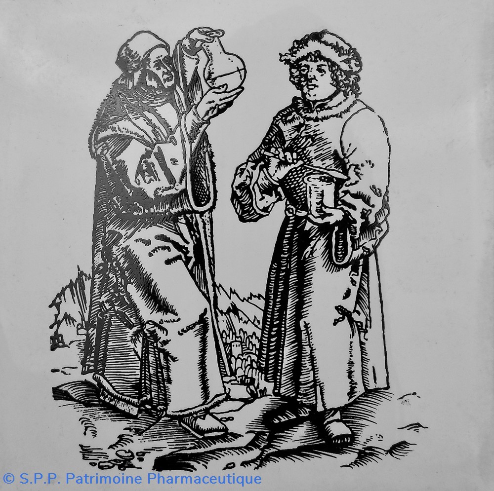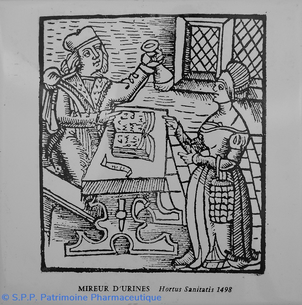 L'apothicaire, mireur d'urines d'après l' Hortus Sanitatis (1498)