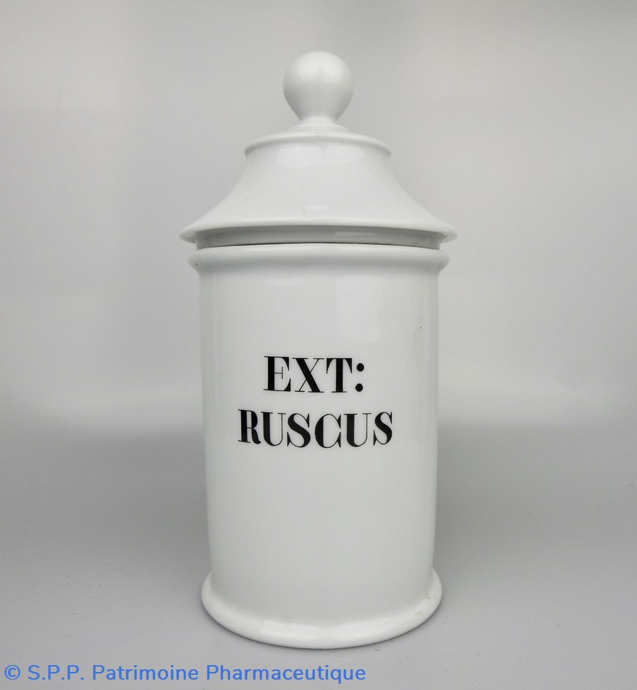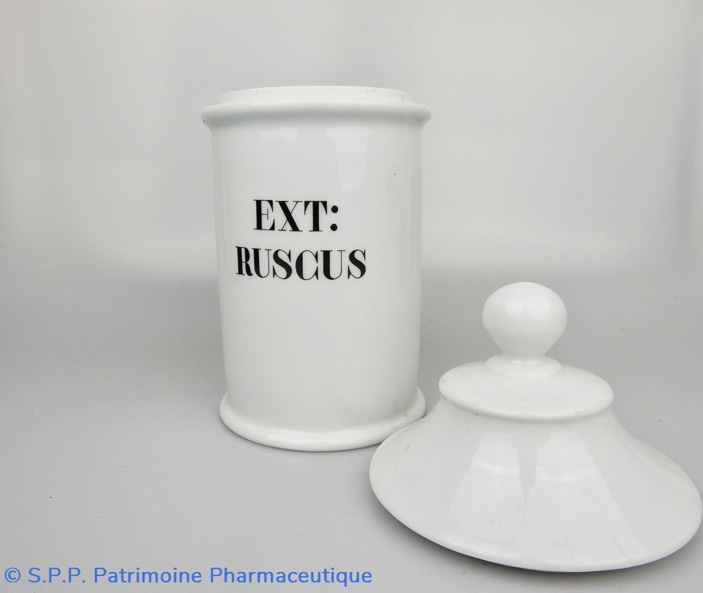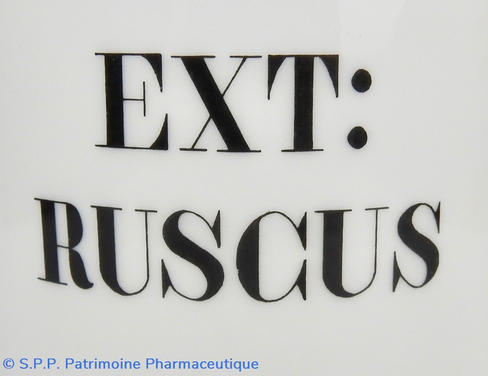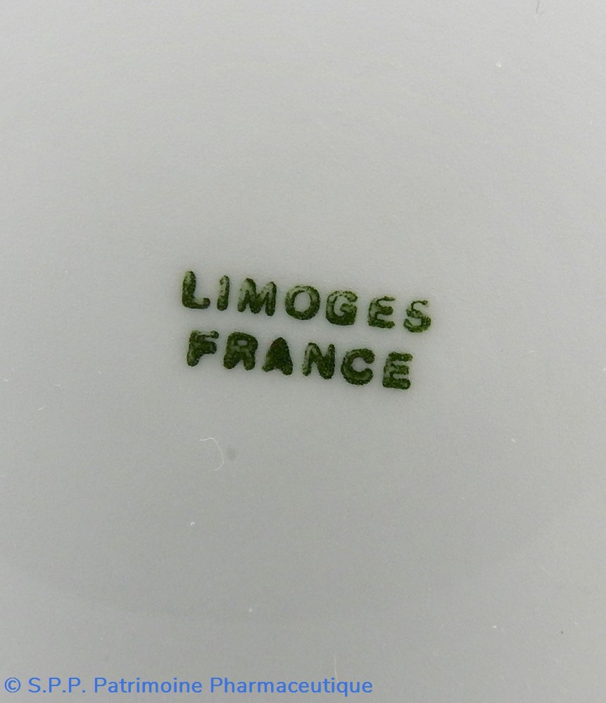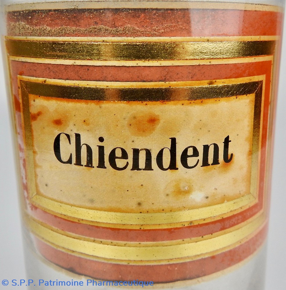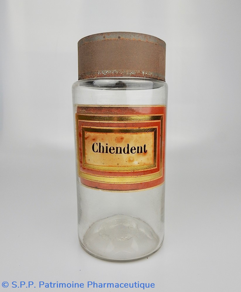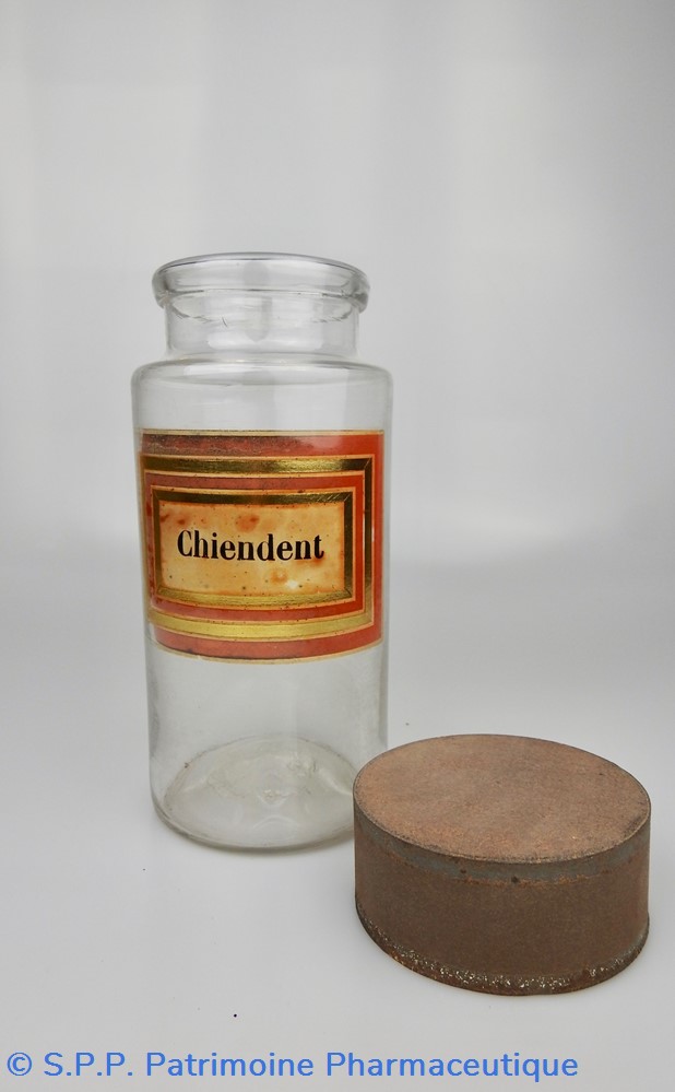 Flacon de pharmacie en verre soufflé à large ouverture supérieure permettant l'introduction facile de plantes. Etiquette collée à l'intérieur très joliment ornée d'encadrements alternés or et rouge. Le nom est inscrit en noir au milieu d'un rectangle beige. Quelques taches sont visibles sur l'étiquette qui commence à se décoller sur la gauche. Un couvercle en tôle peinte mais fortement rouillé surmonte le flacon sans bouchon intérieur. Ce couvercle était initialement décoré à sa base et dans la partie supérieure de filets dorés. Le flacon est vide de plantes.