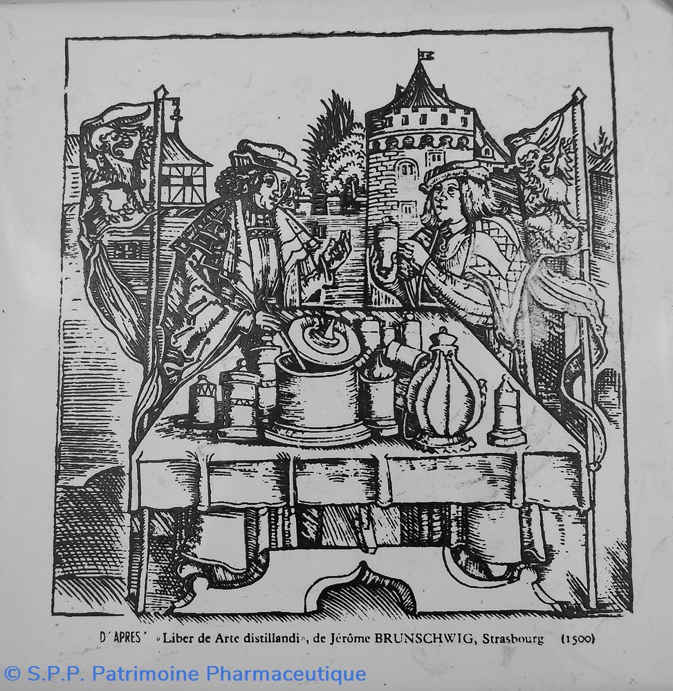 La boutique de l'Apothicaire d'après Jérome Brunschwig (1500) Carreau de faïence pour réaliser un carrelage relatif à l'exercice de la pharmacie.