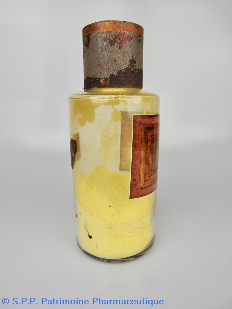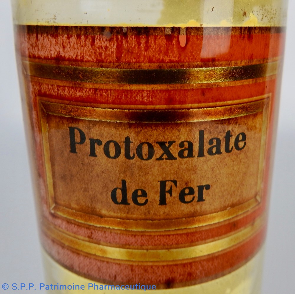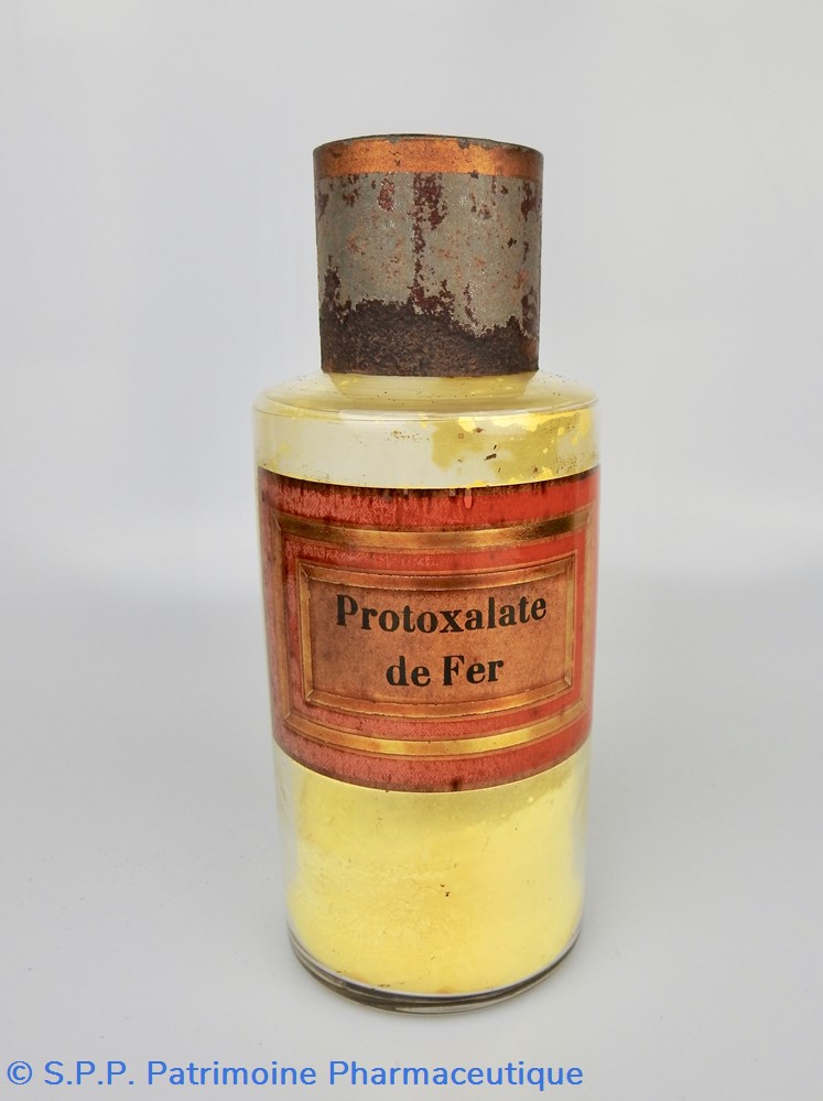 Flacon de pharmacie en verre soufflé avec ouverture en goulot évasé permettant de verser des poudres. Etiquette crème entourée de bandes alternées rouge et or. Le nom est inscrit en noir au milieu d'un rectangle crème au centre de l'étiquette. L'étiquette s'est ocrée au cours du temps. Un couvercle en tôle peinte mais fortement rouillé surmonte le flacon sans bouchon intérieur. Ce couvercle était initialement décoré à sa base et dans la partie supérieure d'un filet doré. Le flacon est rempli au 1/4 de protoxalate de fer jaune.