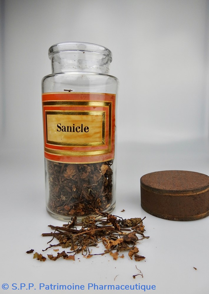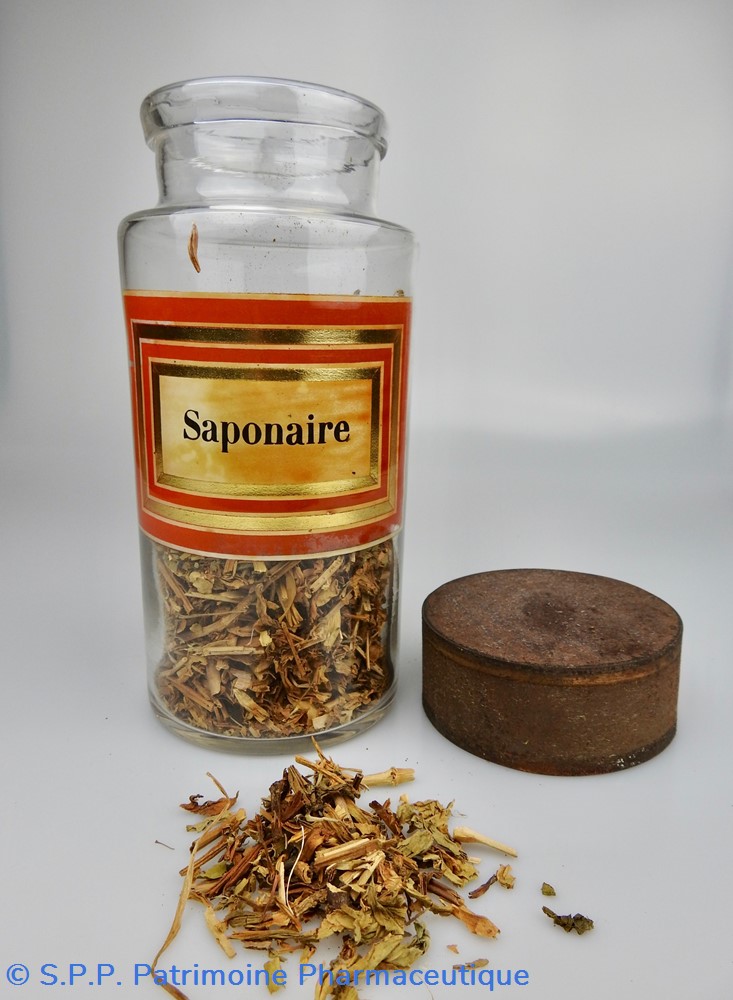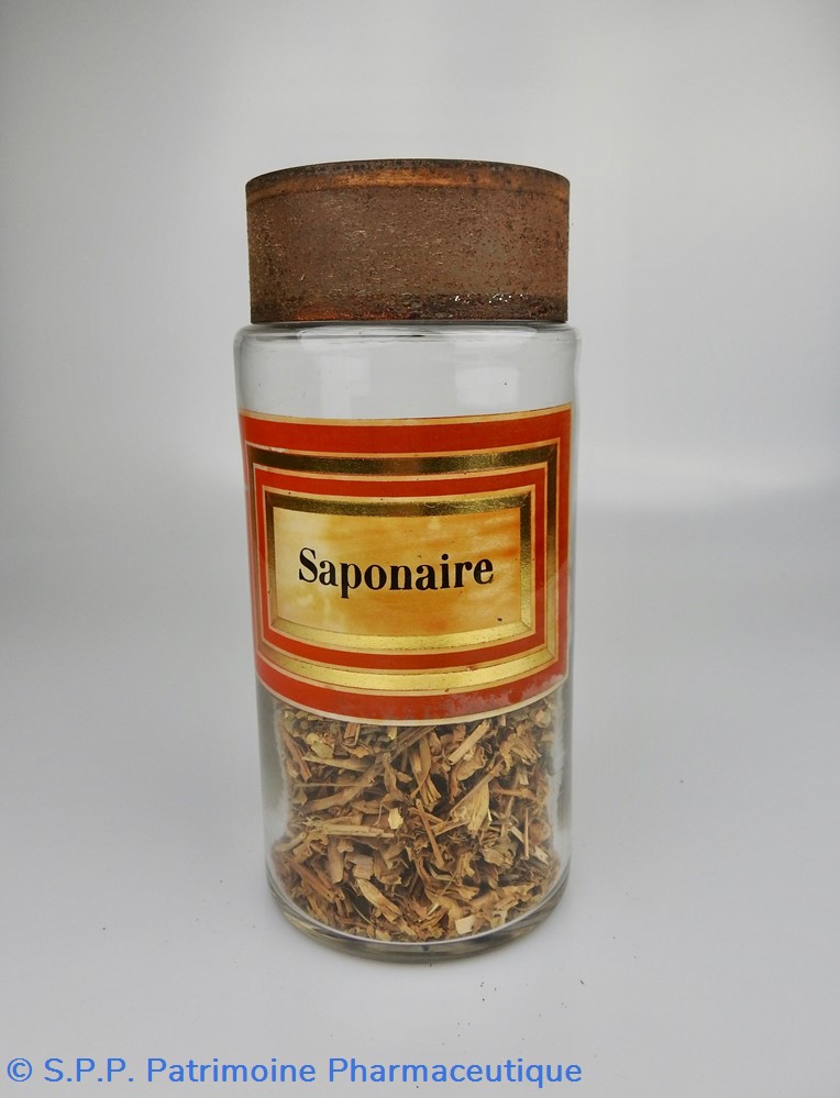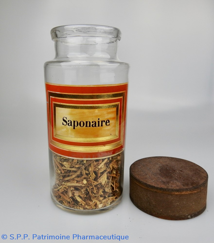Flacon de pharmacie en verre soufflé à large ouverture supérieure permettant l'introduction facile de plantes. Etiquette collée à l'intérieur très joliment ornée d'encadrements alternés or et rouge. Le nom est inscrit en noir au milieu d'un rectangle beige. Un couvercle en tôle peinte mais fortement rouillé surmonte le flacon sans bouchon intérieur. Ce couvercle était initialement décoré à sa base et dans la partie supérieure d'un filet doré. Le flacon est encore rempli à moitié de racines de Saponaire