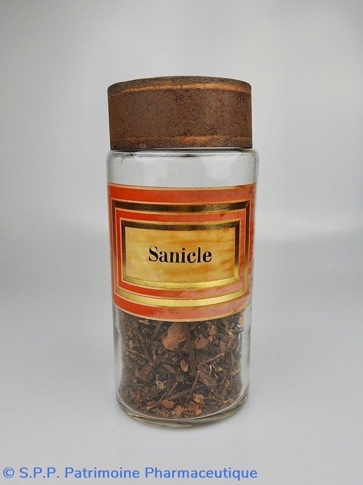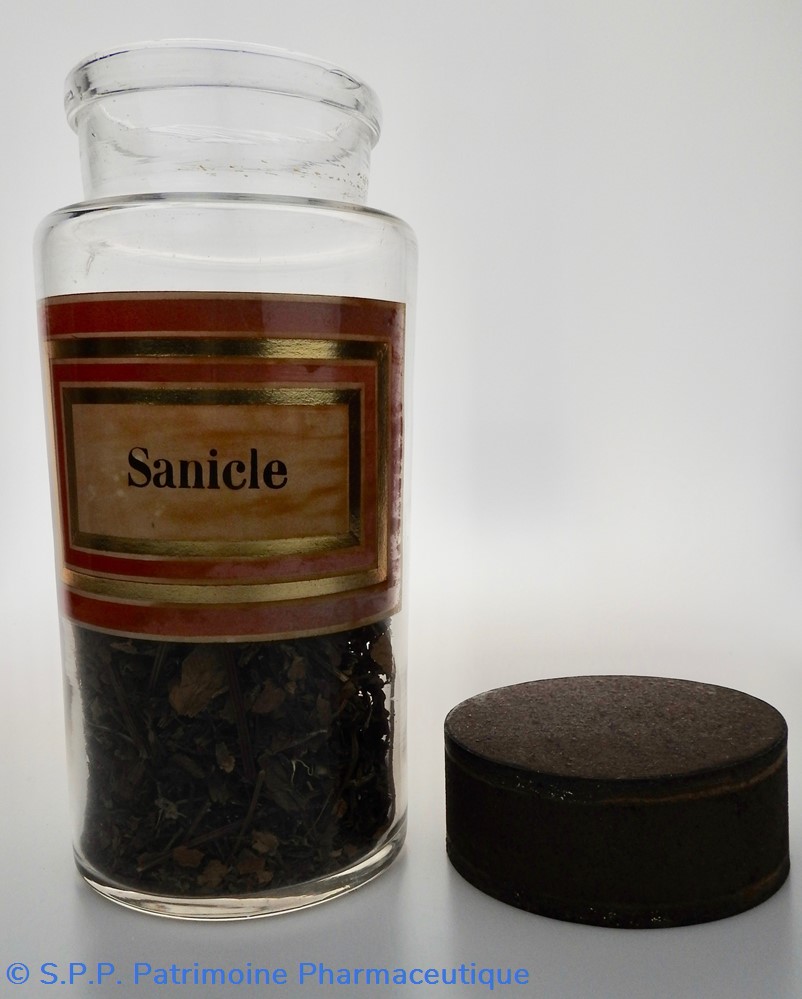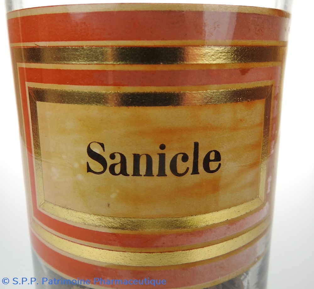 Flacon de pharmacie en verre soufflé à large ouverture supérieure permettant l'introduction facile de plantes. Etiquette collée à l'intérieur très joliment ornée d'encadrements alternés or et rouge. Le nom est inscrit en noir au milieu d'un rectangle beige. Un couvercle en tôle peinte mais fortement rouillé surmonte le flacon sans bouchon intérieur. Ce couvercle était initialement décoré à sa base et dans la partie supérieure d'un filet doré. Le flacon est rempli à moitié de la plante médicinale.