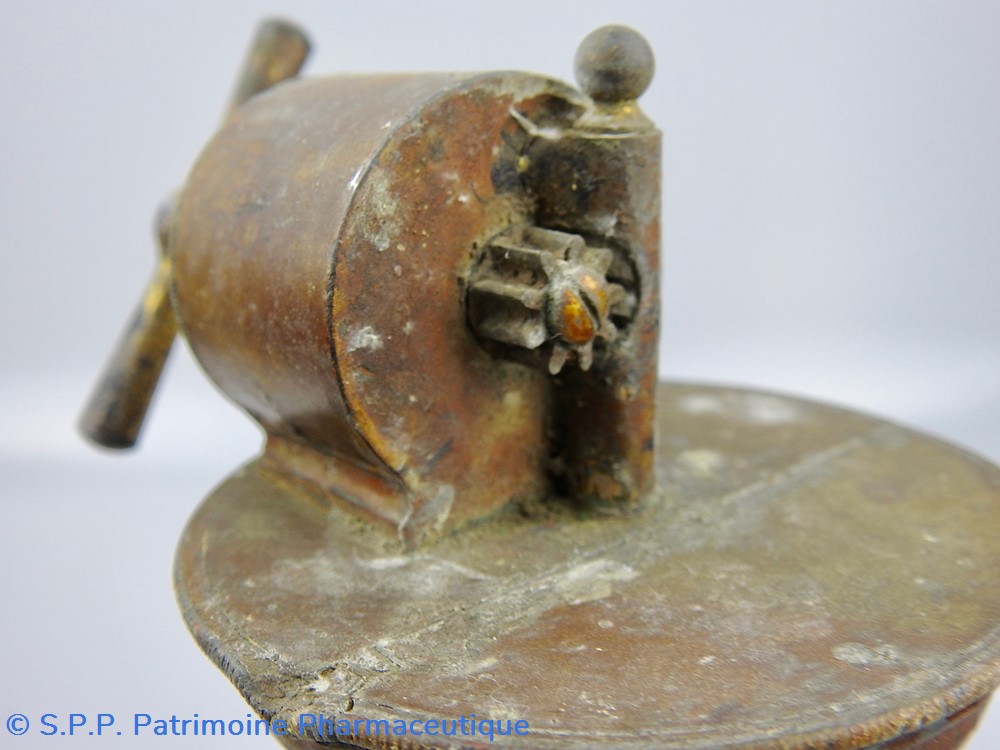 Hauteur totale, manivelle comprise : 23 cm Diamètre base et couvercle : 8,5 cm Diamètre du corps : 7 cm.