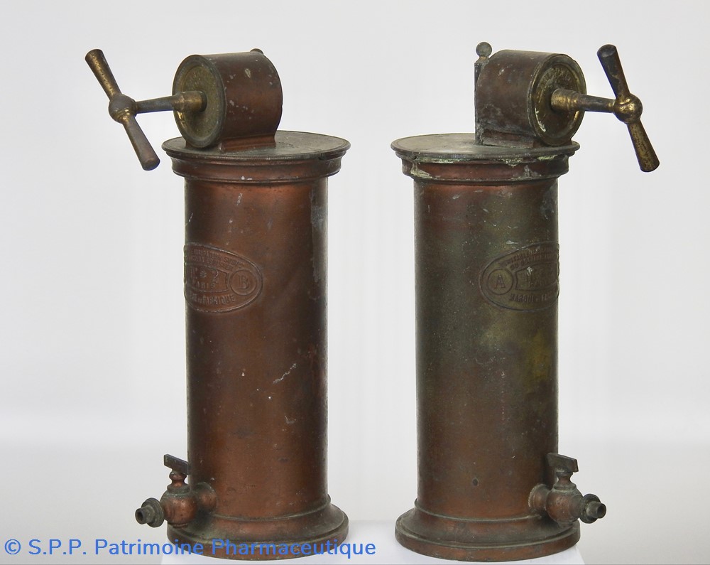 Ces deux irrigateurs ont un corps principal en étain bronzé surmonté d'une manivelle permettant de libérer un piston facilitant la poussée de liquide.