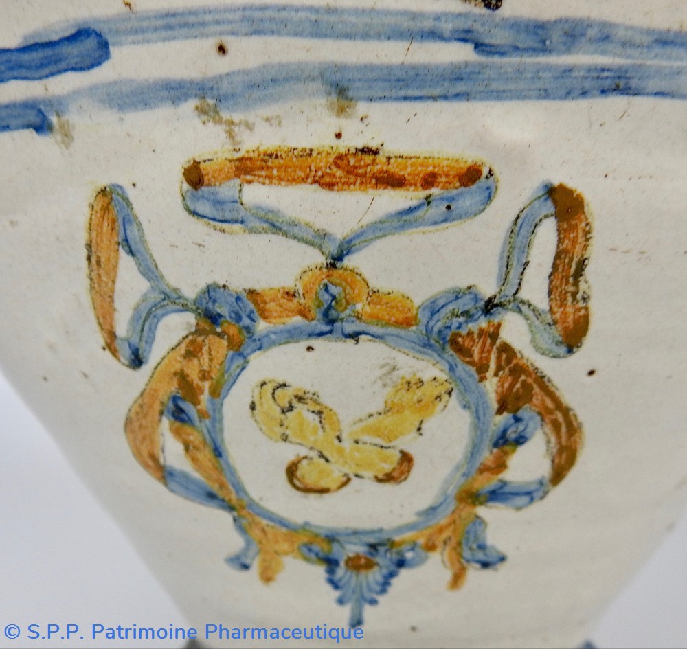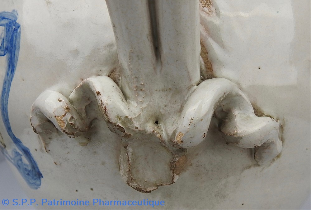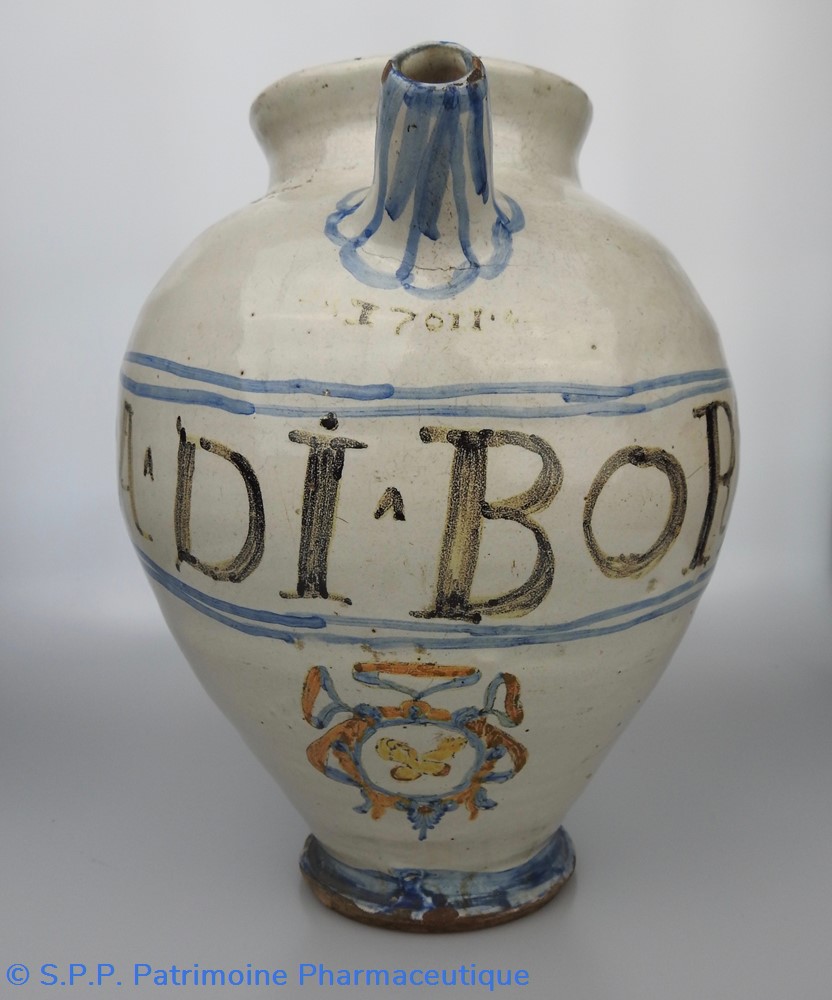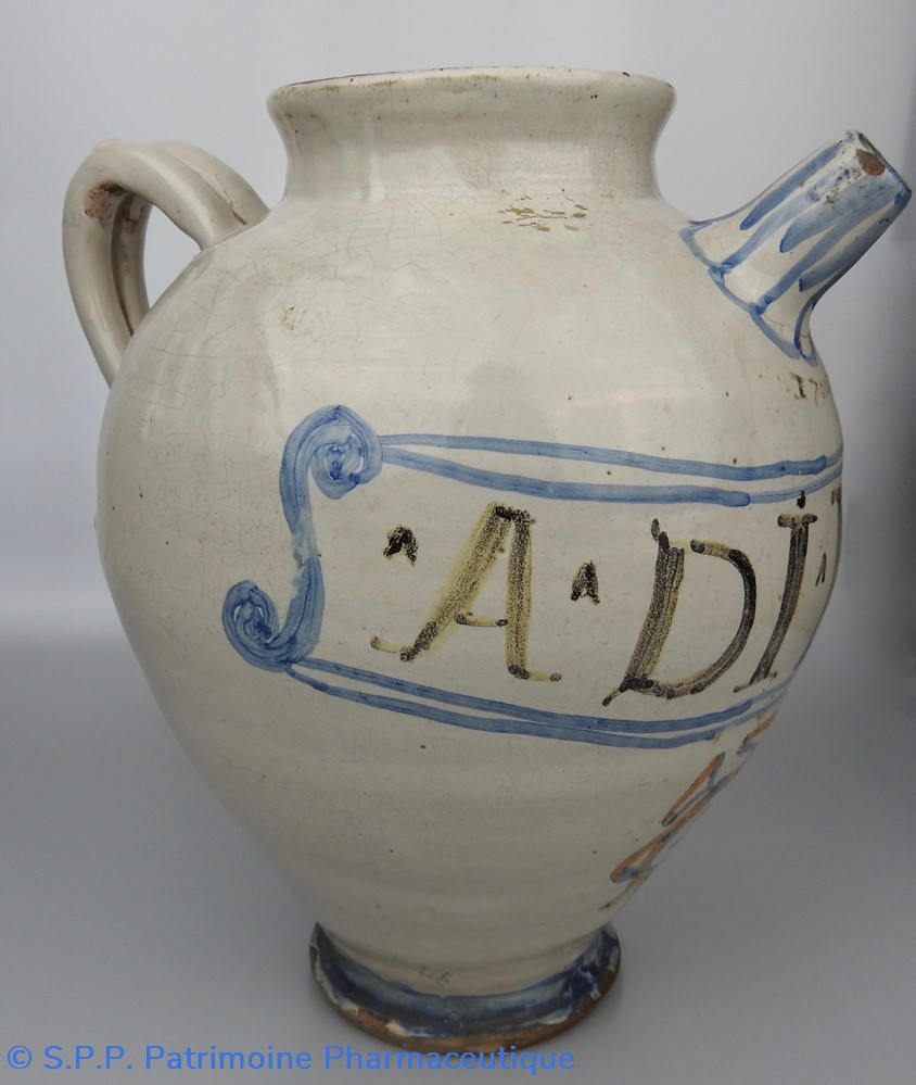 Grande chevrette de pharmacie datée 1701. Le vase repose sur un piédouche, présente une panse ronde dont la large ouverture était souvent fermée par du parchemin ou de la toile ou encore par un couvercle. Le bec verseur, orné de godrons bleus est comparable à la corne d'une chèvre d'où son nom L'anse étroite est rattachée au corps principal par des ornements pouvant rappeler des serpents. Un pseudo blason se trouve sous l'inscription :