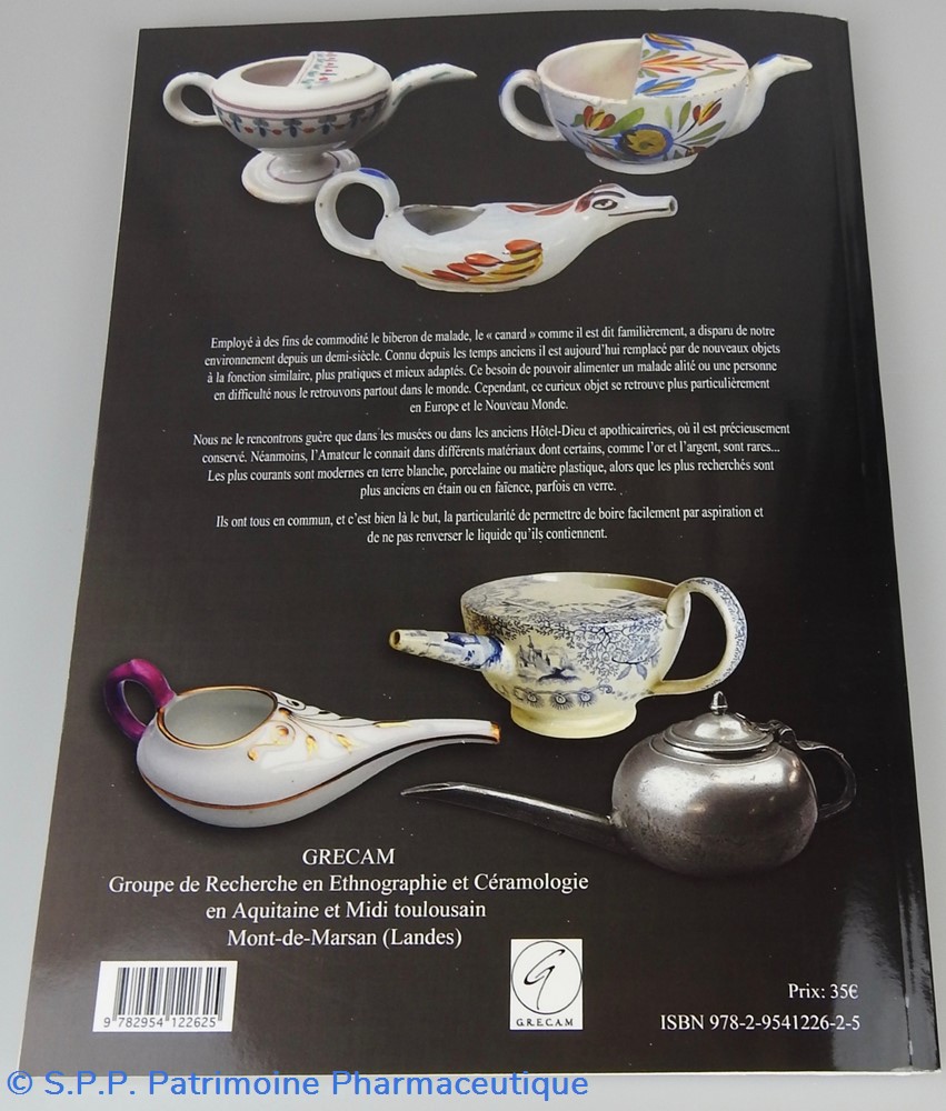C'est le manuel le plus complet que nous puissions trouver actuellement sur les Biberons ou tasses à malades. Il est l'oeuvre de Christian et Maïté BELOT et est édité par le Groupement de Recherche en Ethnographie et Céramologie en Aquitaine et Midi toulousain (GRECAM) sis à Mont de Marsan dans les Landes.