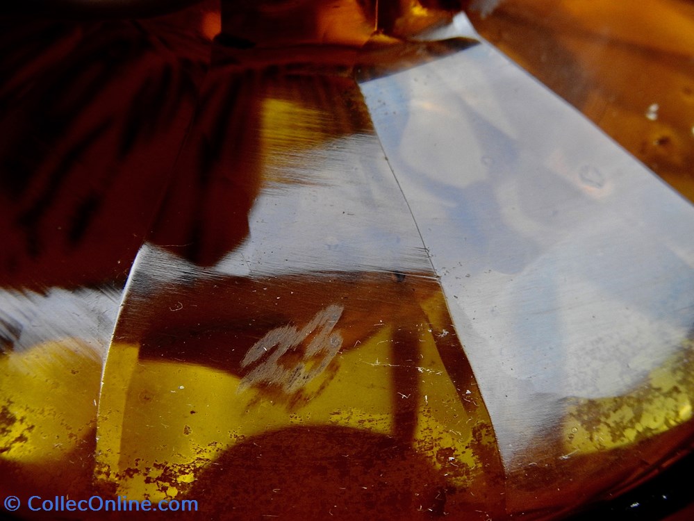 Le corps principal se termine vers le goulot en une collerette décagonale. Le sommet du bouchon est quant à lui taillé en diamant hexagonal. Fermeture à l'émeri. Un chiffre est gravé sur le bouchon : 23 et un autre sur la partie supérieure de la bouteille : 23.