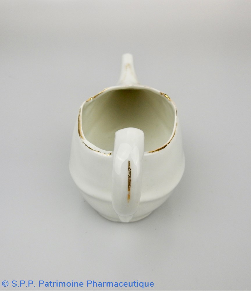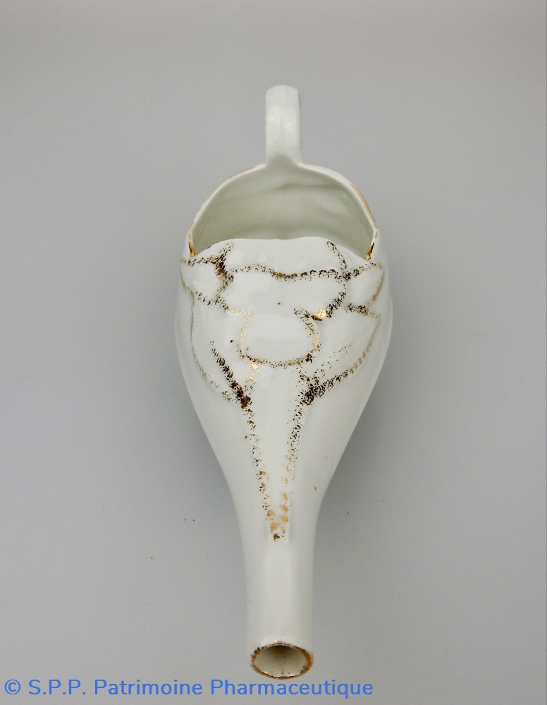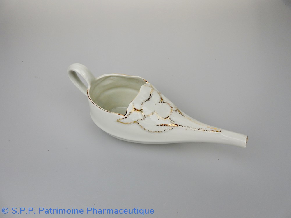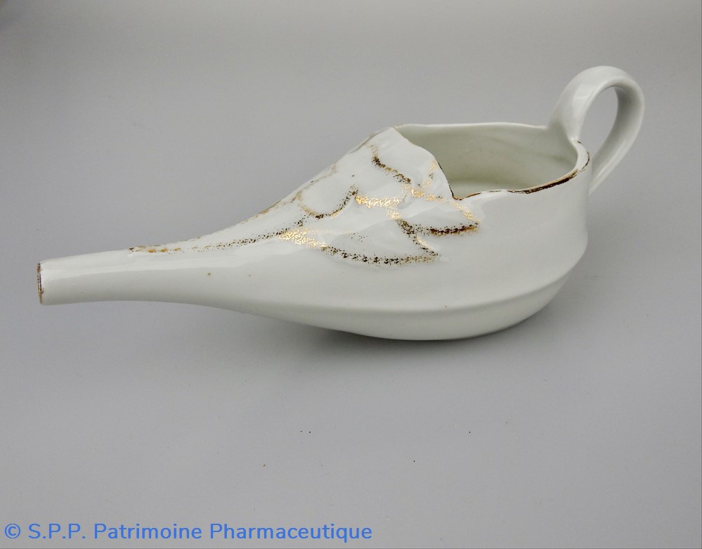 Biberon de malade ou Canard de malade ou tasse à malade. Cet objet en porcelaine blanche est rehaussé de filets d'or. Ceux-ci sont présents autour de l'ouverture principale et également à l'extrémité du bec. Un décor de fleur ou feuillage en relief est présent sur le devant de l'objet. Ce relief est souligné par un filet d'or.