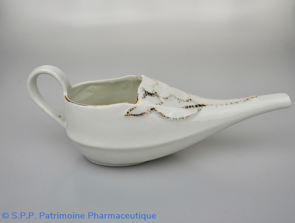 C'est un récipient à fond plat, dont l'ouverture est à moitié recouverte et qui est muni d'un long goulot étroit. Ce récipient permettait de donner plus facilement à boire au malade allongé qu'avec un gobelet ou un verre.