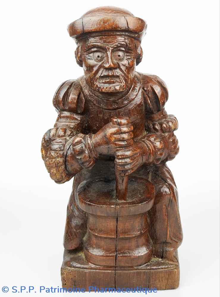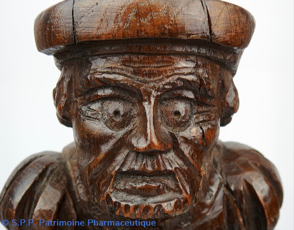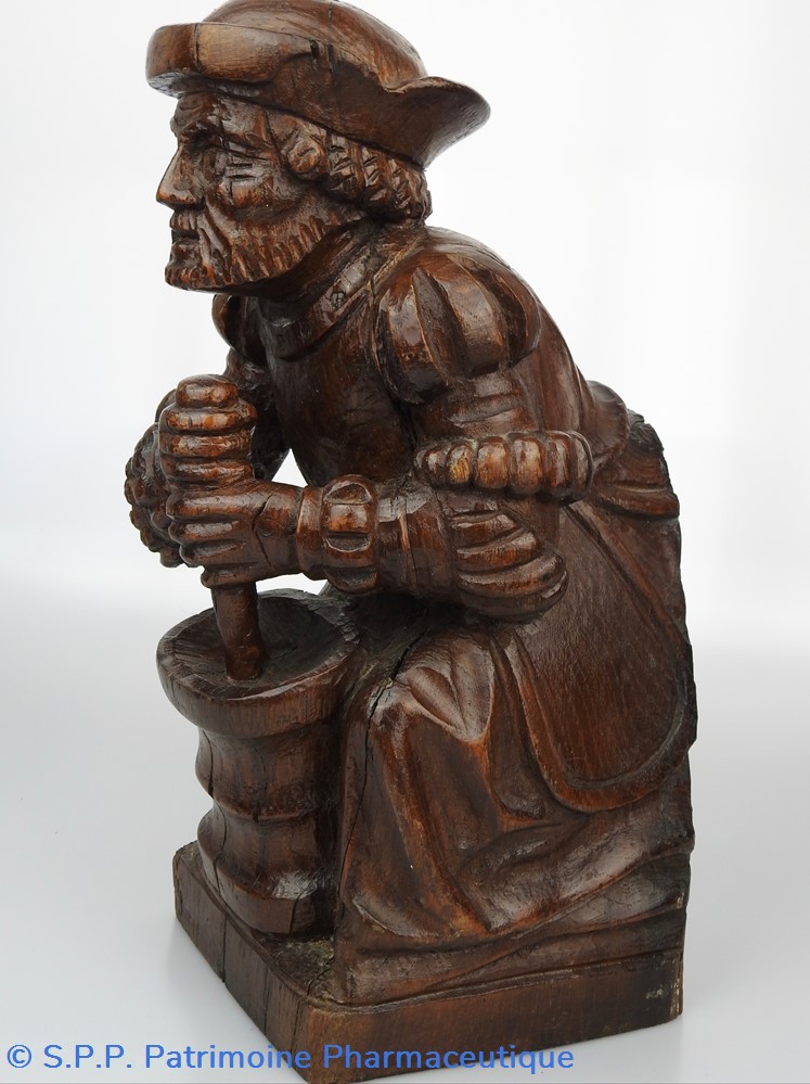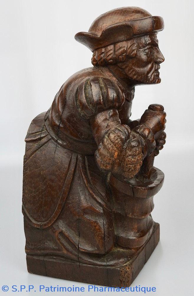 Réplique en chêne sculpté d'un apothicaire représenté sur une des stalles de la Cathédrale d'Amiens.