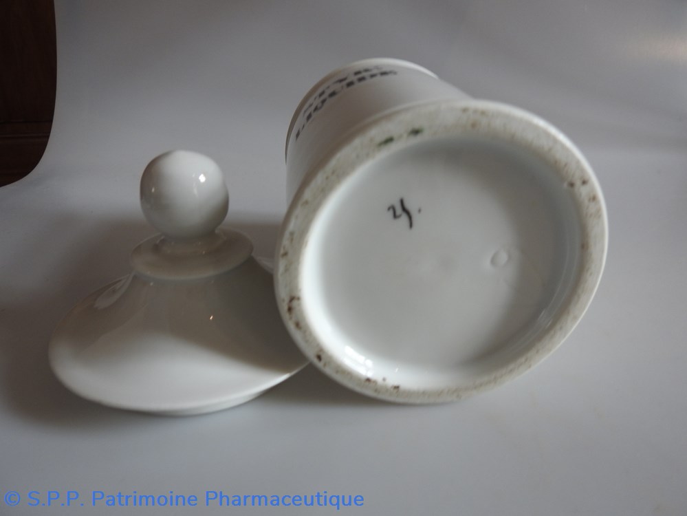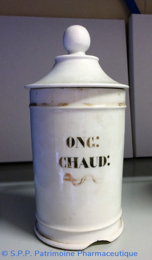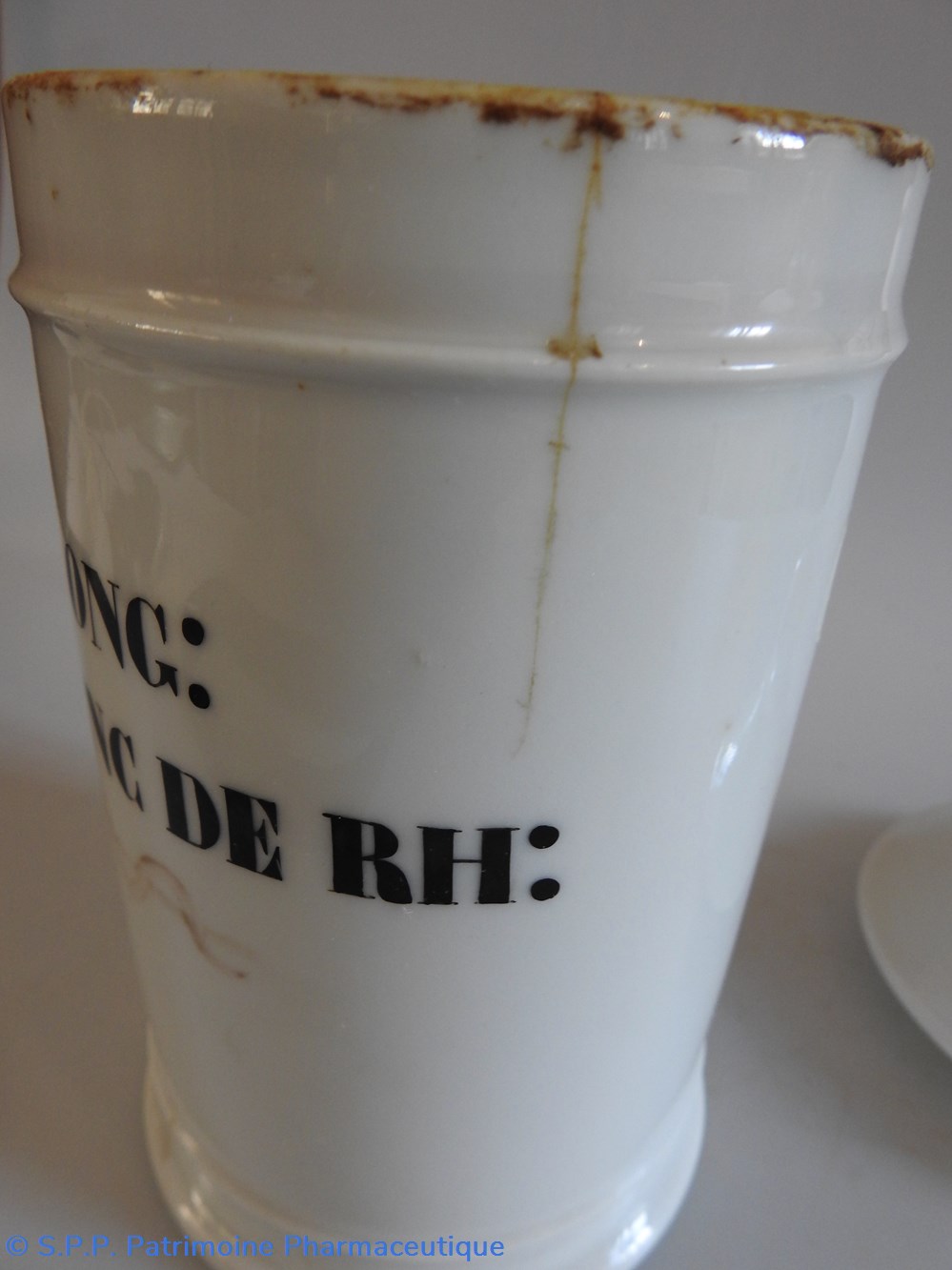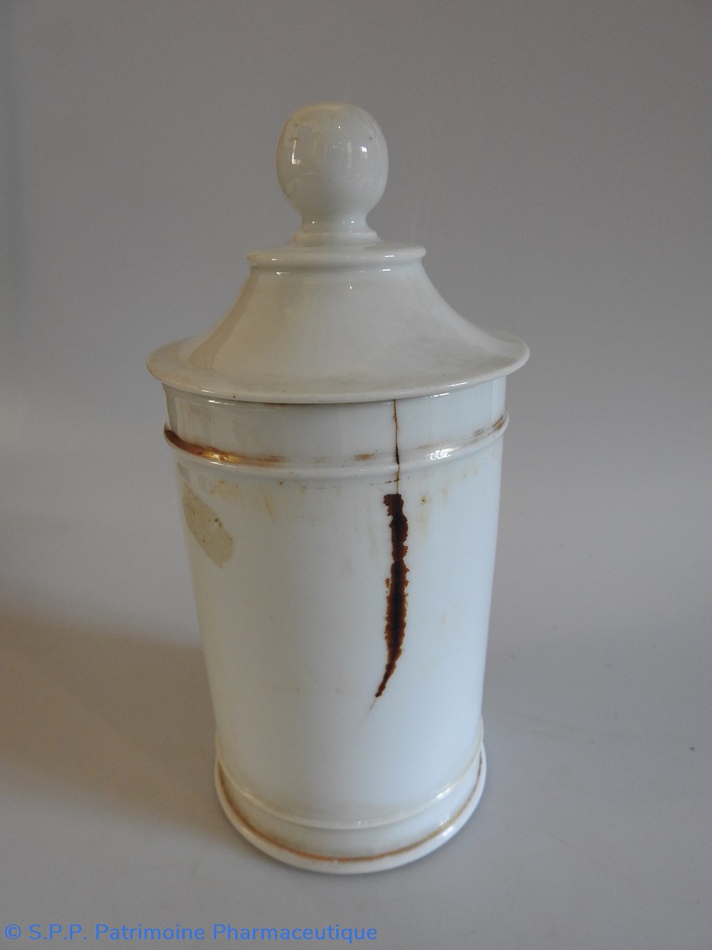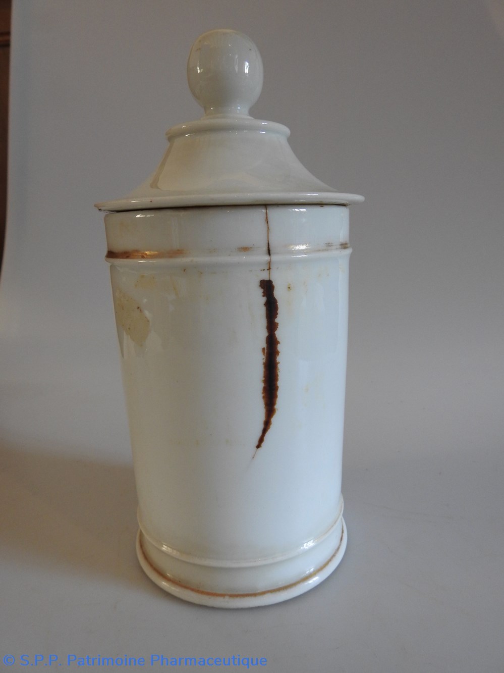 Pot de pharmacie d'une série de 24 pots en faïence blanche ayant pour seul ornement un filet en or sous le couvercle faisant le tour du pot et un serpent enroulé autour d'une branche également en or sous l'inscription en noir. Le couvercle est en pointe en forme de chapeau chinois et terminé par une prise en main légèrement ovoïde. La base est ébréchée