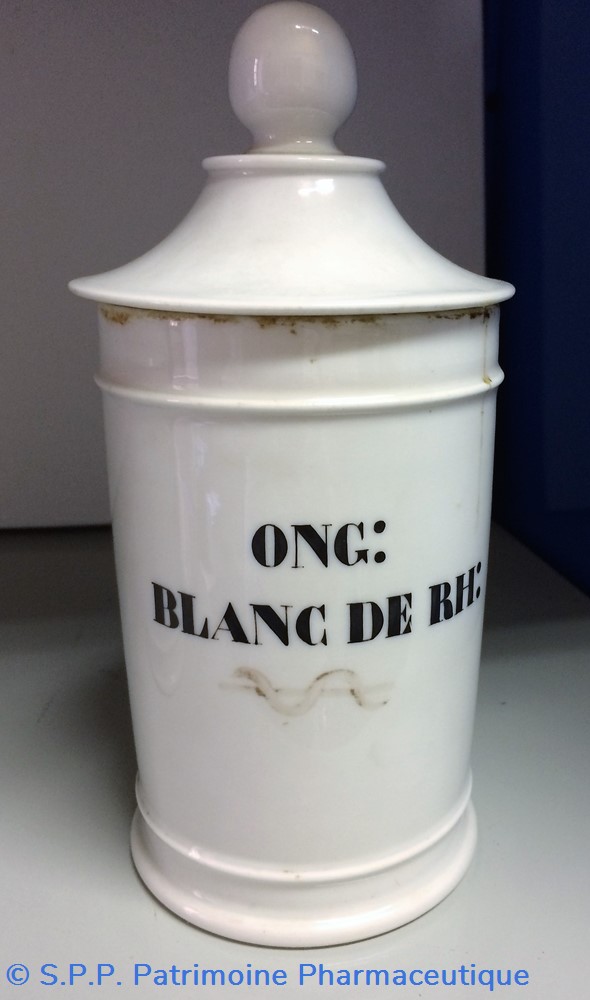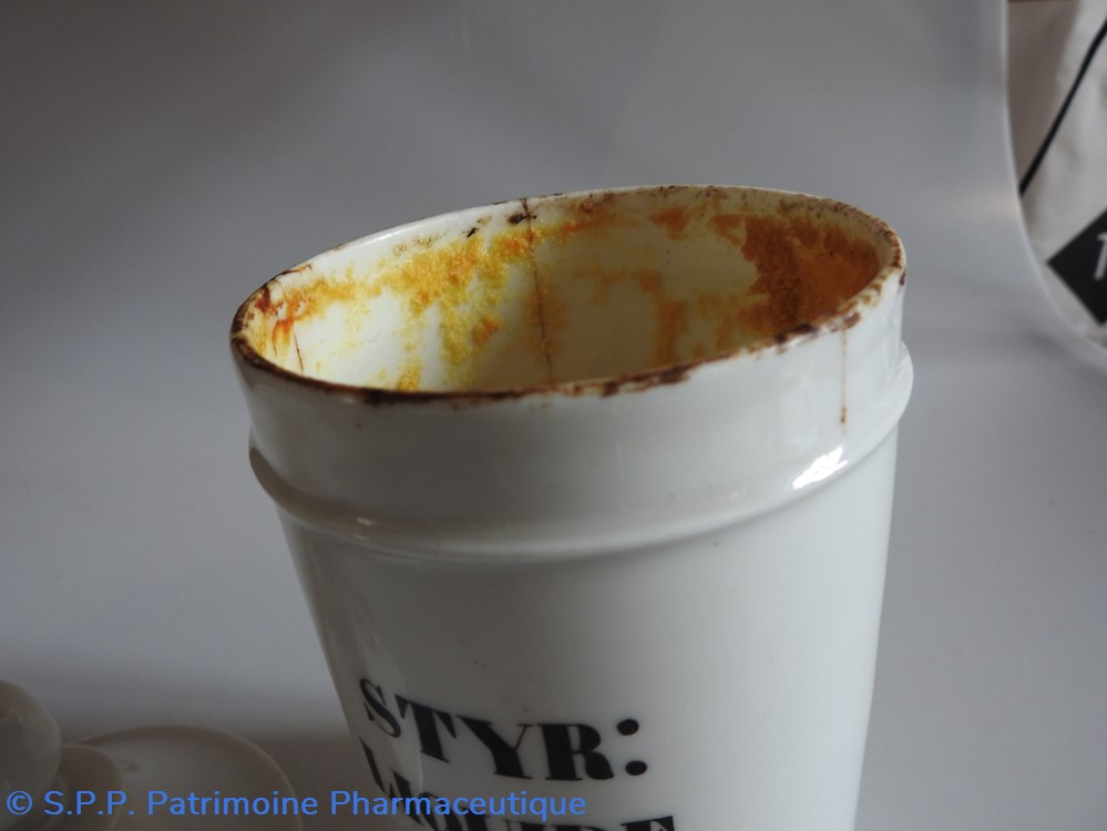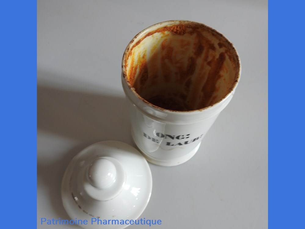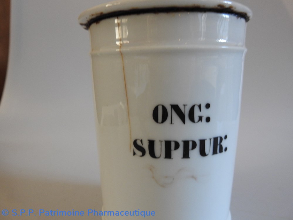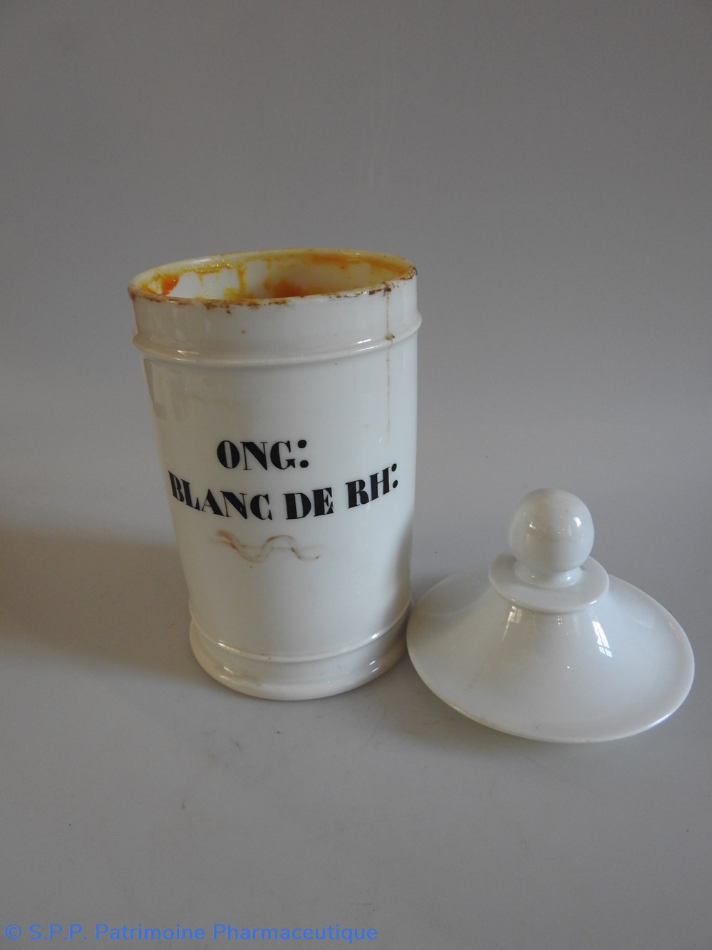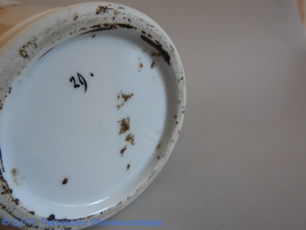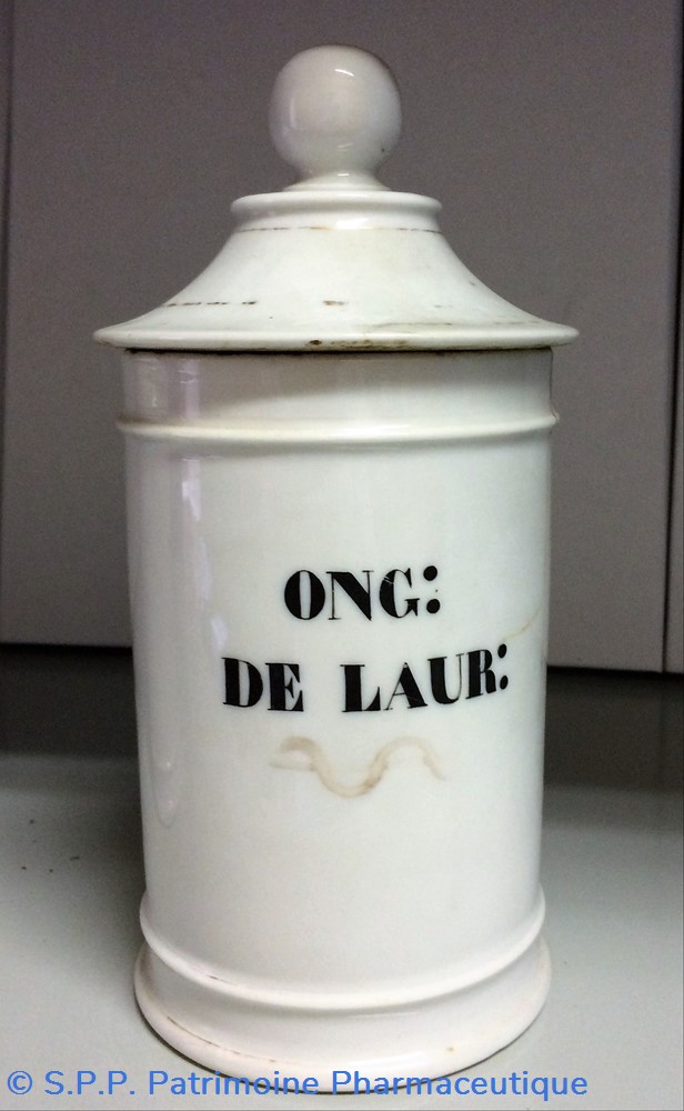 Pot de pharmacie d'une série de 24 pots en faïence blanche ayant pour seul ornement un filet en or sous le couvercle faisant le tour du pot et un serpent enroulé autour d'une branche également en or sous l'inscription en noir. Le couvercle est en pointe en forme de chapeau chinois et terminé par une prise en main légèrement ovoïde. La base est ébréchée