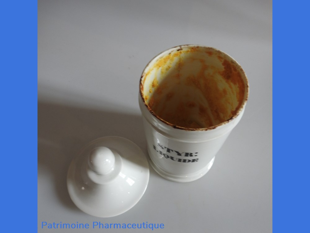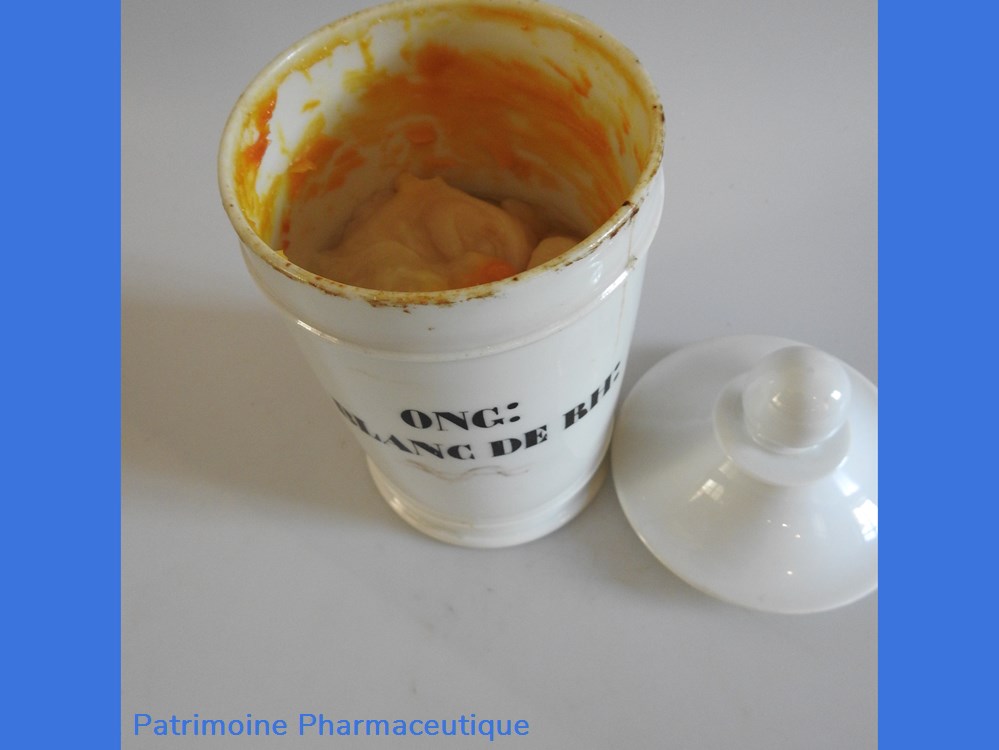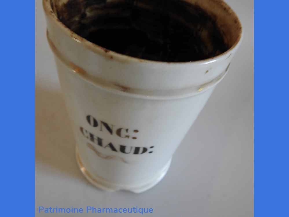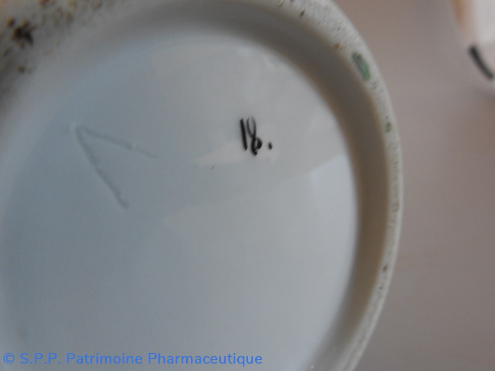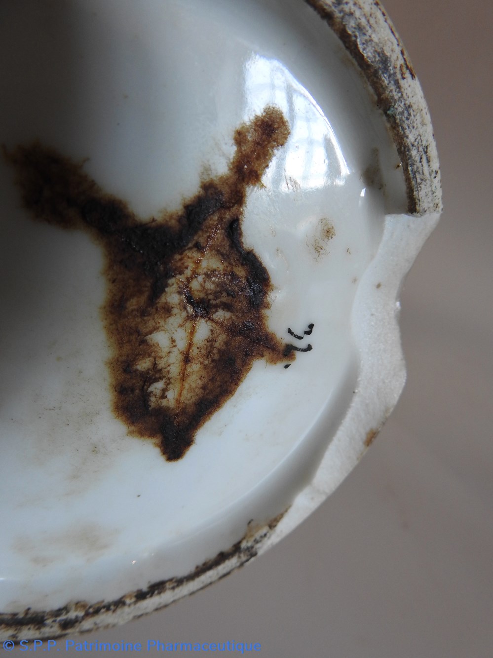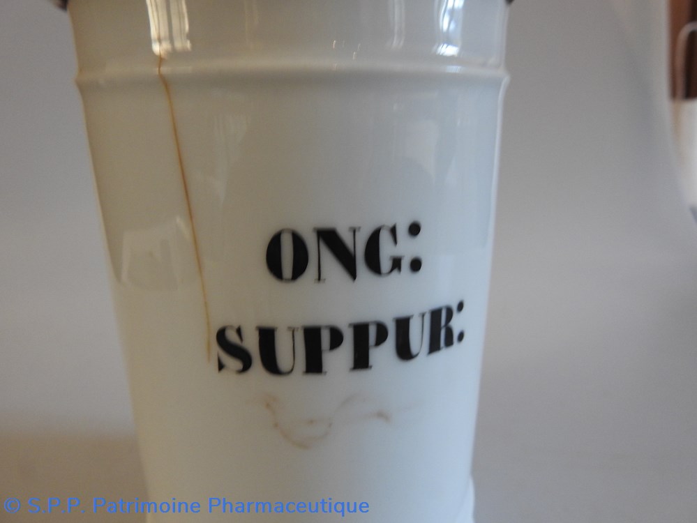 Pot de pharmacie d'une série de 24 pots en faïence blanche ayant pour seul ornement un filet en or sous le couvercle faisant le tour du pot et un serpent enroulé autour d'une branche également en or sous l'inscription en noir. Le couvercle est en pointe en forme de chapeau chinois et terminé par une prise en main légèrement ovoïde. La base est ébréchée