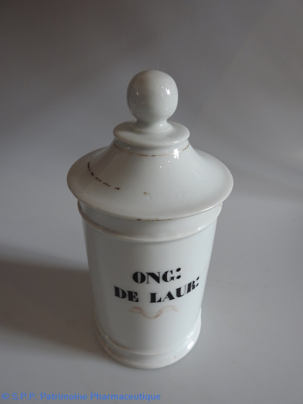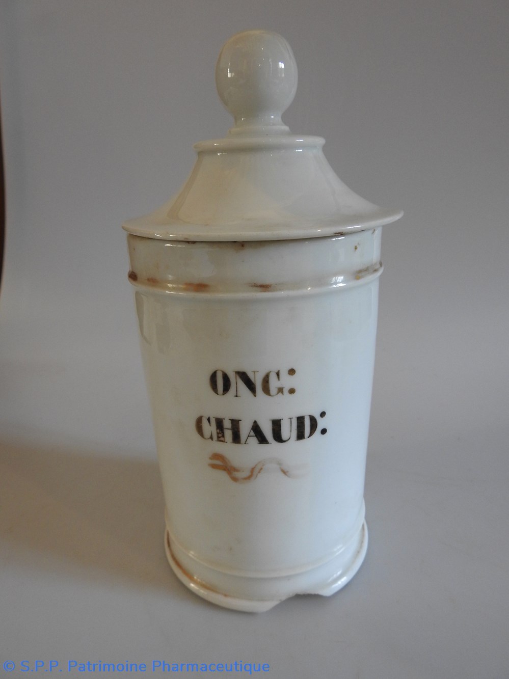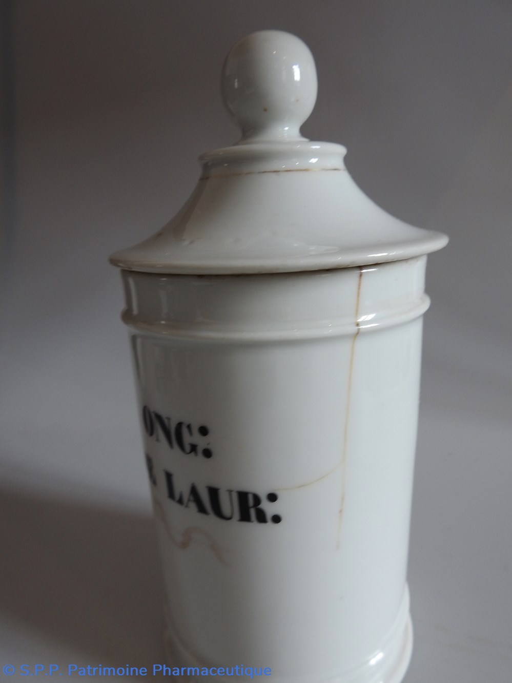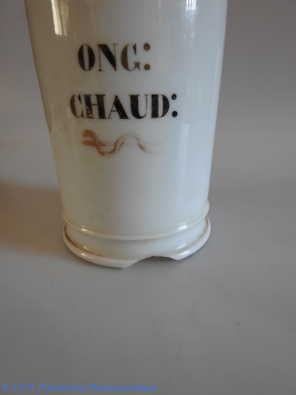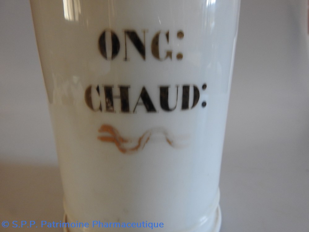 Pot de pharmacie d'une série de 24 pots en faïence blanche ayant pour seul ornement un filet en or sous le couvercle faisant le tour du pot et un serpent enroulé autour d'une branche également en or sous l'inscription en noir. Le couvercle est en pointe en forme de chapeau chinois et terminé par une prise en main légèrement ovoïde. Fêlure sur le corps
