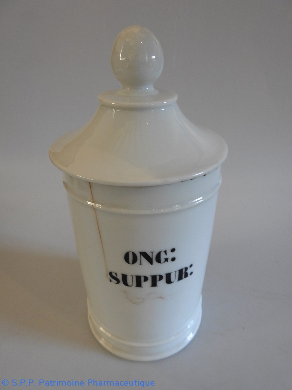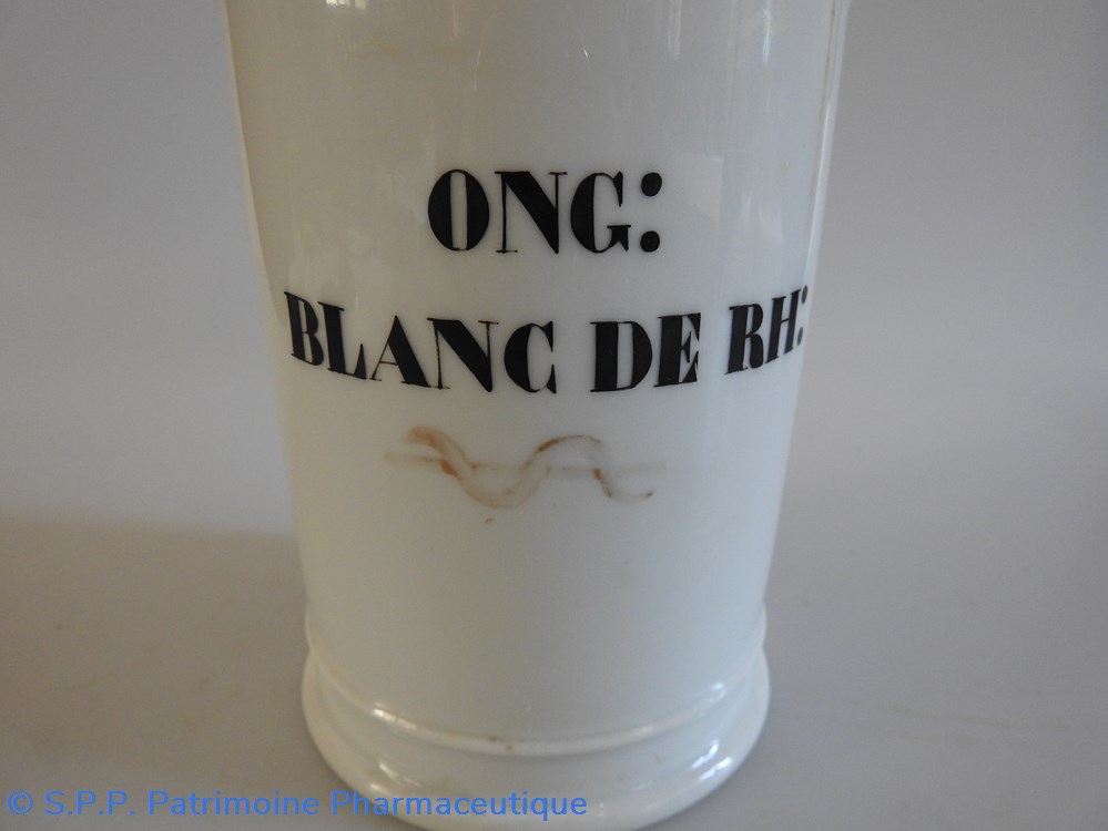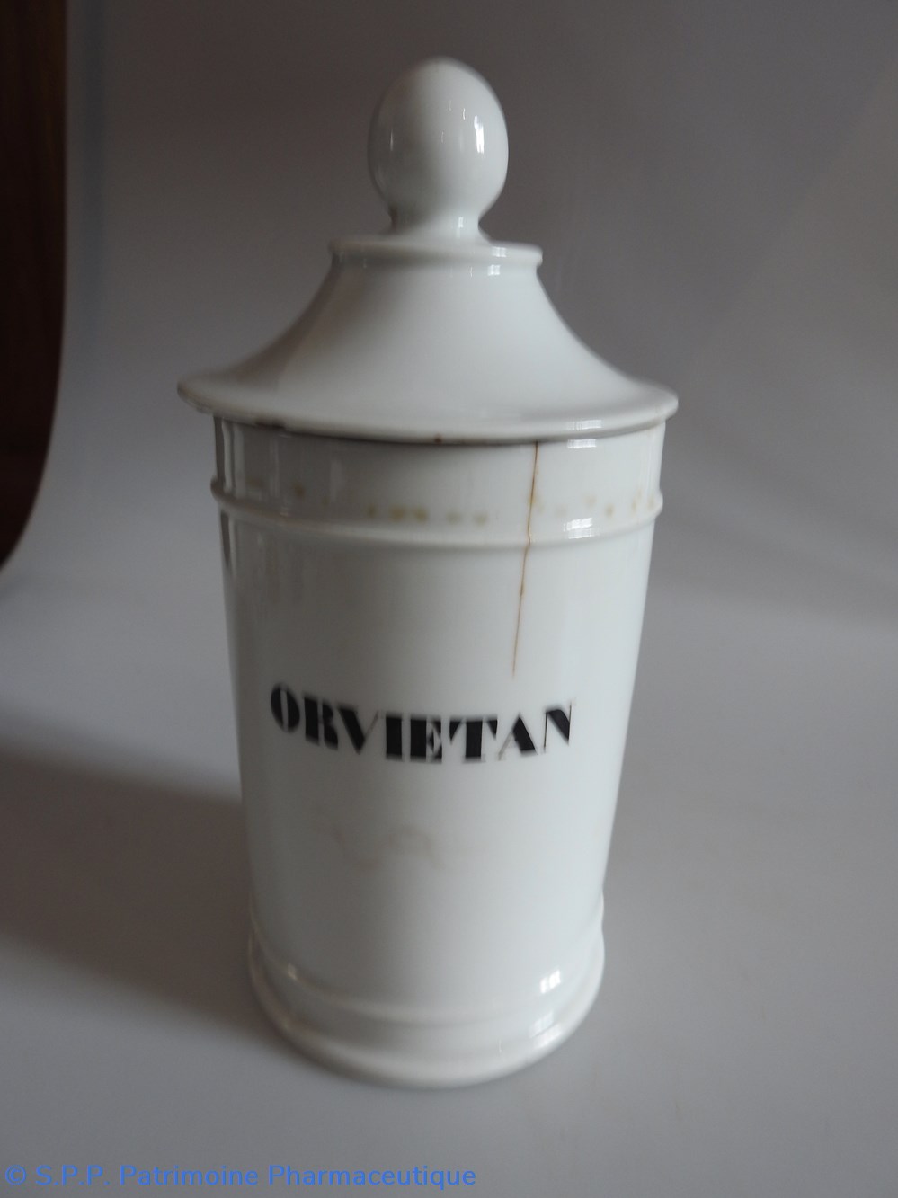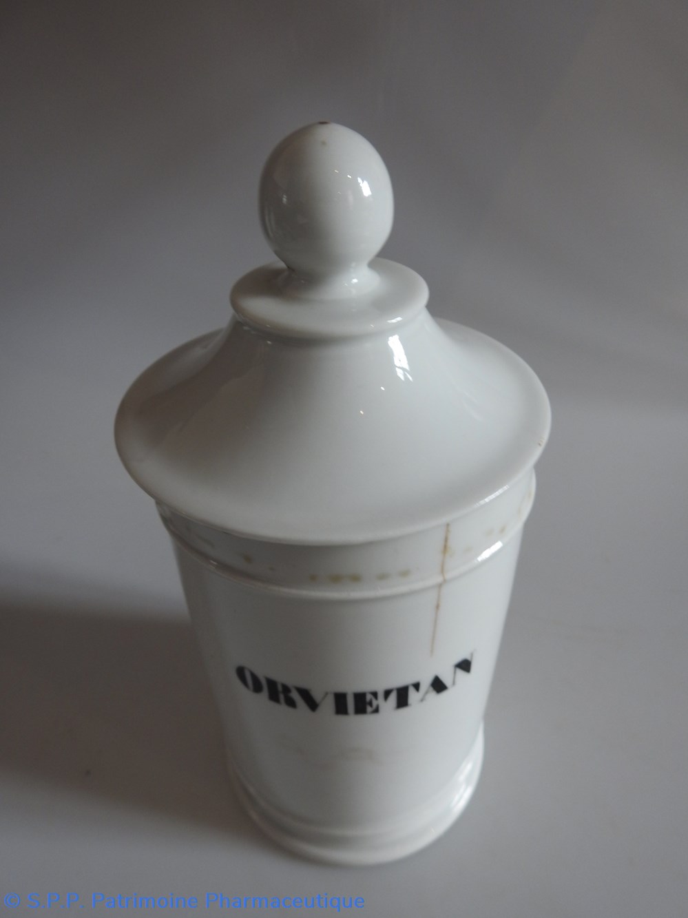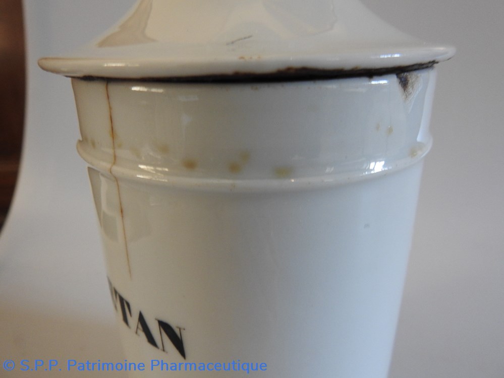 Pot de pharmacie d'une série de 24 pots en faïence blanche ayant pour seul ornement un filet en or sous le couvercle faisant le tour du pot et un serpent enroulé autour d'une branche également en or sous l'inscription en noir. Le couvercle est en pointe en forme de chapeau chinois et terminé par une prise en main légèrement ovoïde. Fêlure sur le corps