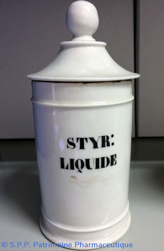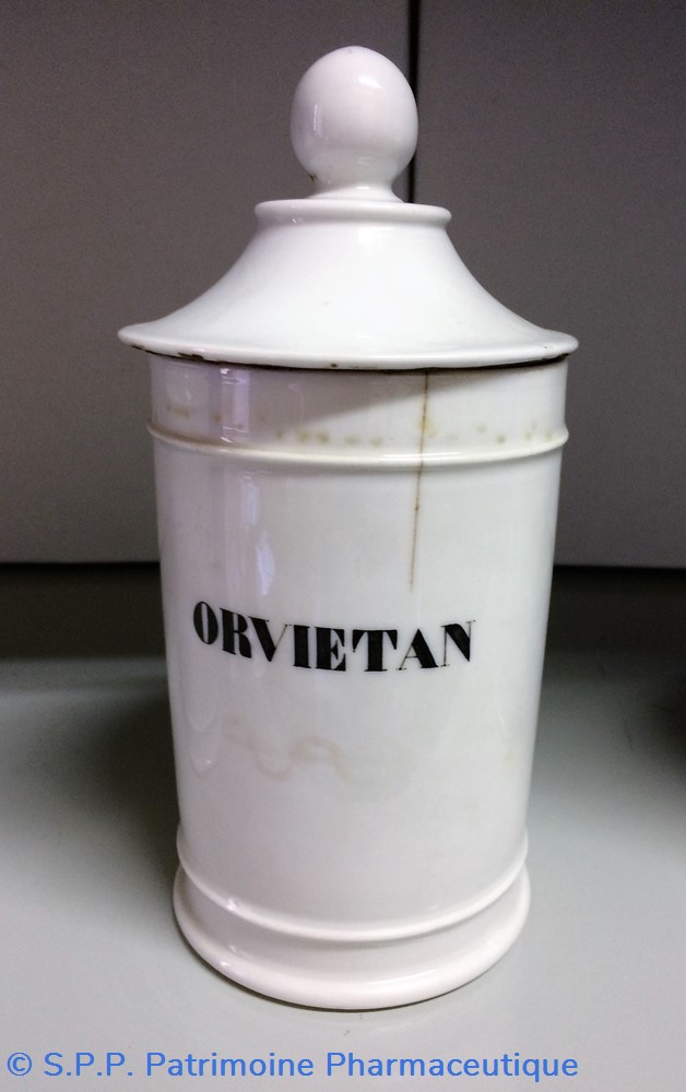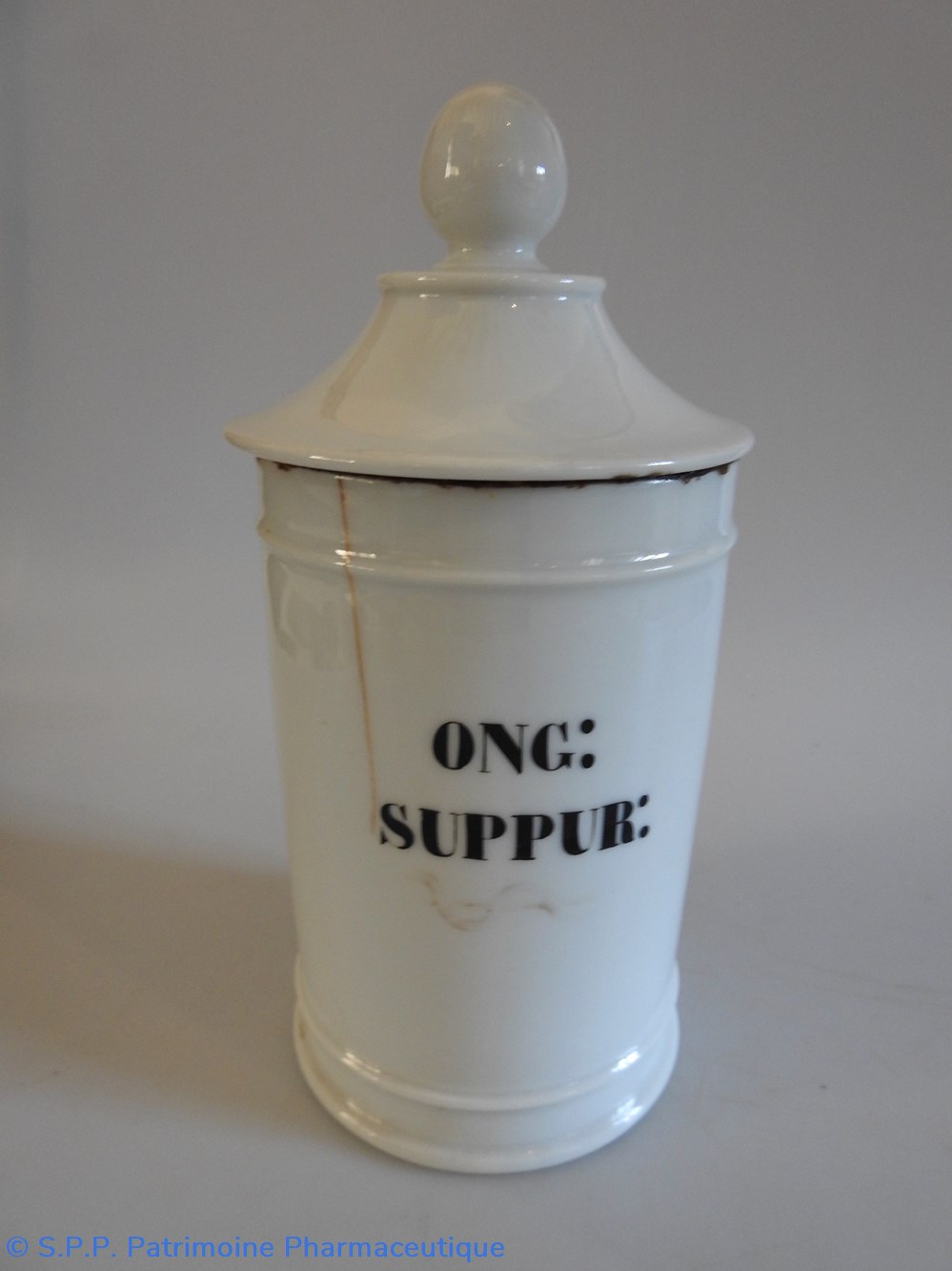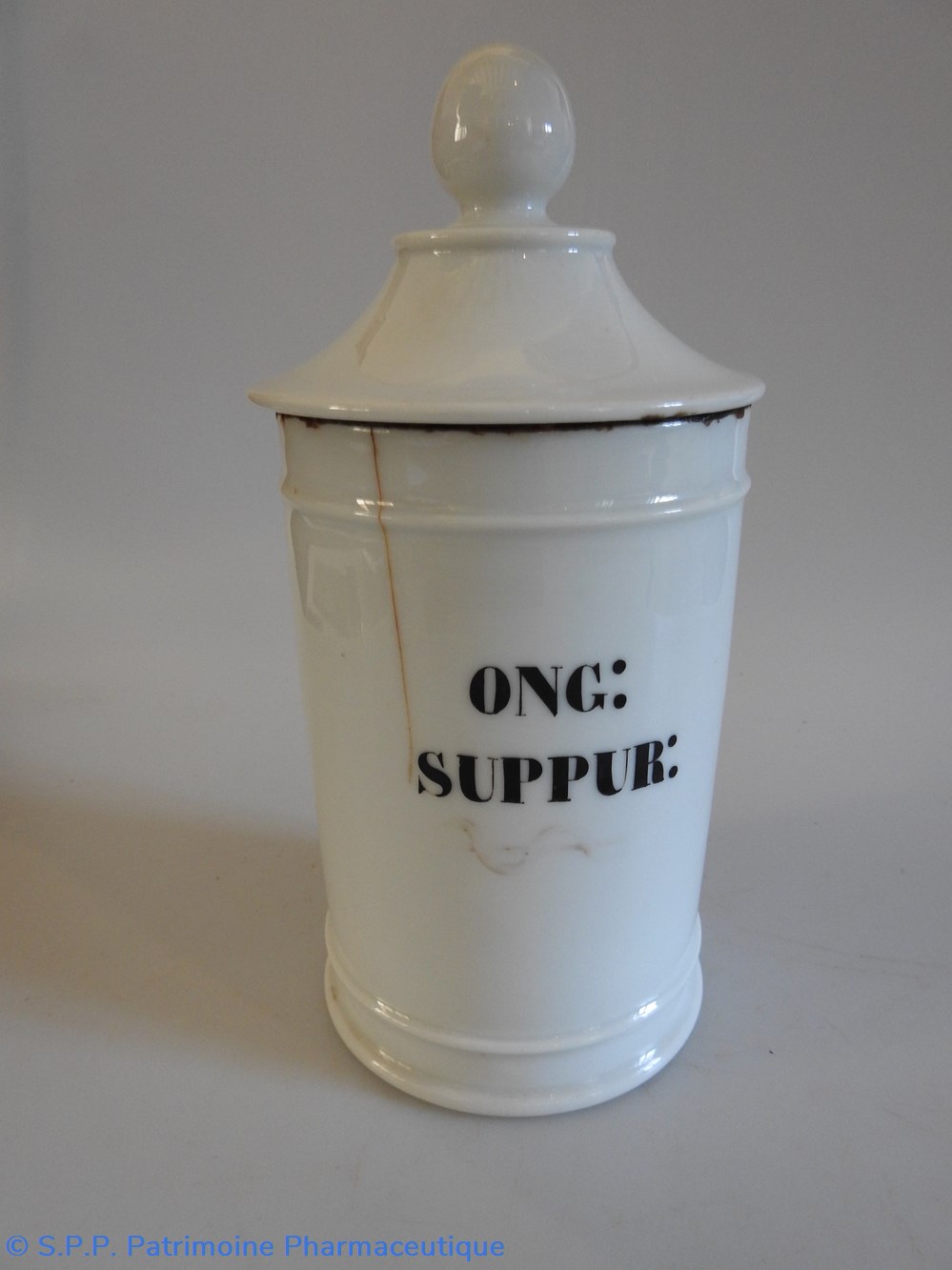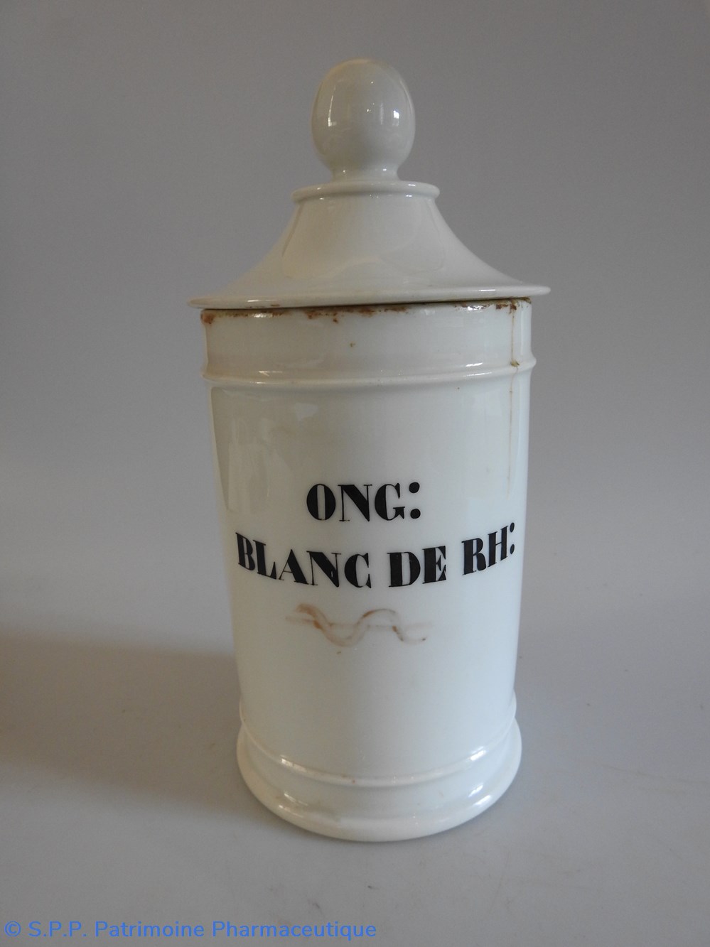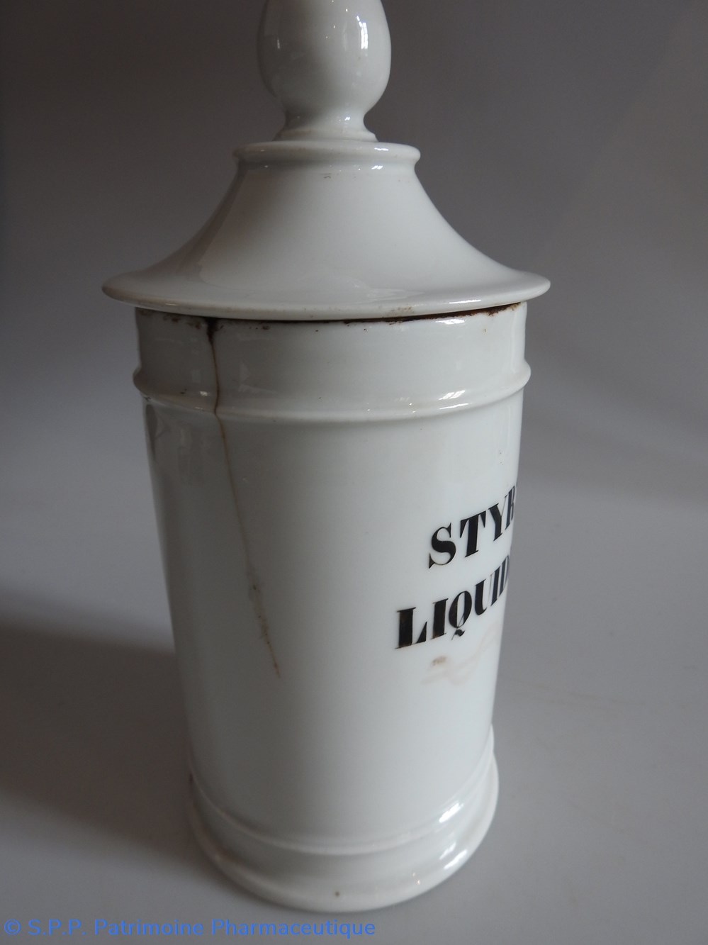 Pot de pharmacie d'une série de 24 pots en faïence blanche ayant pour seul ornement un filet en or sous le couvercle faisant le tour du pot et un serpent enroulé autour d'une branche également en or sous l'inscription en noir. Le couvercle est en pointe en forme de chapeau chinois et terminé par une prise en main légèrement ovoïde. Fêlure sur le corps