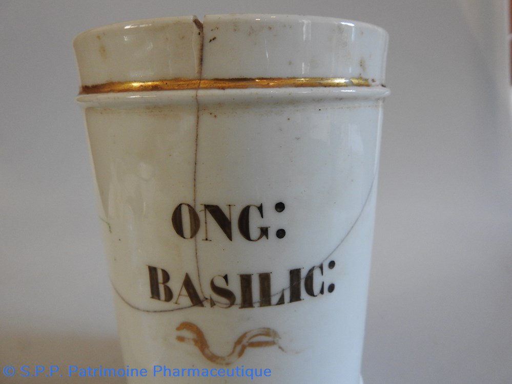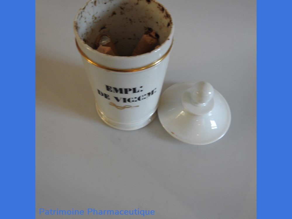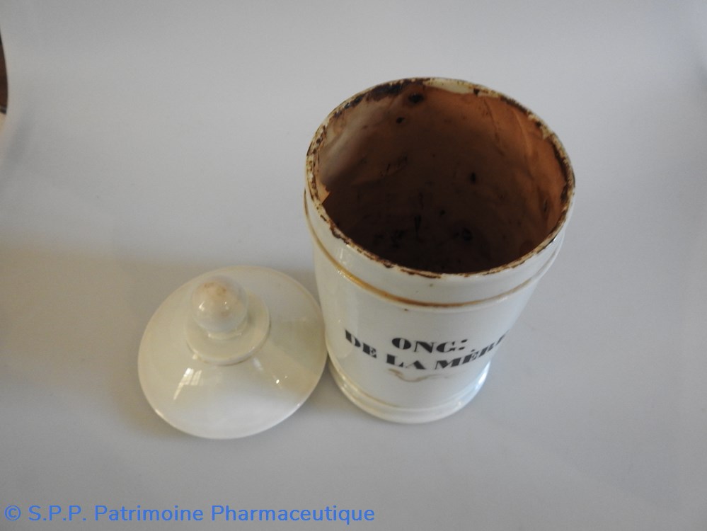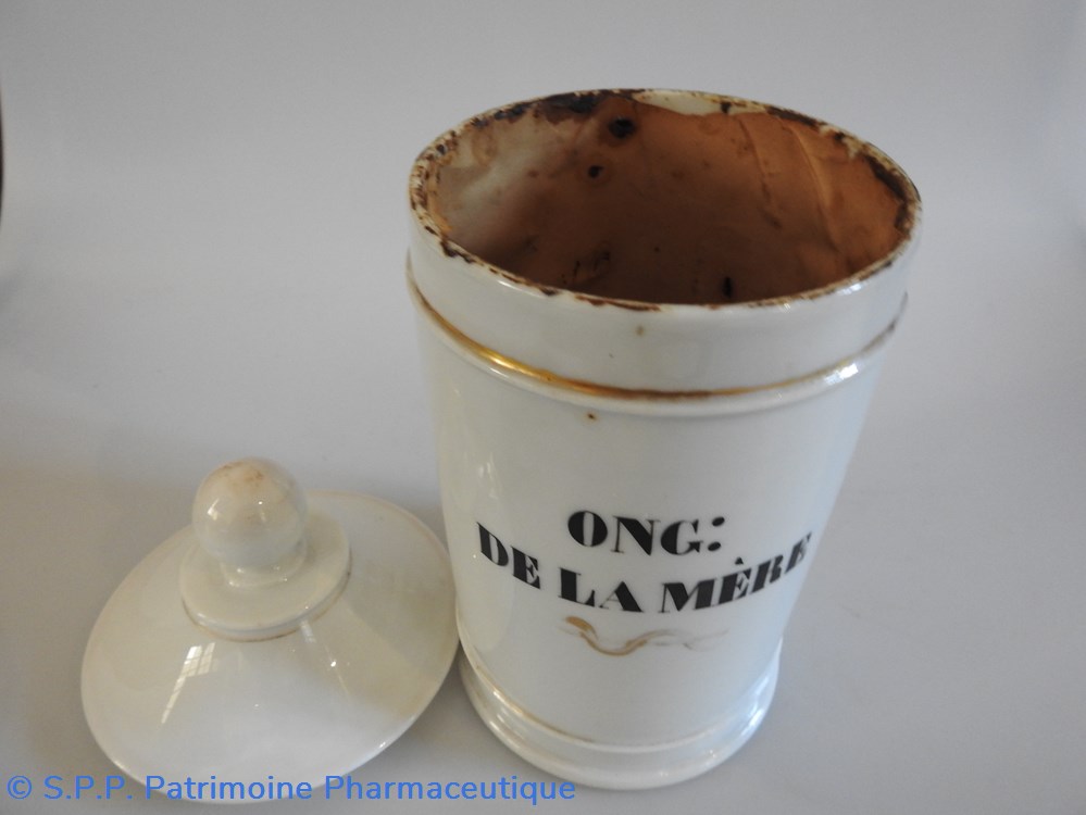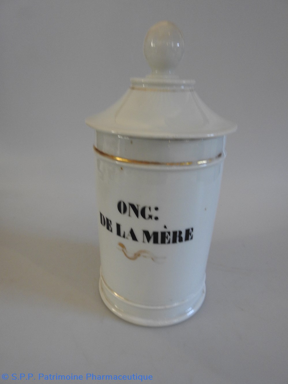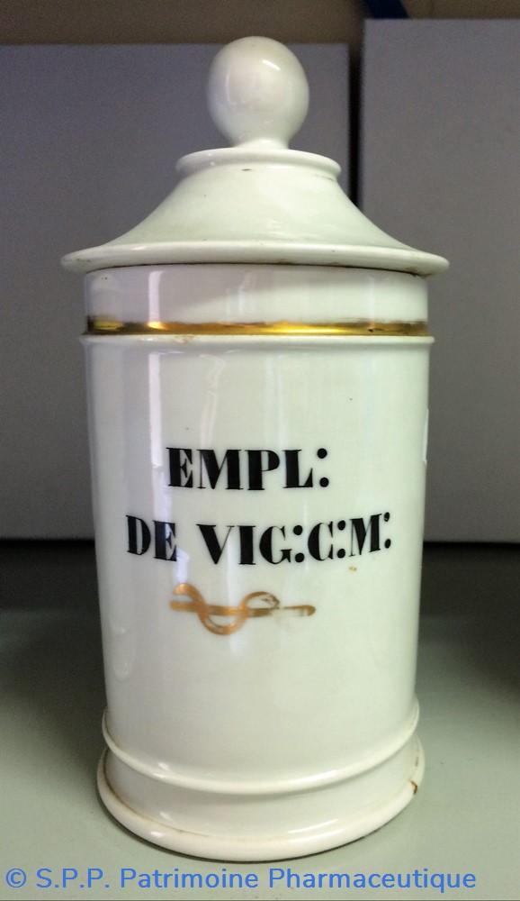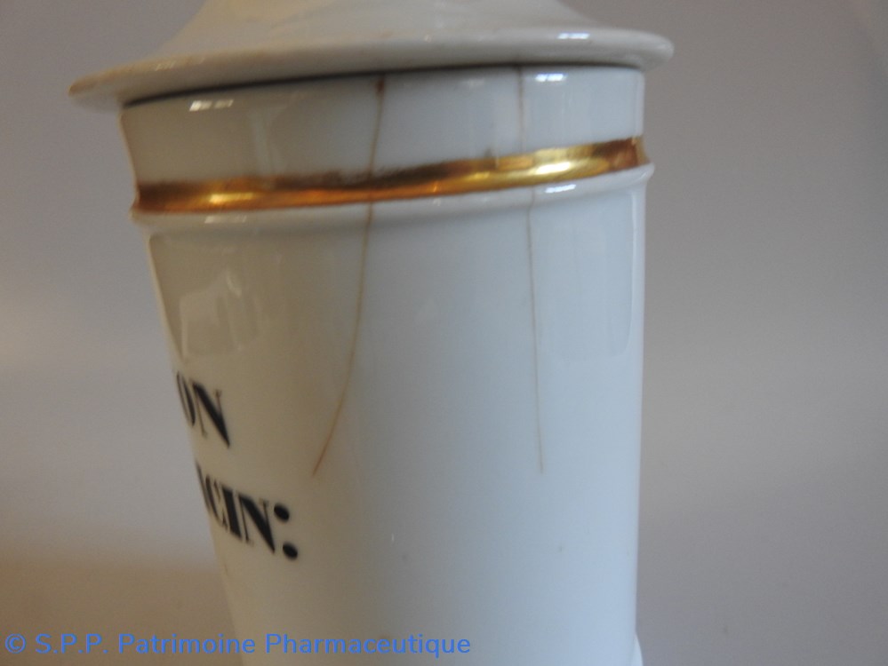 Pot de pharmacie d'une série de 24 pots en faïence blanche ayant pour seul ornement un filet en or sous le couvercle faisant le tour du pot et un serpent enroulé autour d'une branche également en or sous l'inscription en noir. Le couvercle est en pointe en forme de chapeau chinois et terminé par une prise en main légèrement ovoïde. Nombreuses fêlures.