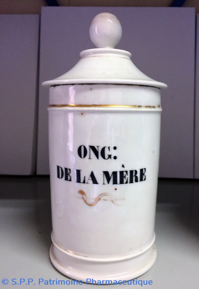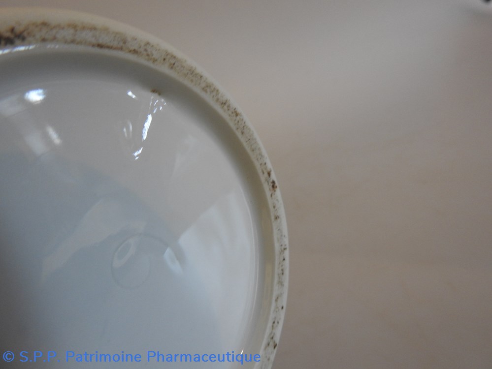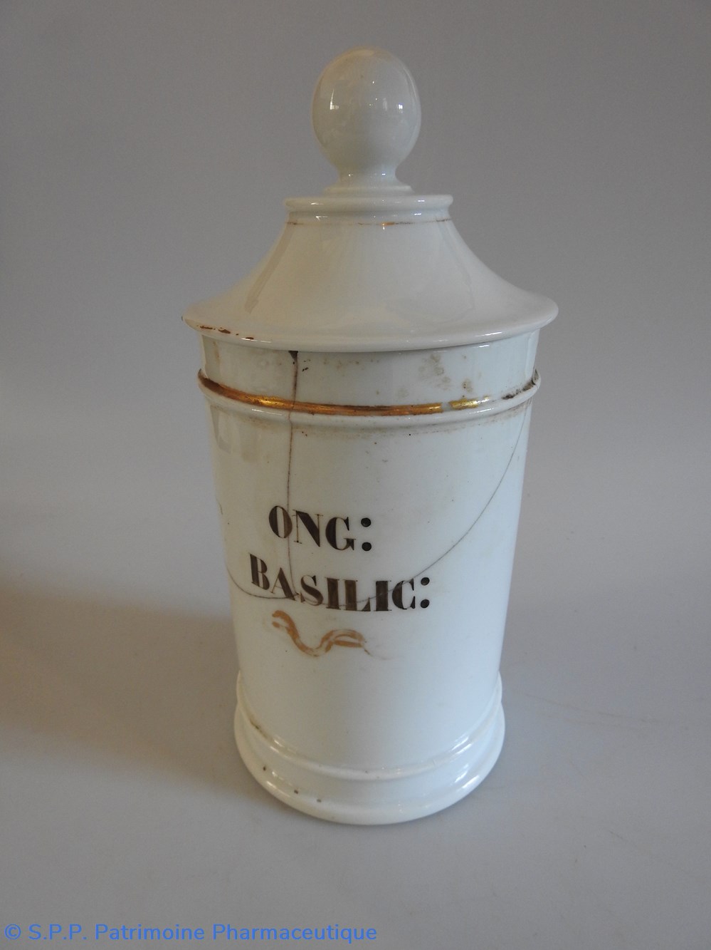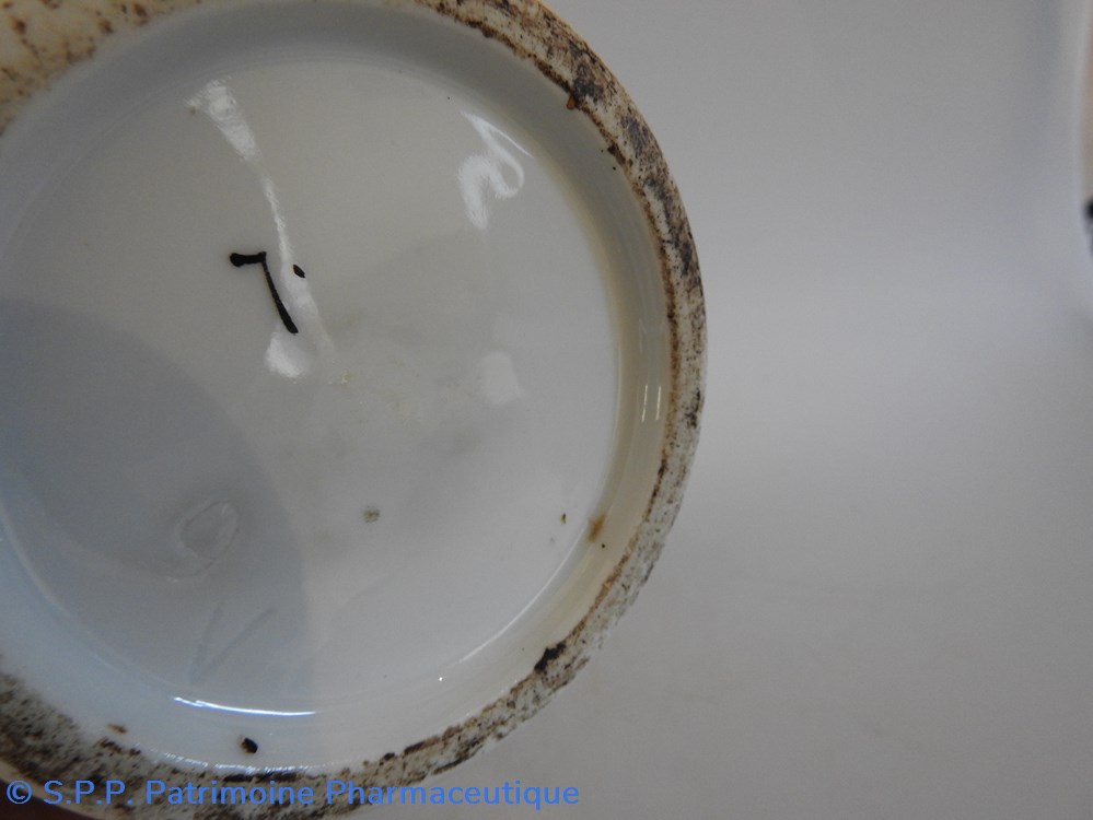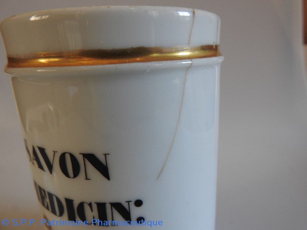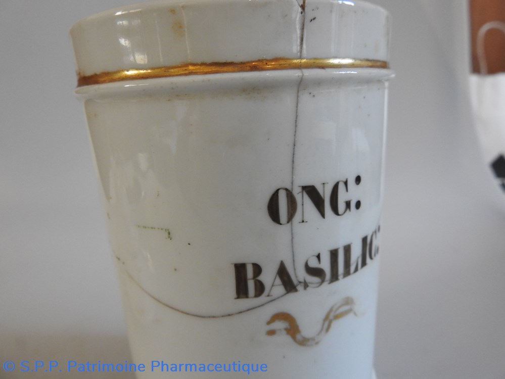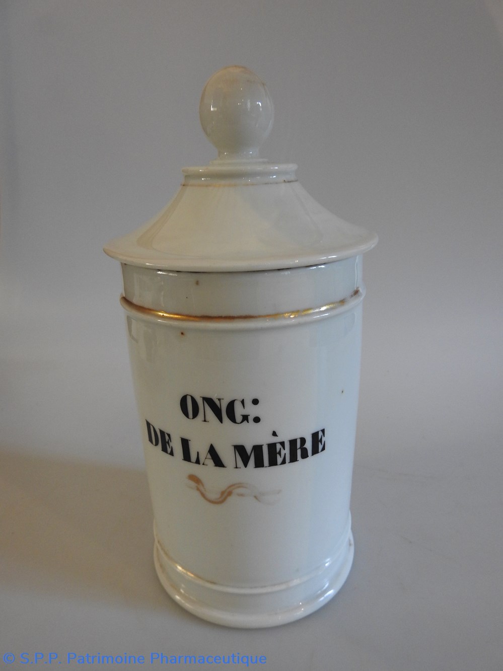 Pot de pharmacie d'une série de 24 pots en faïence blanche ayant pour seul ornement un filet en or sous le couvercle faisant le tour du pot et un serpent enroulé autour d'une branche également en or sous l'inscription en noir. Le couvercle est en pointe en forme de chapeau chinois et terminé par une prise en main légèrement ovoïde. Nombreuses fêlures.