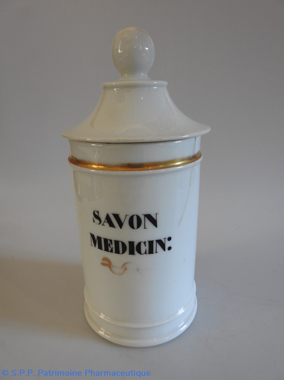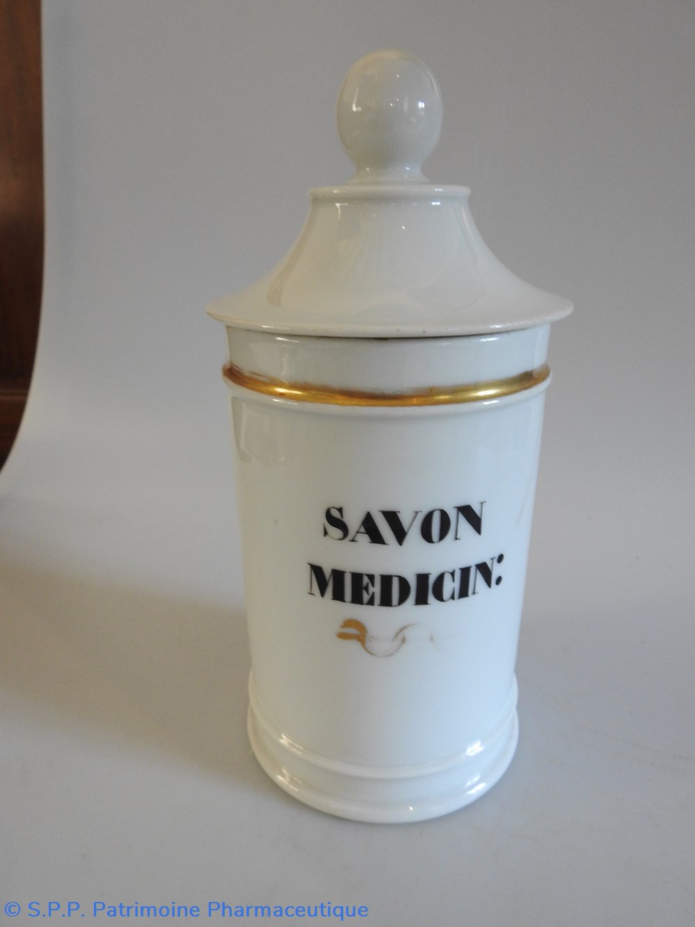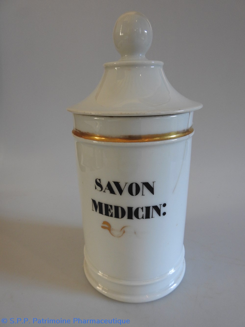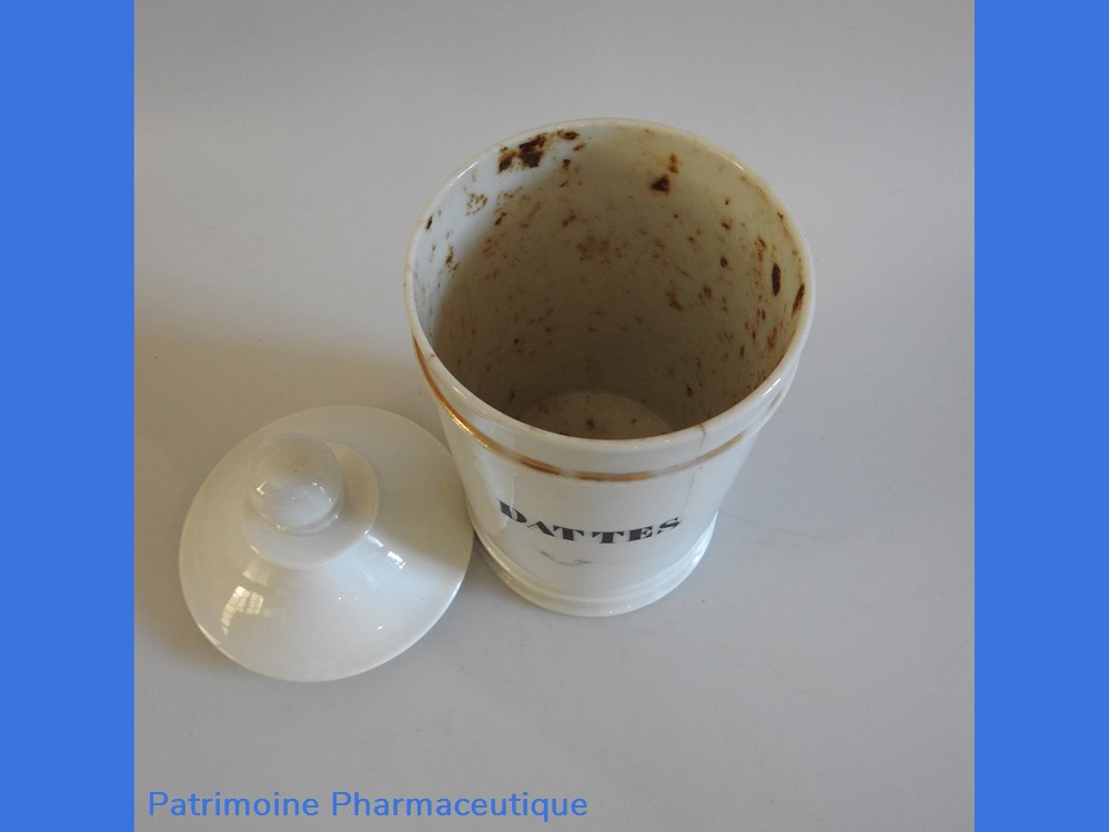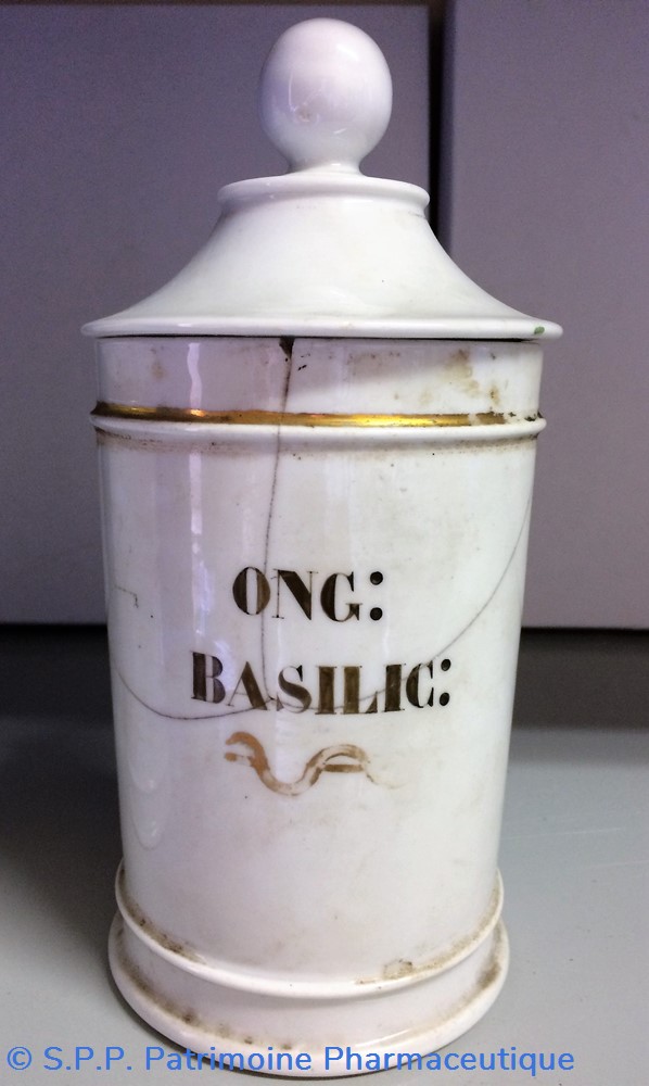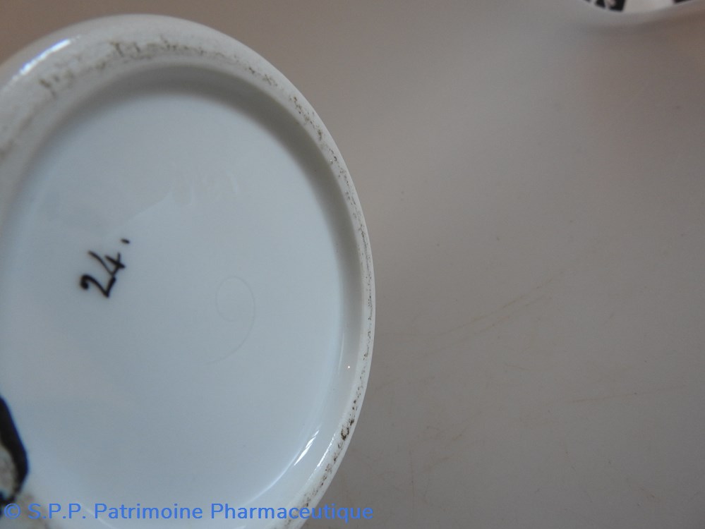 Pot de pharmacie d'une série de 24 pots en faïence blanche ayant pour seul ornement un filet en or sous le couvercle faisant le tour du pot et un serpent enroulé autour d'une branche également en or sous l'inscription en noir. Le couvercle est en pointe en forme de chapeau chinois et terminé par une prise en main légèrement ovoïde. Nombreuses fêlures.