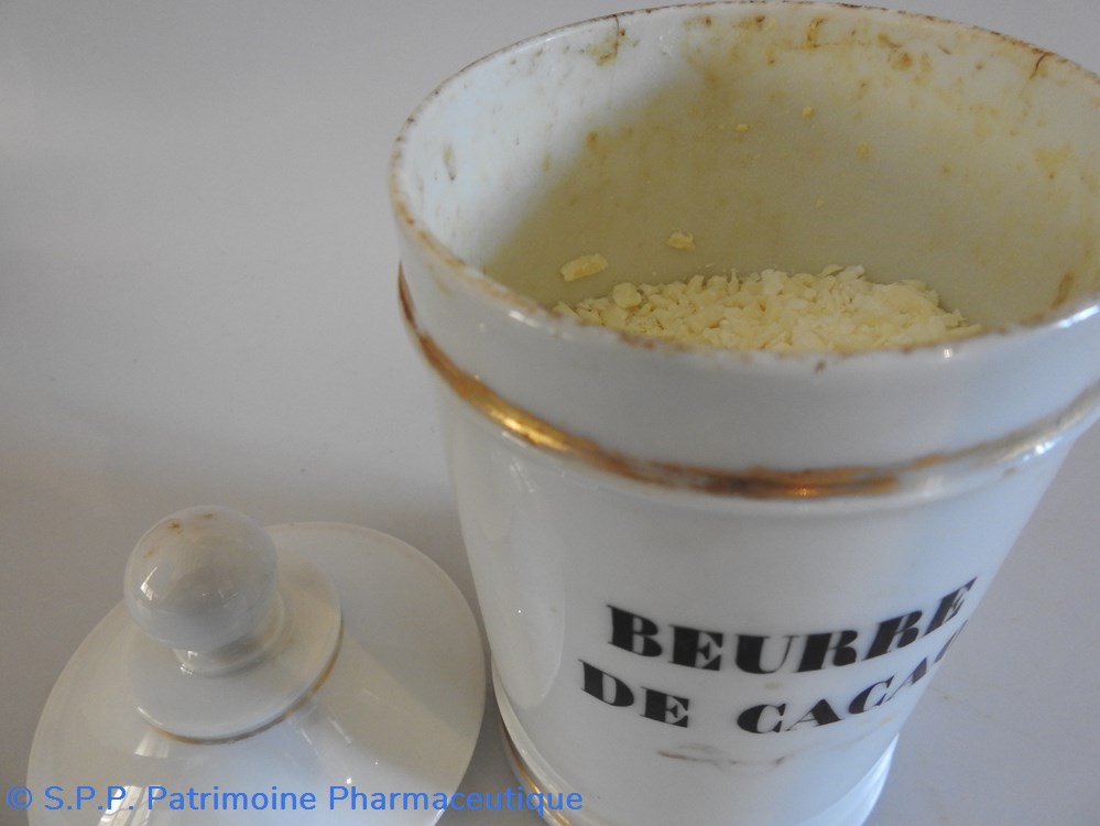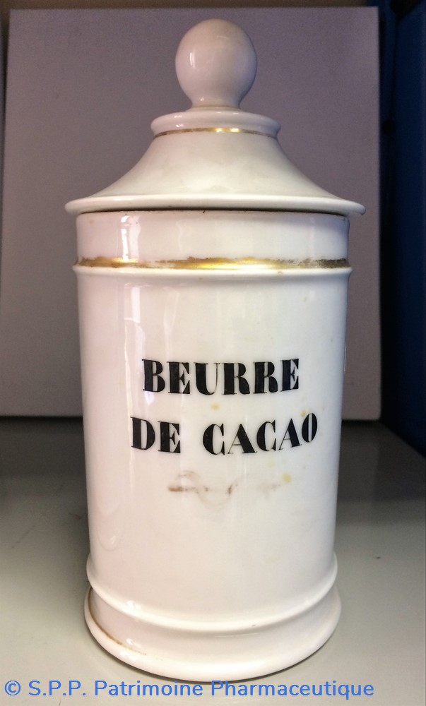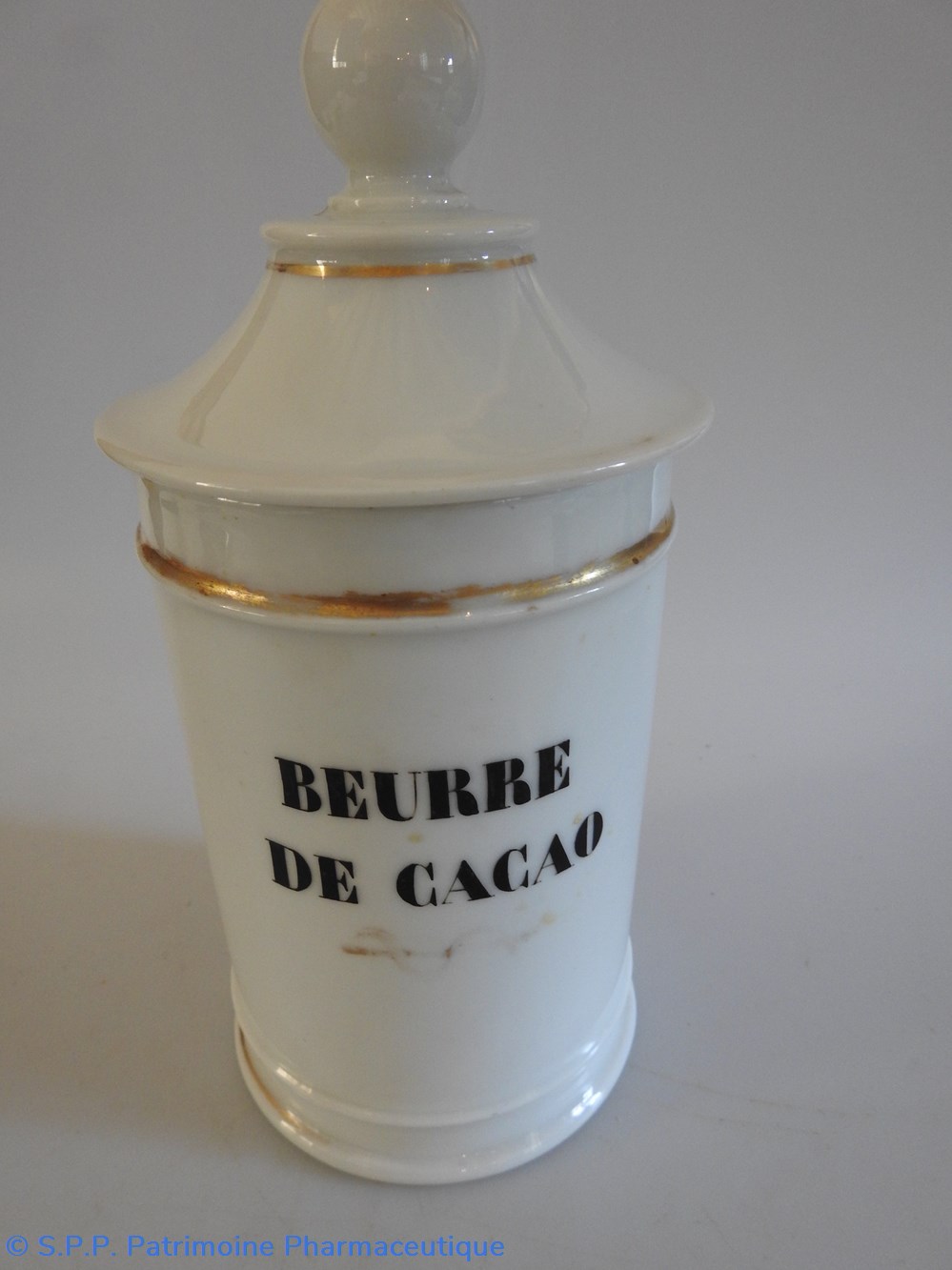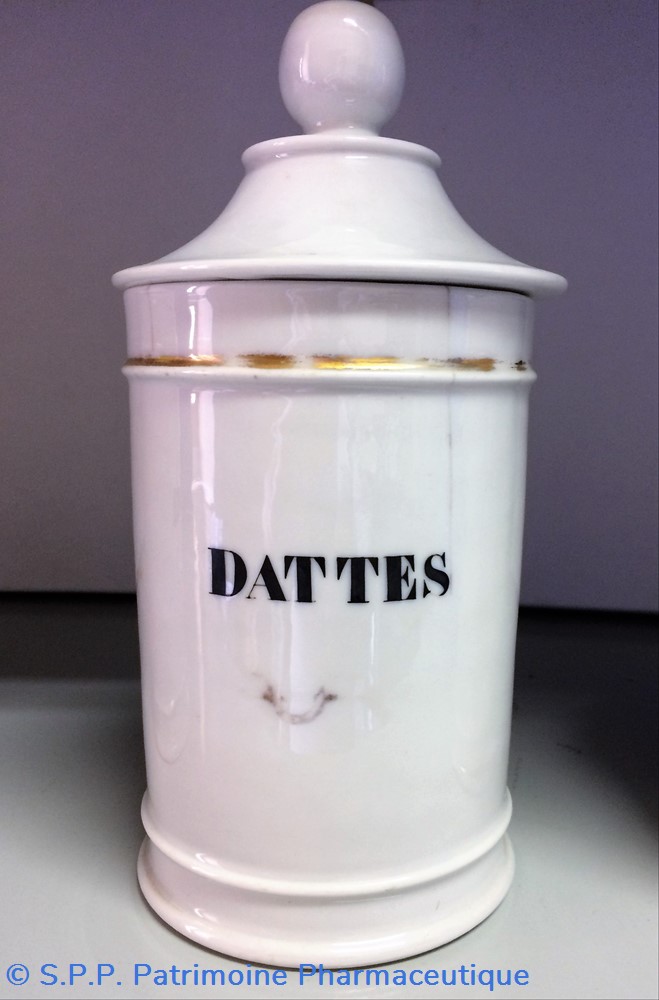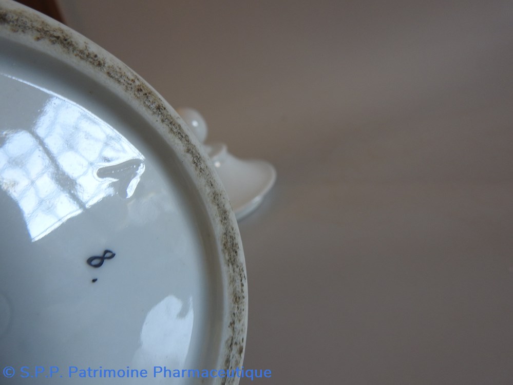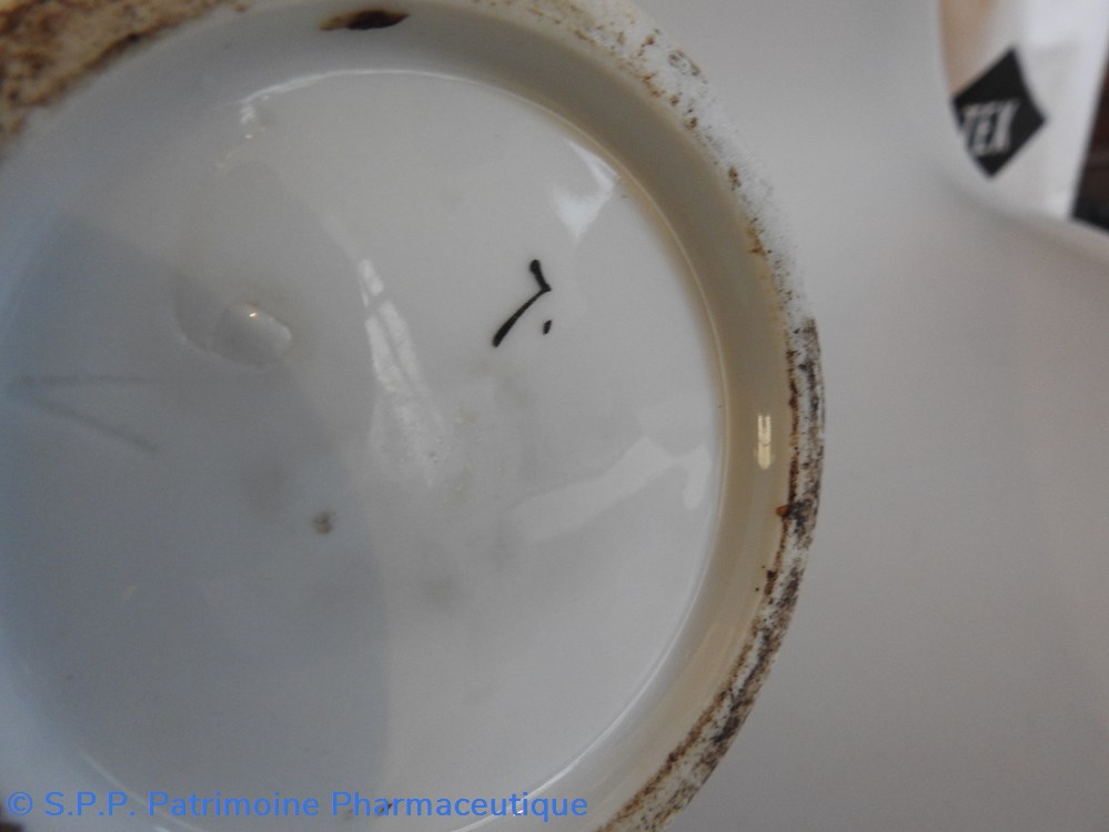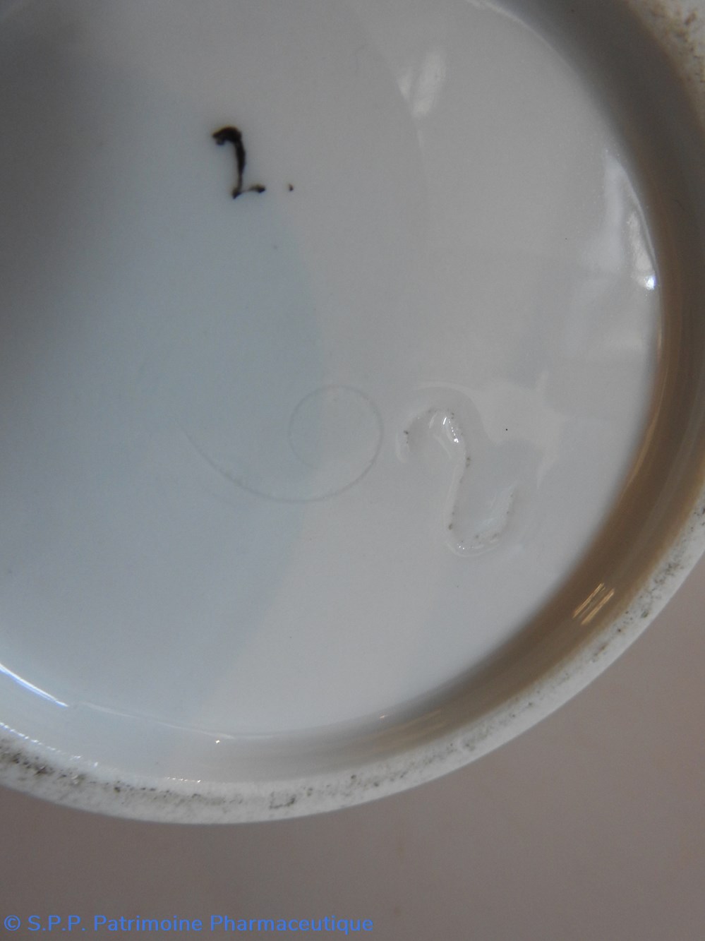 Pot de pharmacie d'une série de 24 pots en faïence blanche ayant pour seul ornement un filet en or sous le couvercle faisant le tour du pot et un serpent enroulé autour d'une branche également en or sous l'inscription en noir. Le couvercle est en pointe en forme de chapeau chinois et terminé par une prise en main légèrement ovoïde. Nombreuses fêlures.