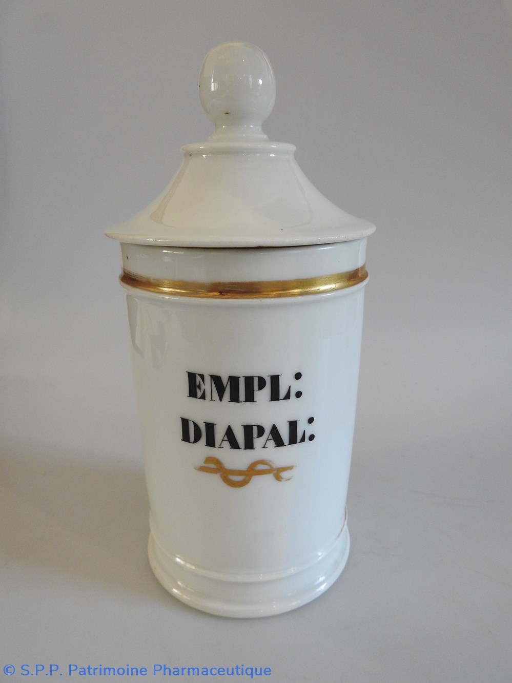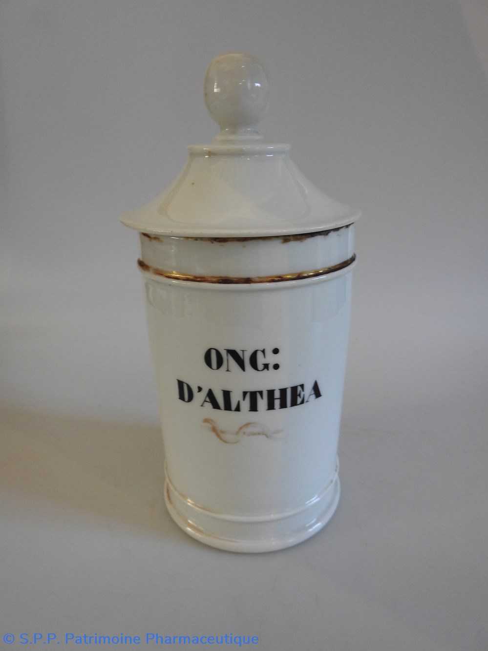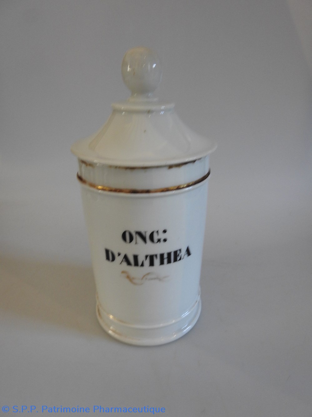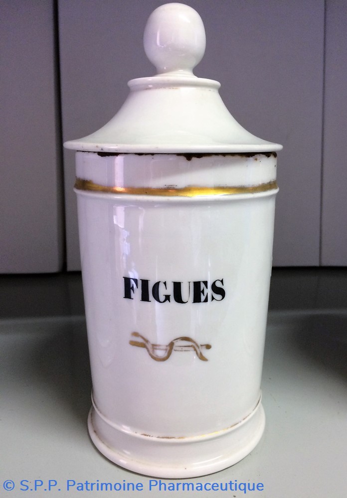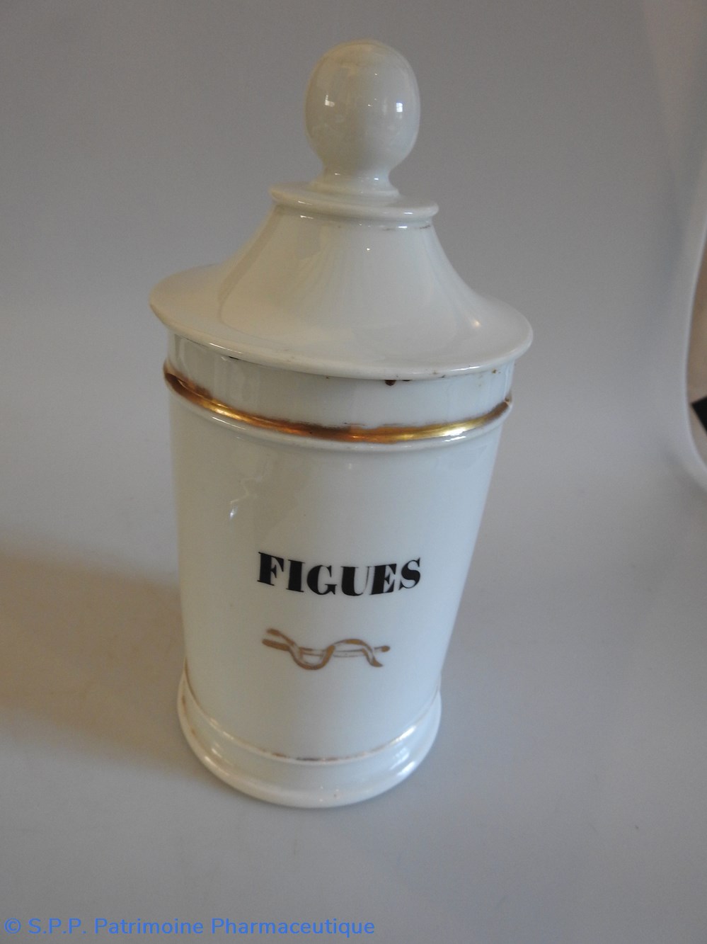 Pot de pharmacie d'une série de 24 pots en faïence blanche ayant pour seul ornement un filet en or sous le couvercle faisant le tour du pot et un serpent enroulé autour d'une branche également en or sous l'inscription en noir. Le couvercle est en pointe en forme de chapeau chinois et terminé par une prise en main légèrement ovoïde.