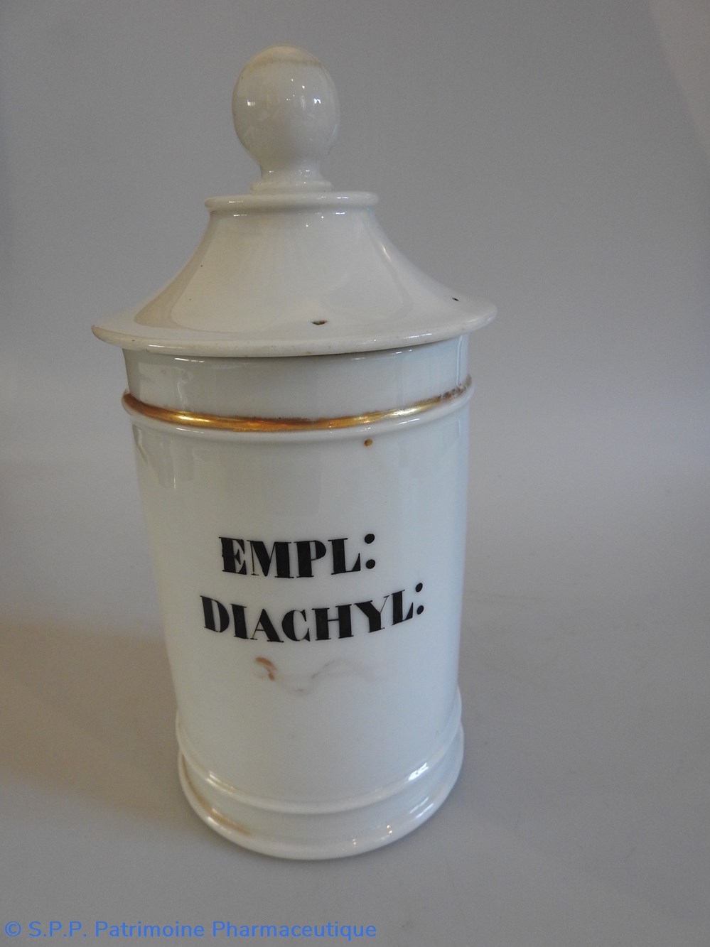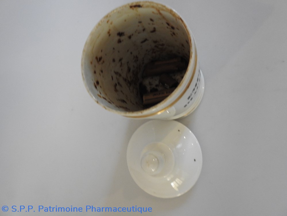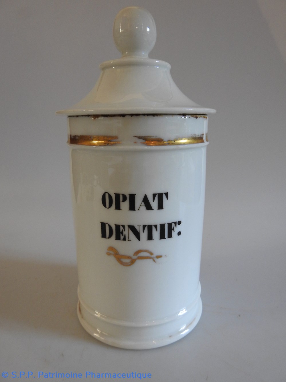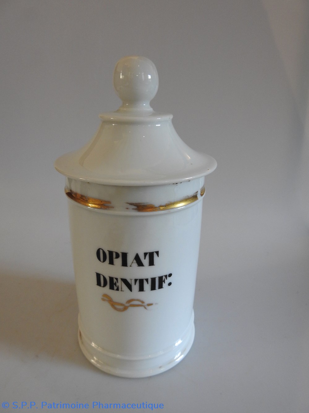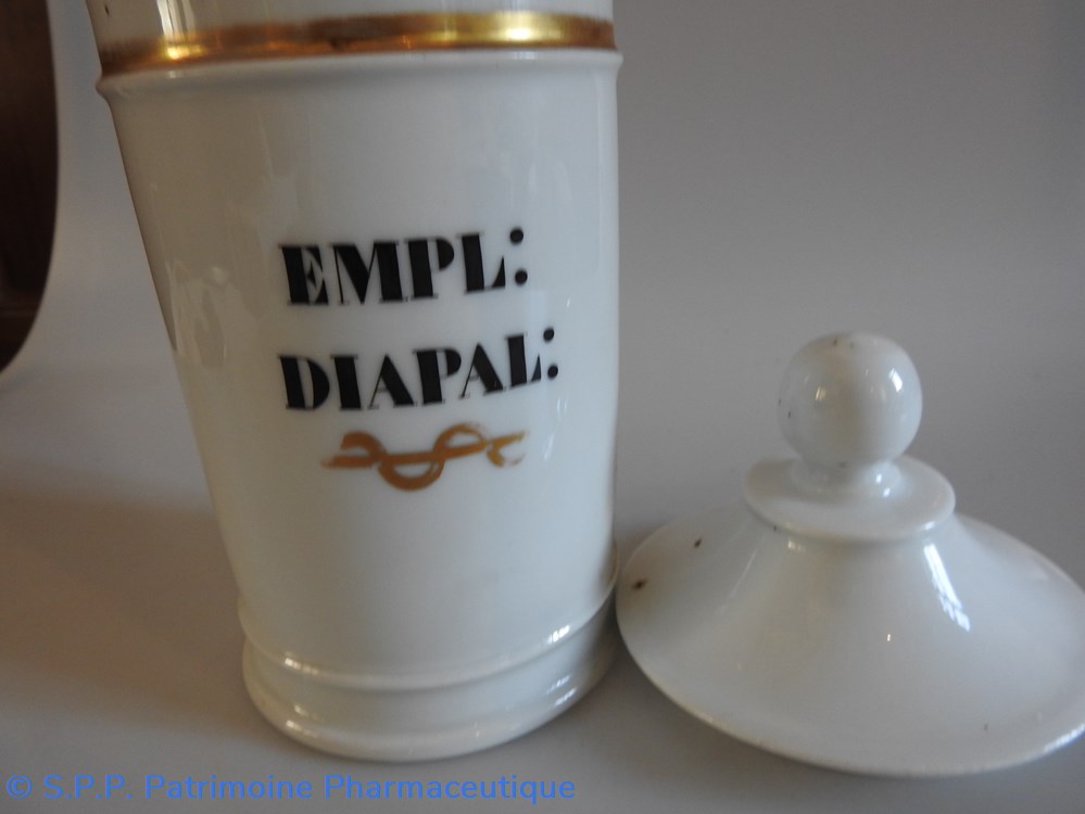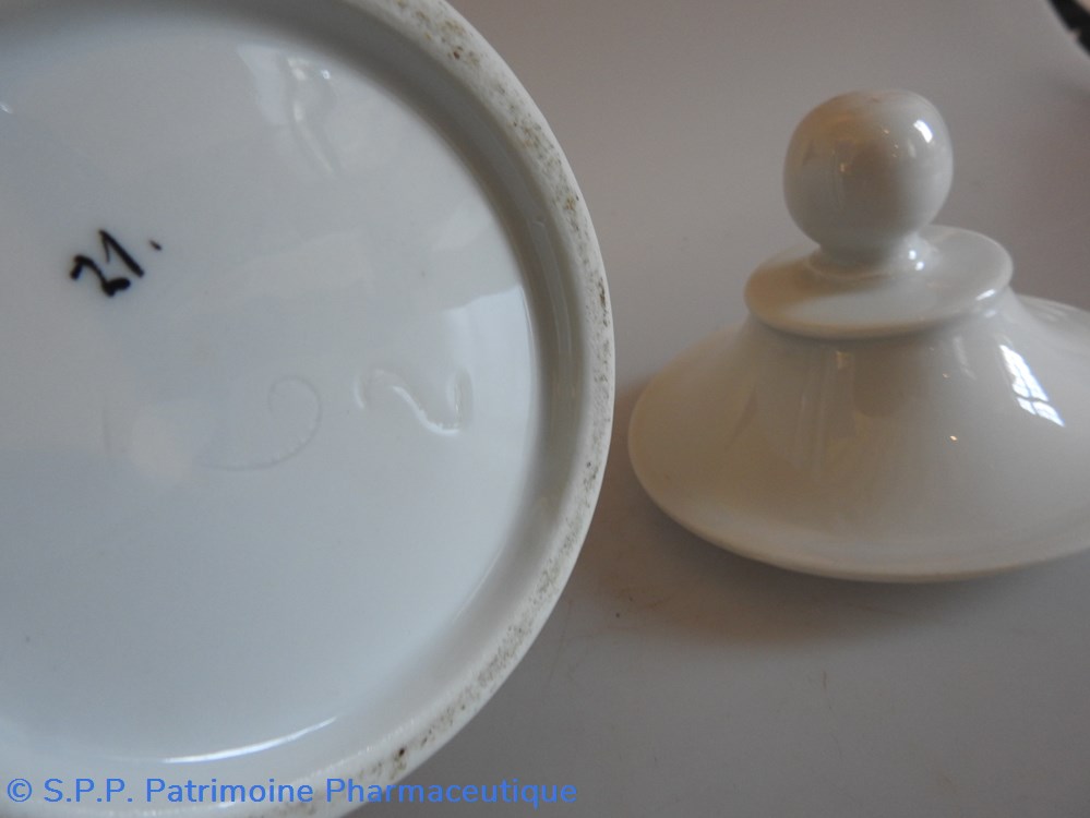 Pot de pharmacie d'une série de 24 pots en faïence blanche ayant pour seul ornement un filet en or sous le couvercle faisant le tour du pot et un serpent enroulé autour d'une branche également en or sous l'inscription en noir. Le couvercle est en pointe en forme de chapeau chinois et terminé par une prise en main légèrement ovoïde.