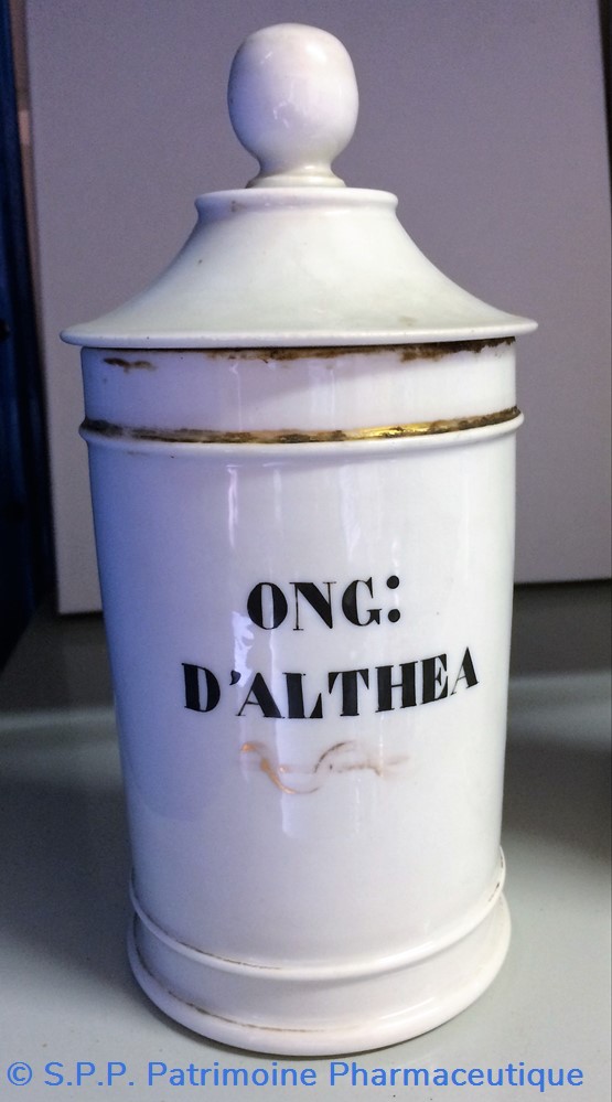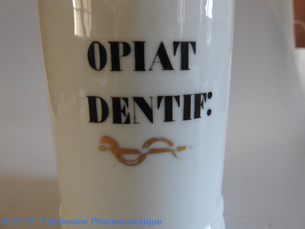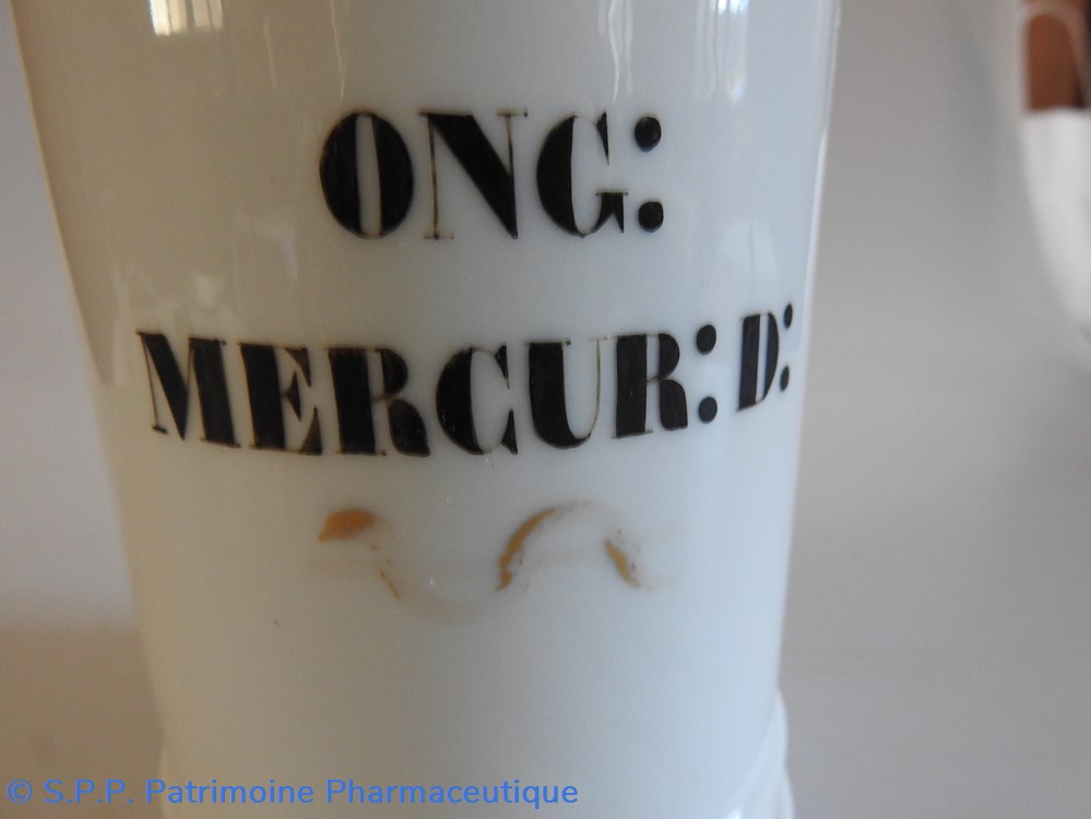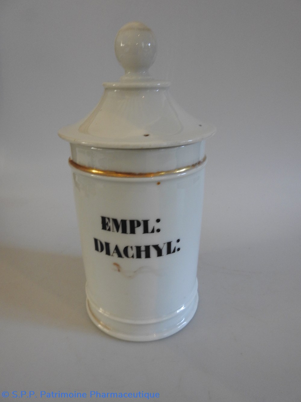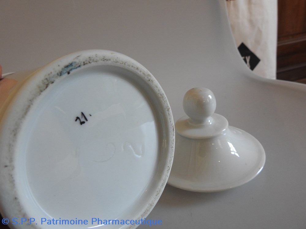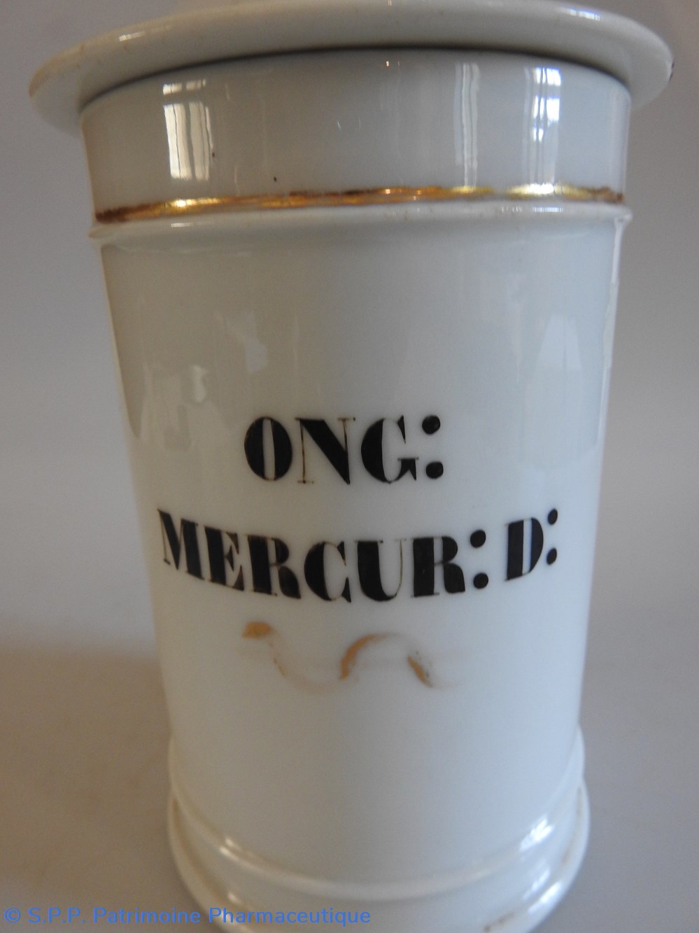 Pot de pharmacie d'une série de 24 pots en faïence blanche ayant pour seul ornement un filet en or sous le couvercle faisant le tour du pot et un serpent enroulé autour d'une branche également en or sous l'inscription en noir. Le couvercle est en pointe en forme de chapeau chinois et terminé par une prise en main légèrement ovoïde.
