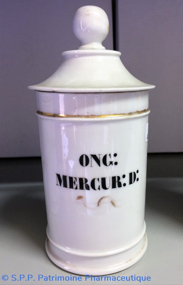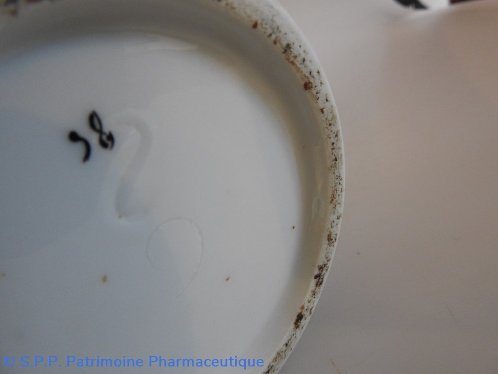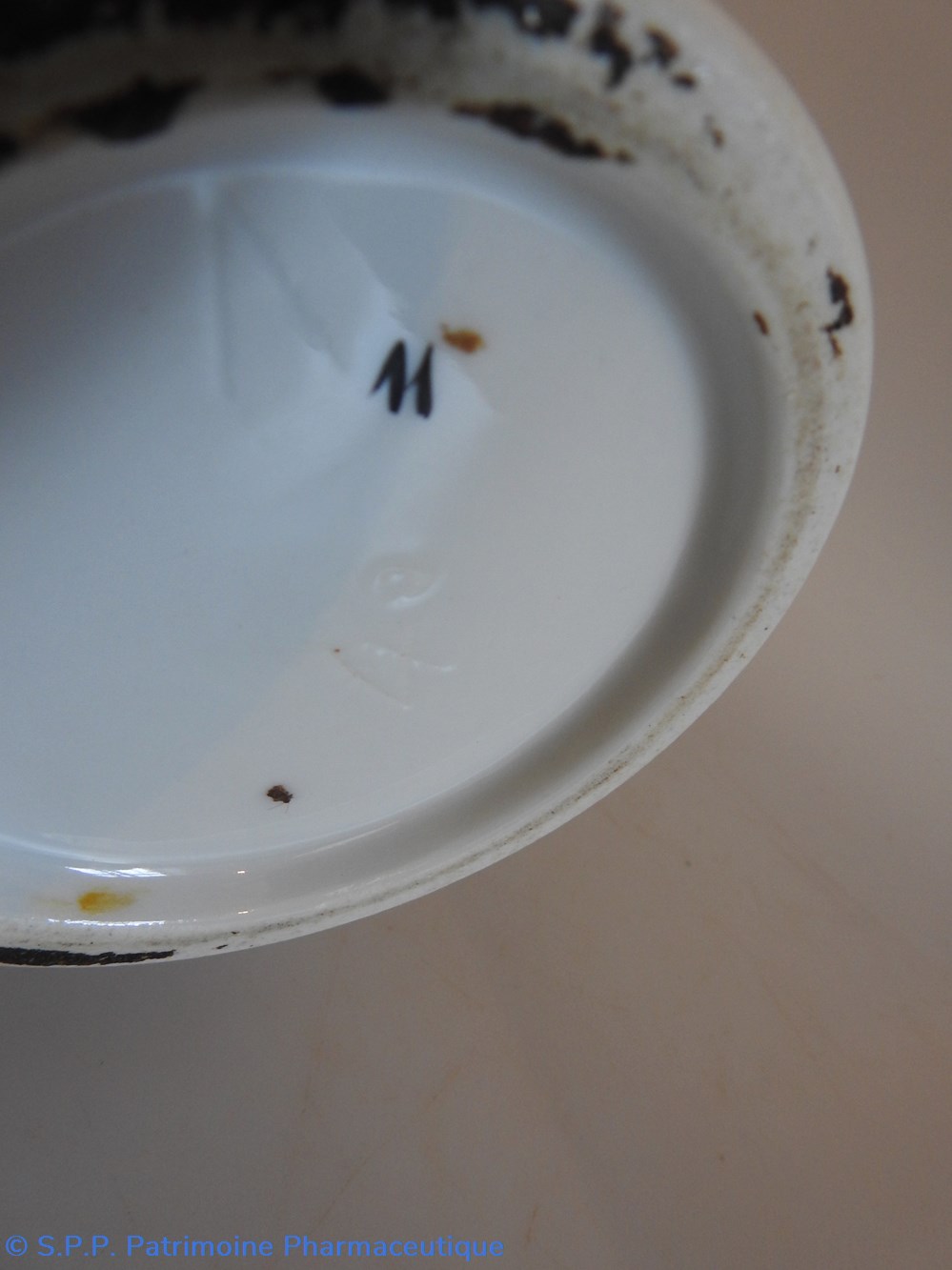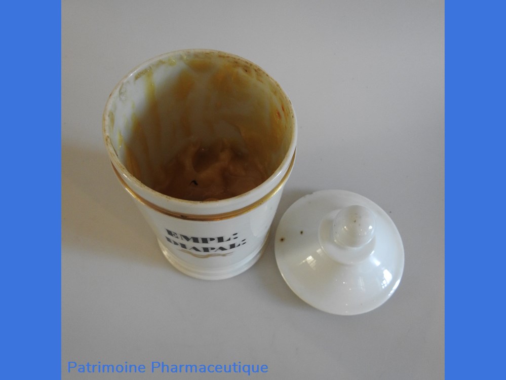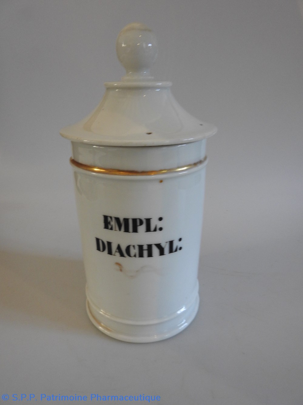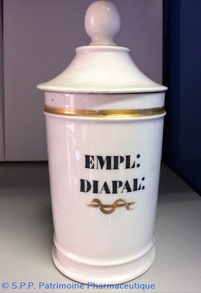 Pot de pharmacie d'une série de 24 pots en faïence blanche ayant pour seul ornement un filet en or sous le couvercle faisant le tour du pot et un serpent enroulé autour d'une branche également en or sous l'inscription en noir. Le couvercle est en pointe en forme de chapeau chinois et terminé par une prise en main légèrement ovoïde.