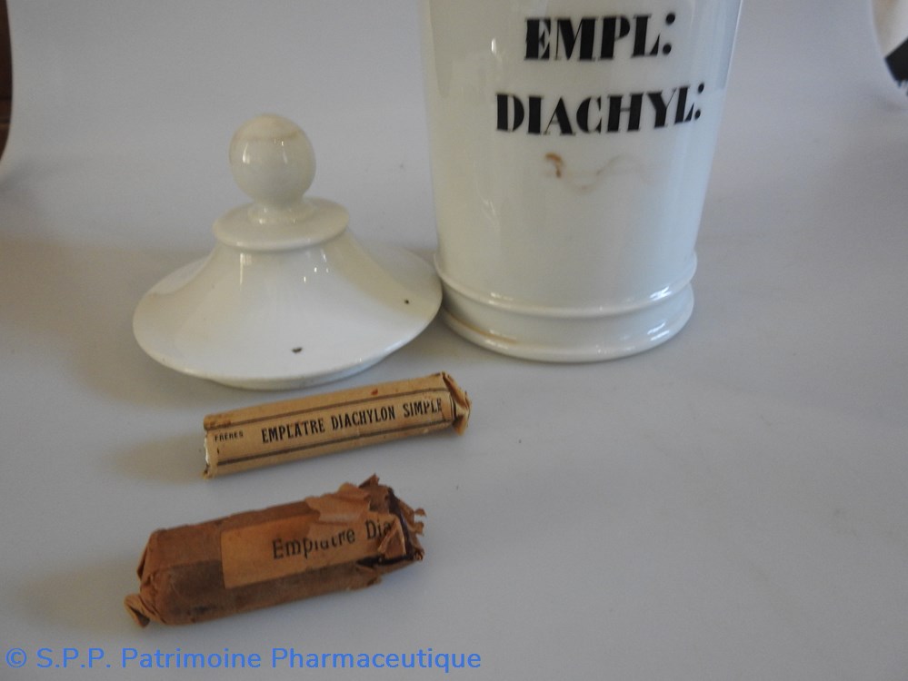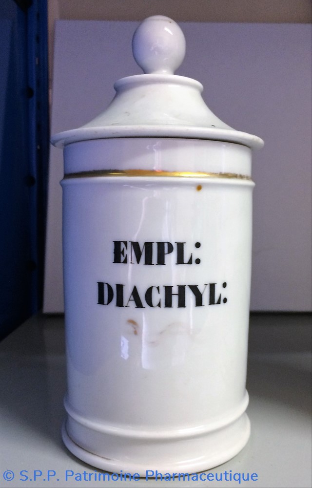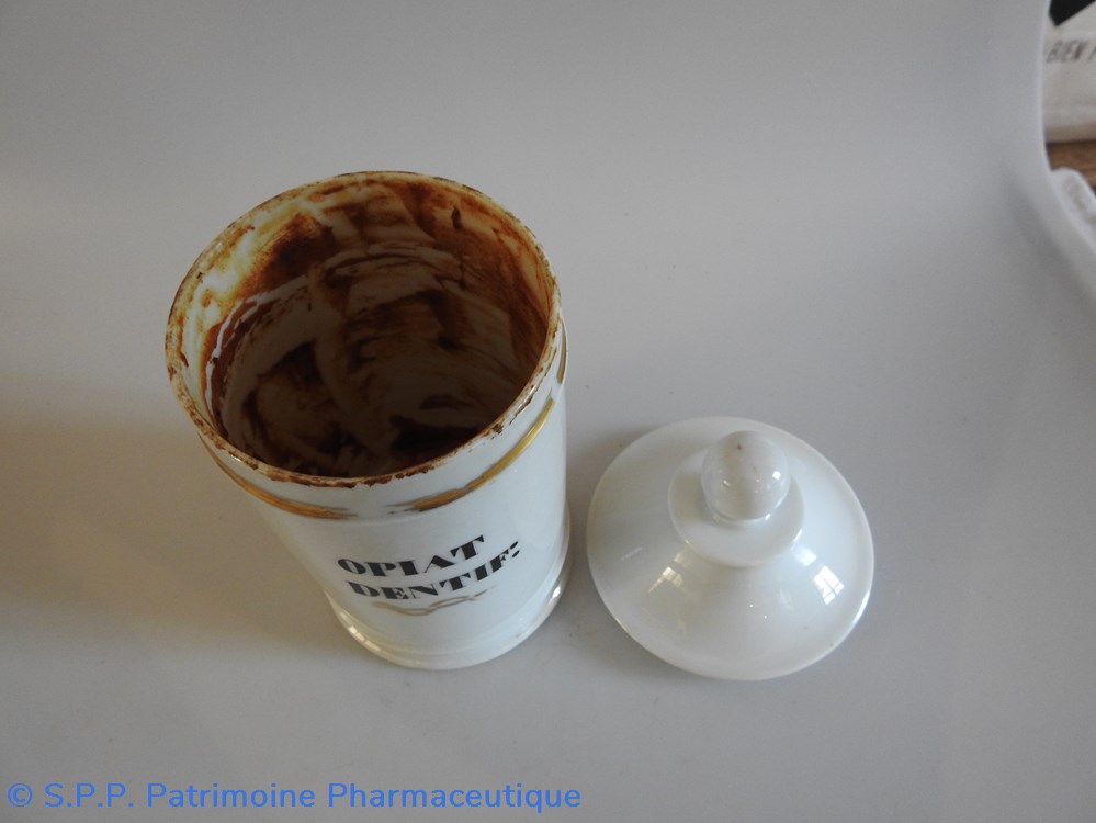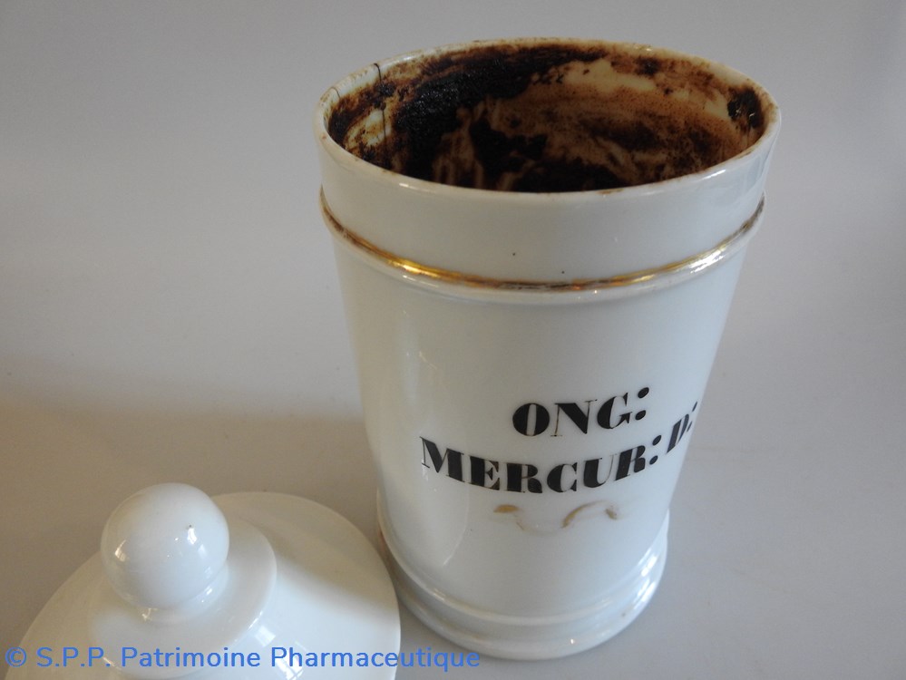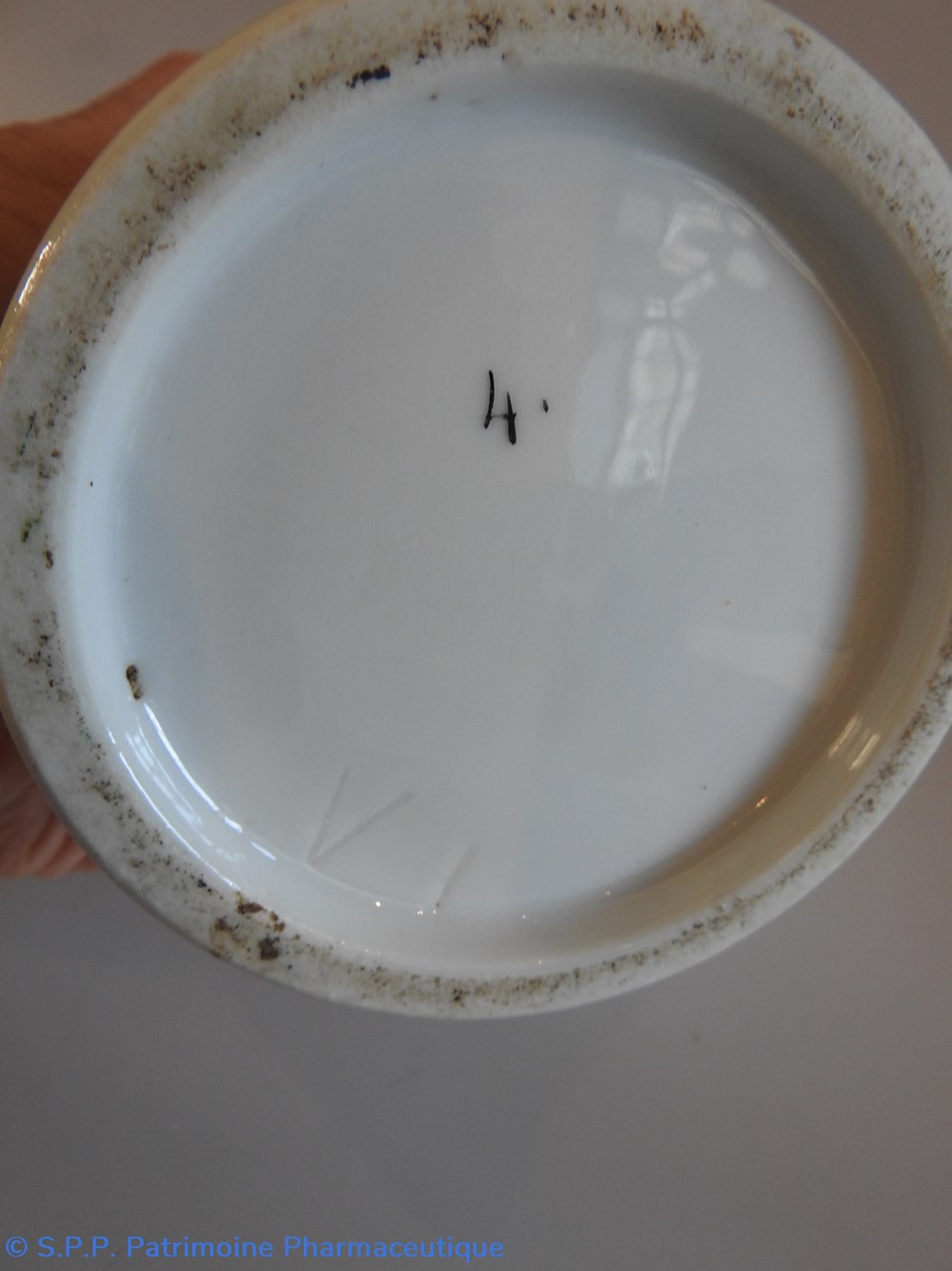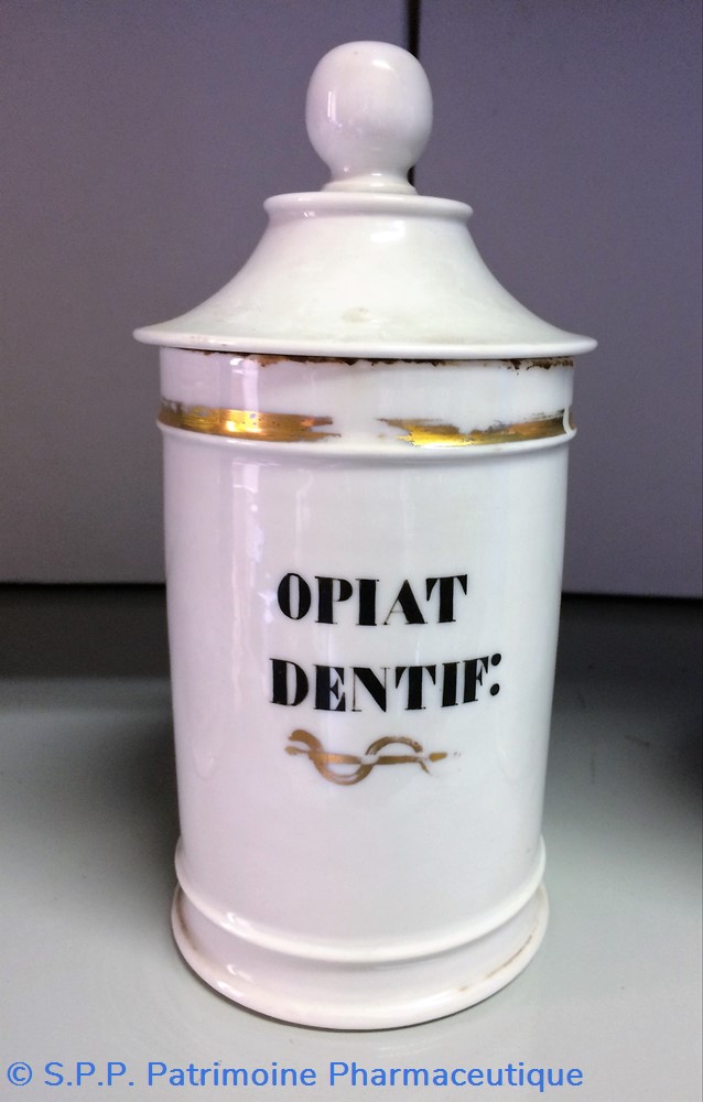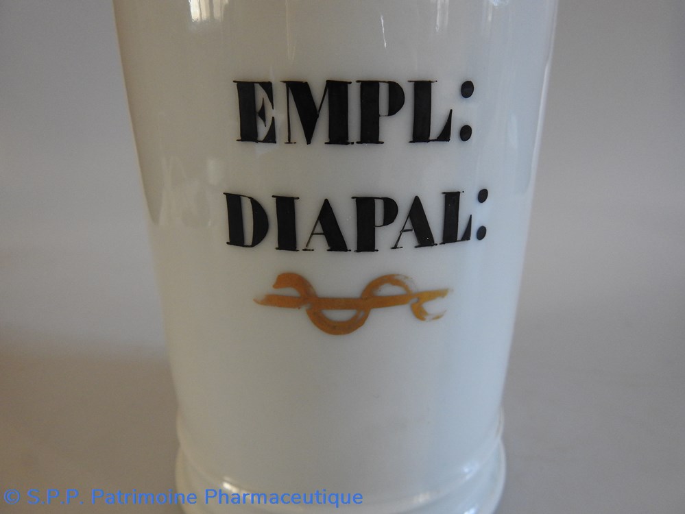 Pot de pharmacie d'une série de 24 pots en faïence blanche ayant pour seul ornement un filet en or sous le couvercle faisant le tour du pot et un serpent enroulé autour d'une branche également en or sous l'inscription en noir. Le couvercle est en pointe en forme de chapeau chinois et terminé par une prise en main légèrement ovoïde.