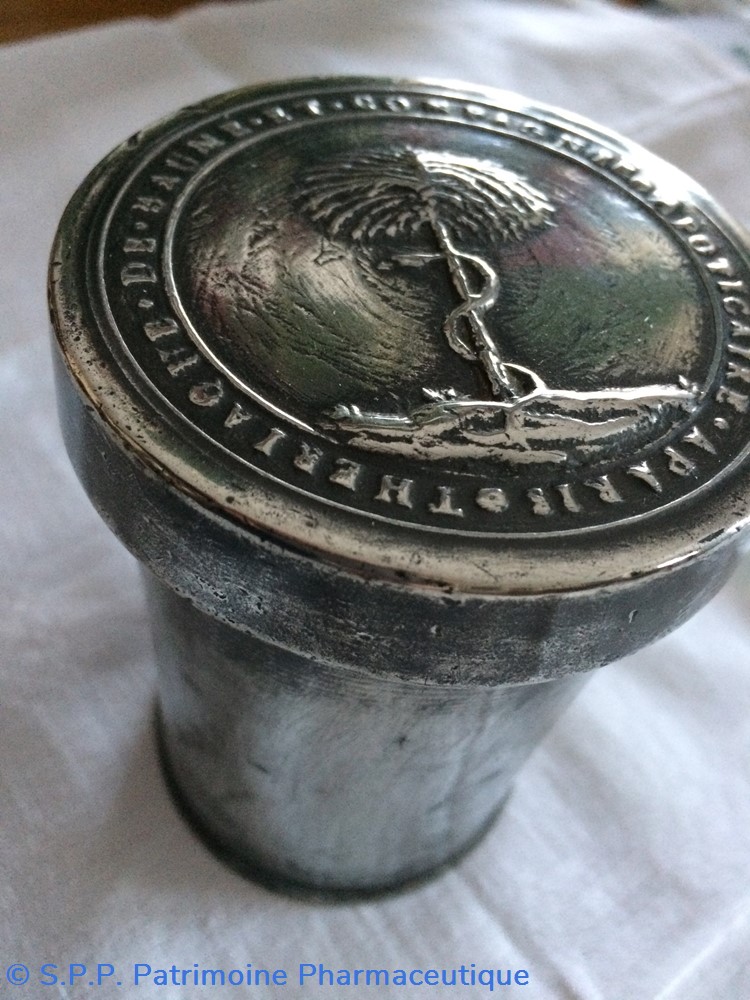 Ce pot en étain était destiné à contenir de la Thériaque préparée avec grand soin par l'apothicaire.