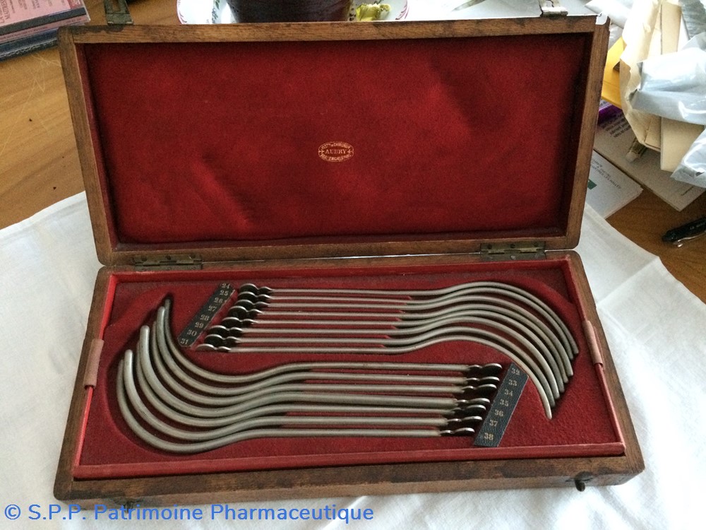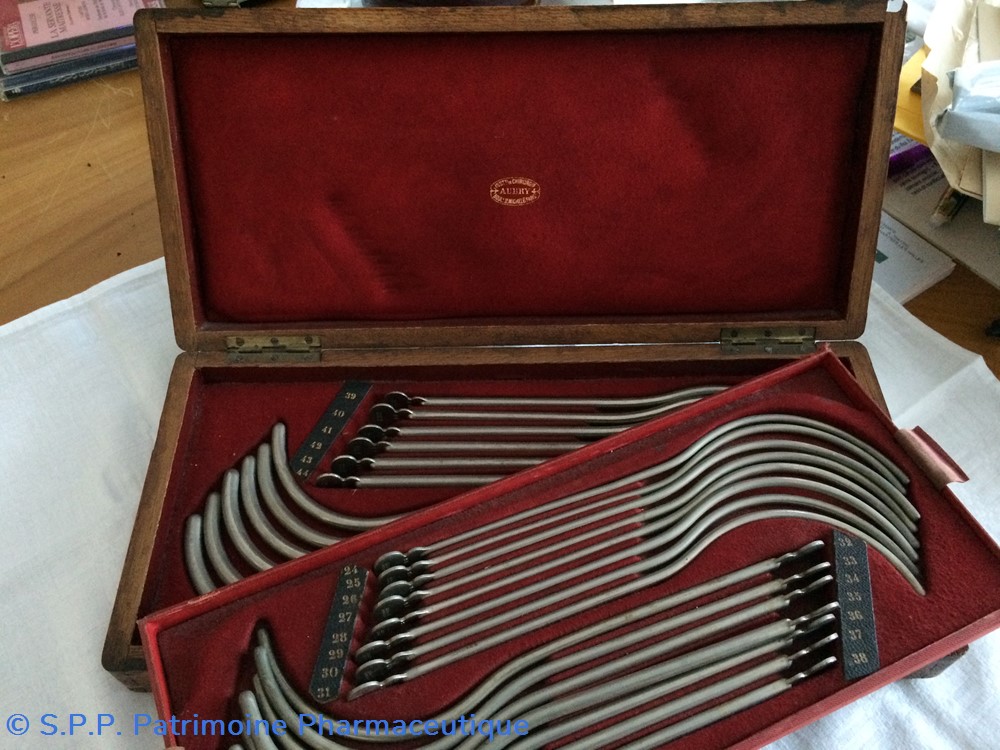 Très rare ensemble complet de sondes urologiques en étain de 27 tailles différentes numérotées de 2 à 45, dans leur coffret d'origine en chêne à deux présentoirs recouverts de velours rouge, marqué :