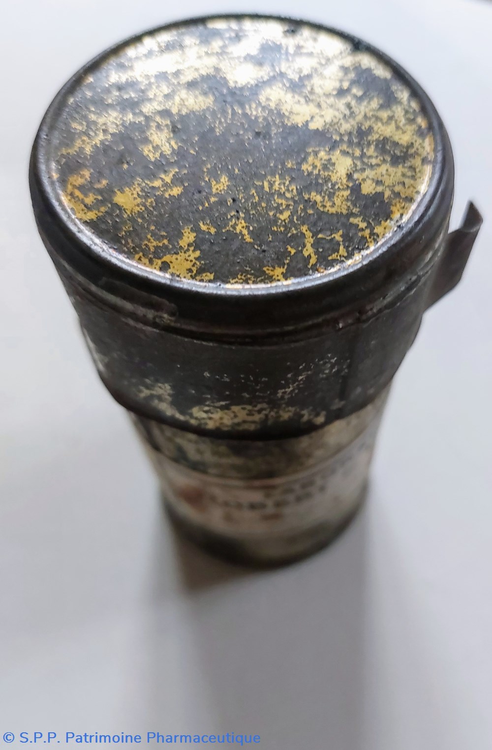 Boîte métallique cylindrique scellée par une ceinture métallique.