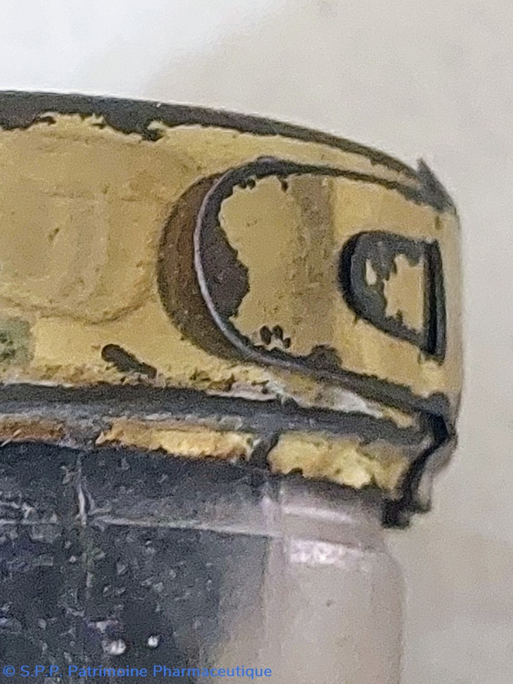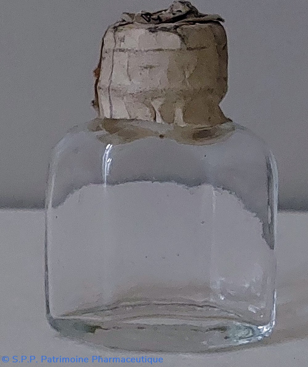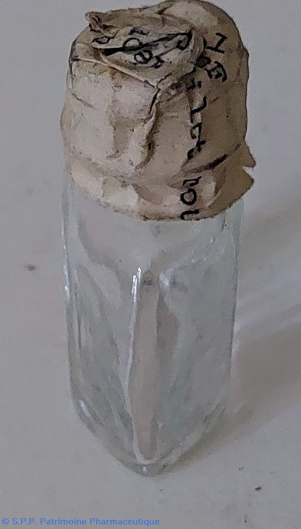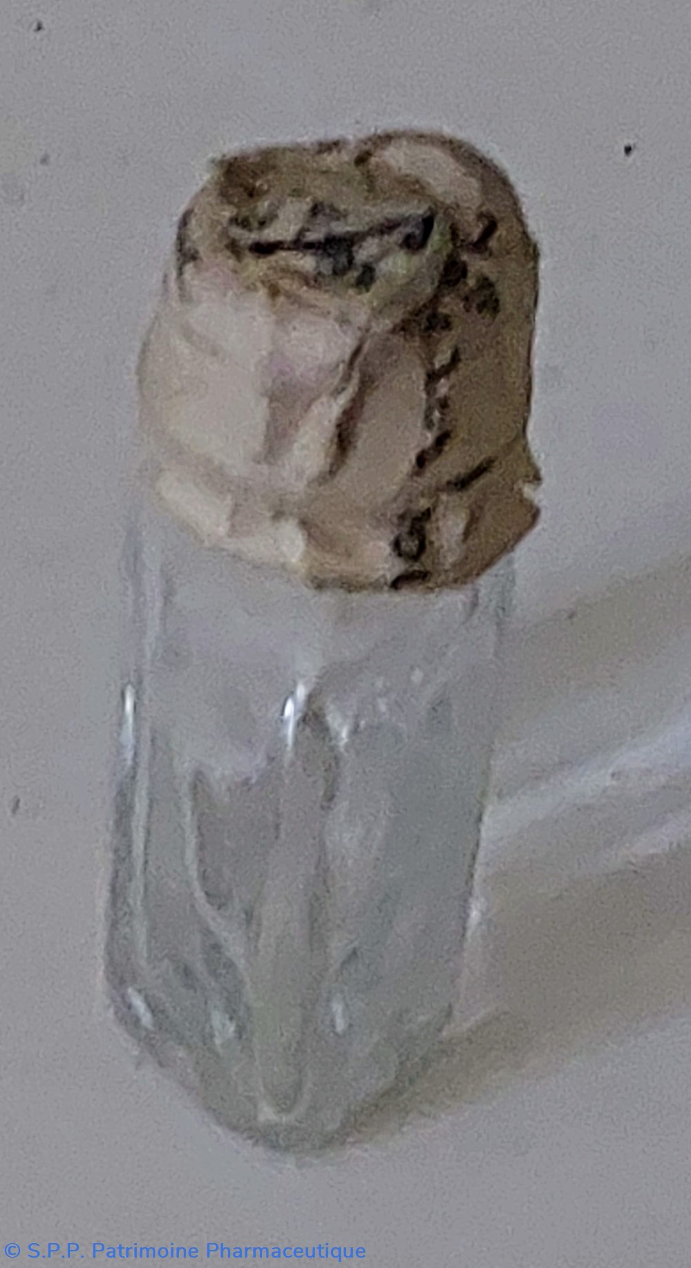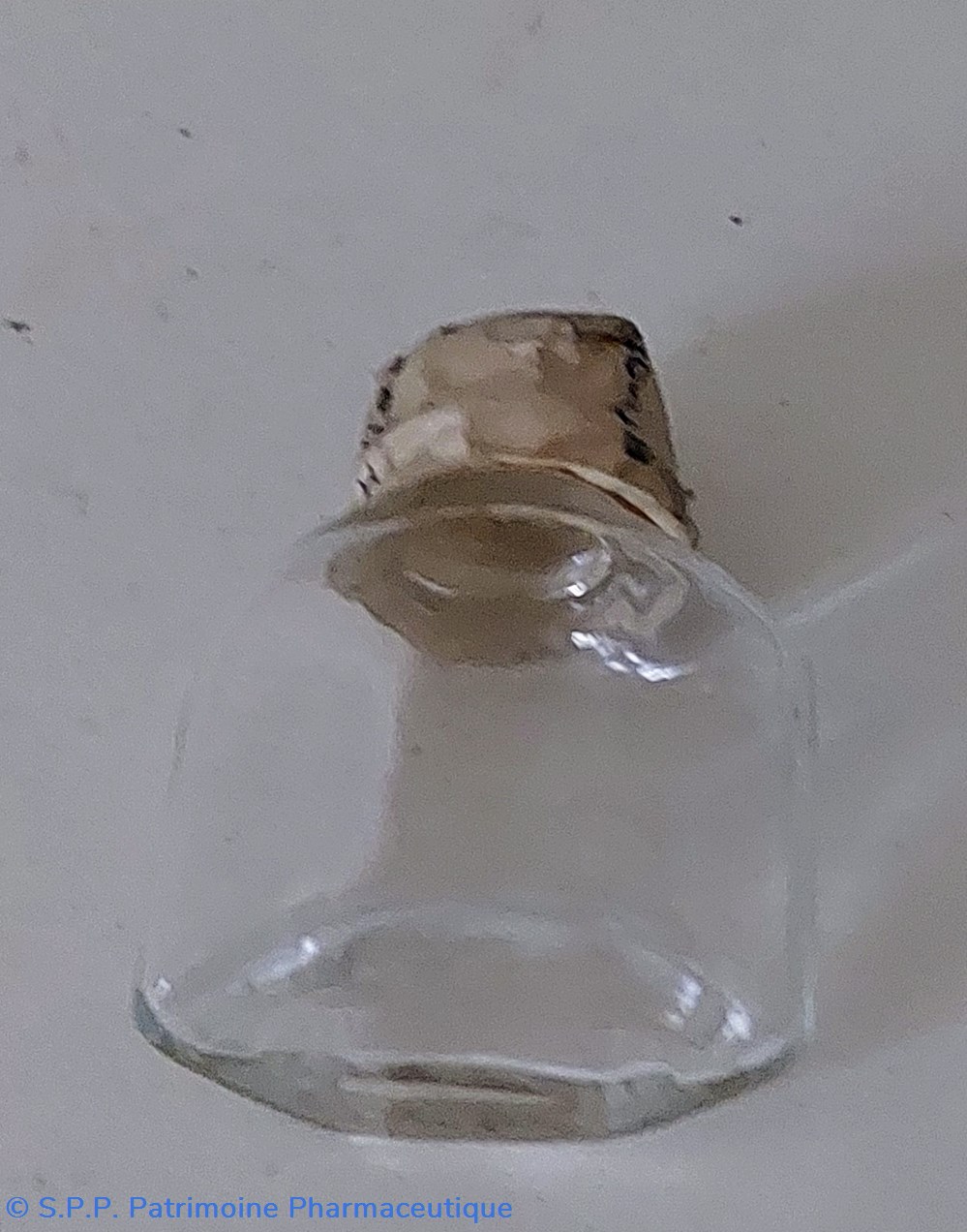 Flacon cylindrique en verre scellé d'origine par une ceinture métallique.