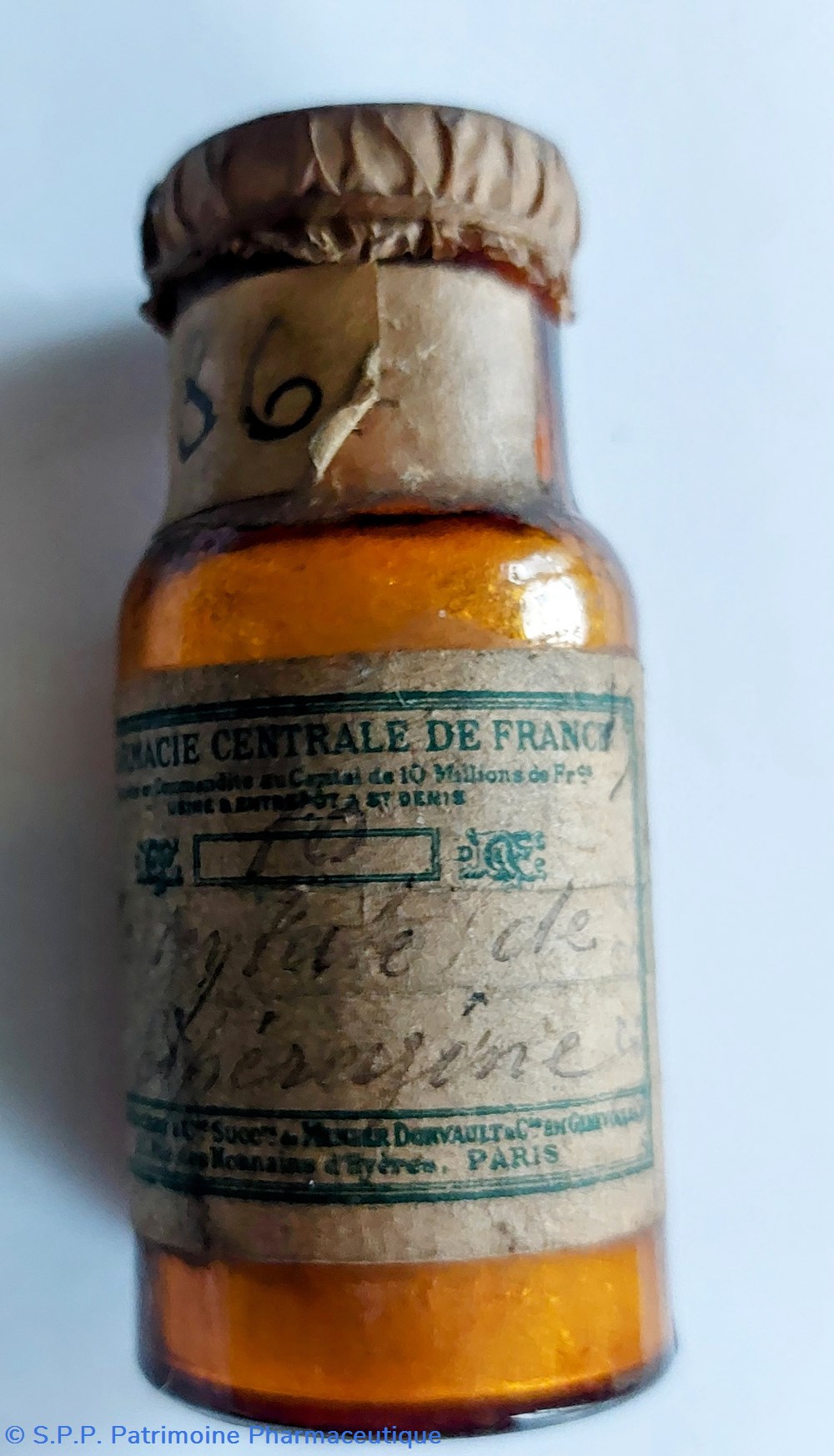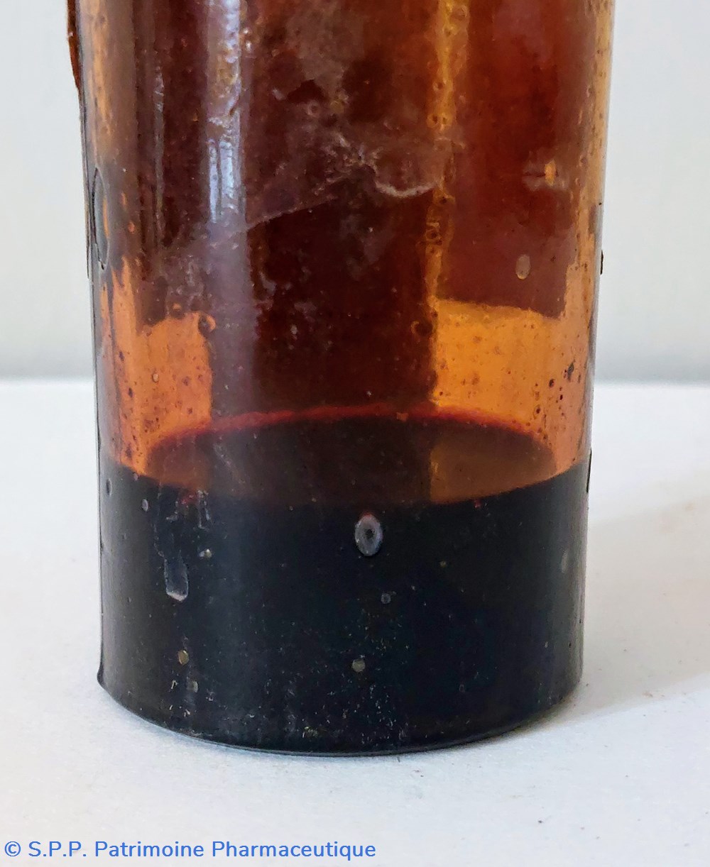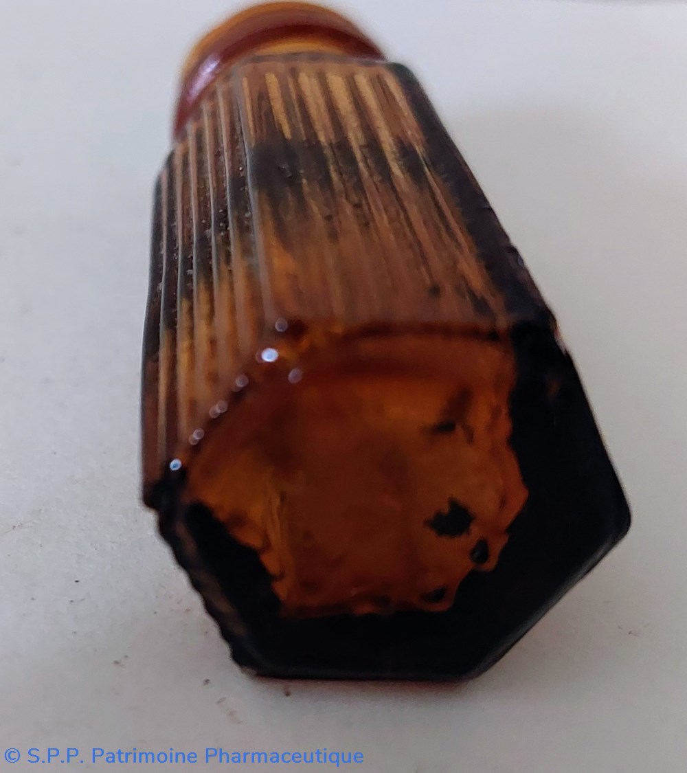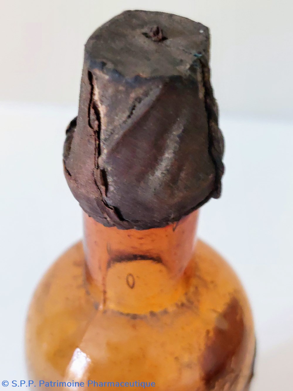 Petit flacon cylindrique en verre ambré ancien scellé d'origine.