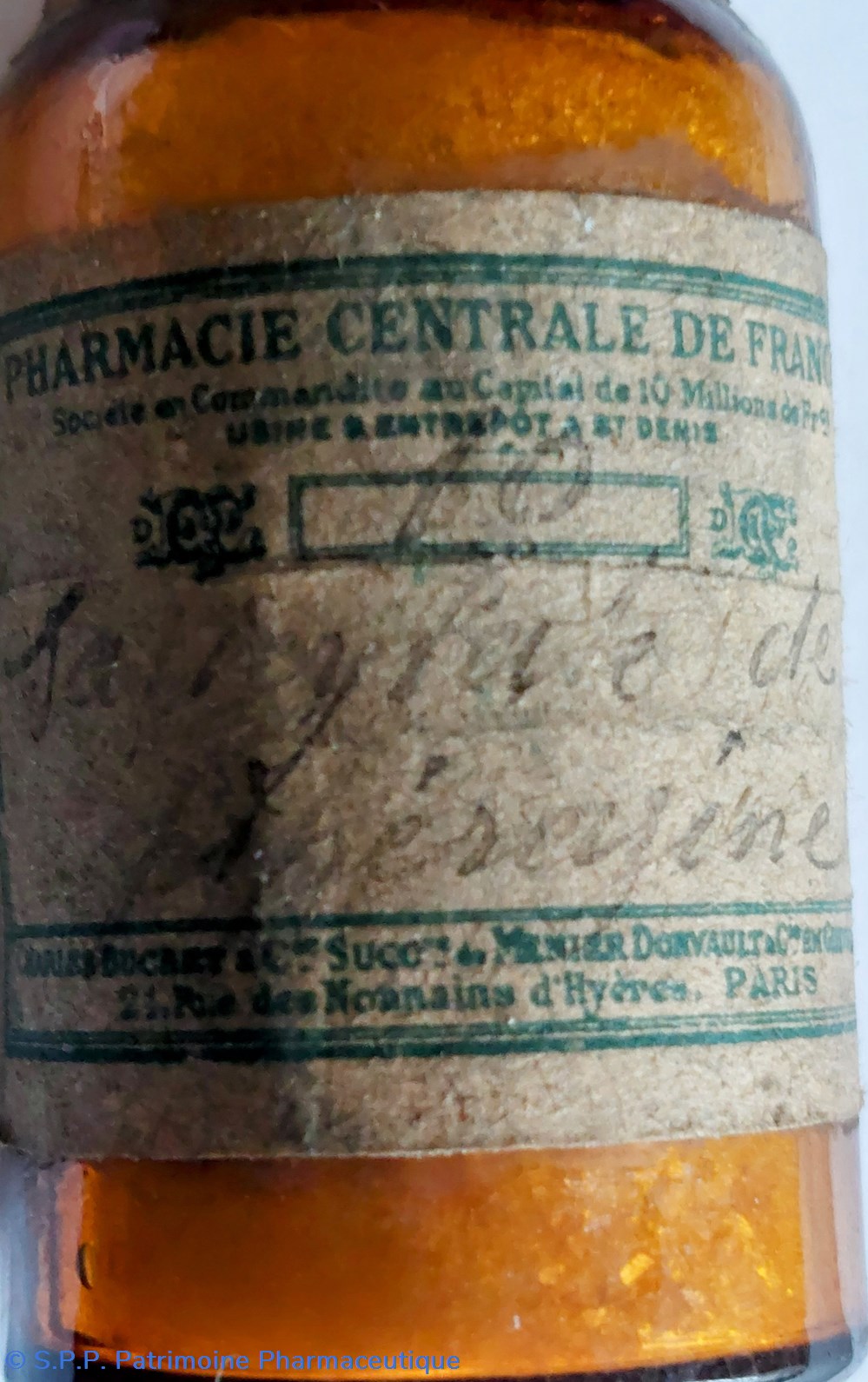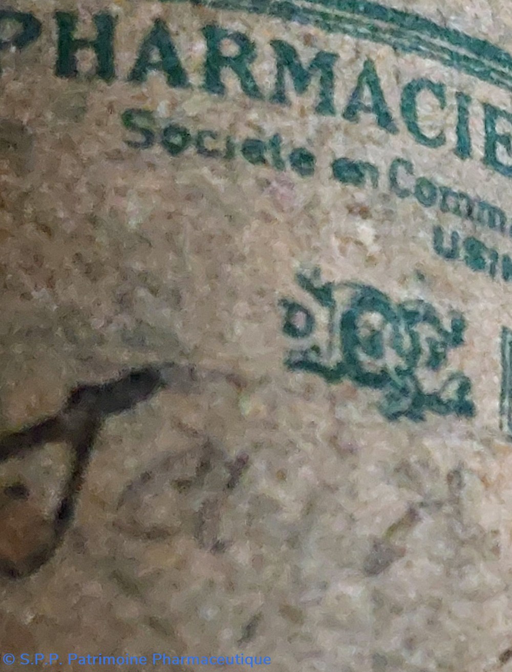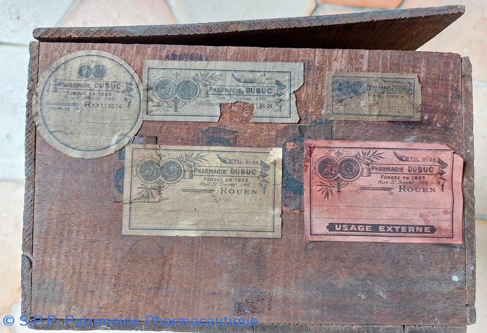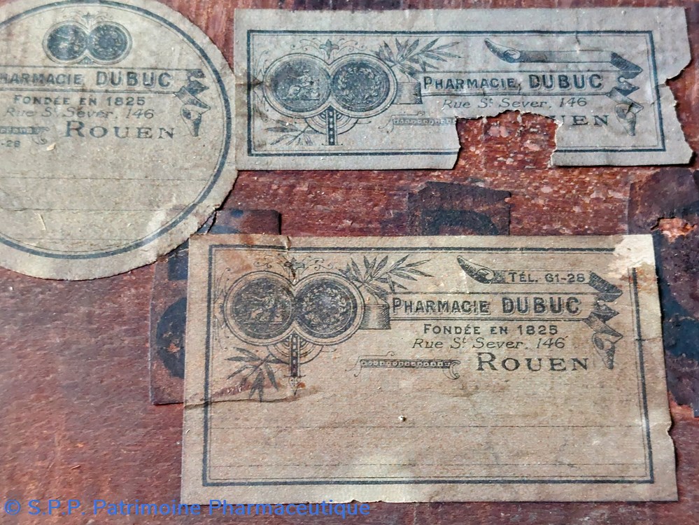 Sur un côté on voit 5 étiquettes différentes de la Pharmacie DUBUC à Rouen.