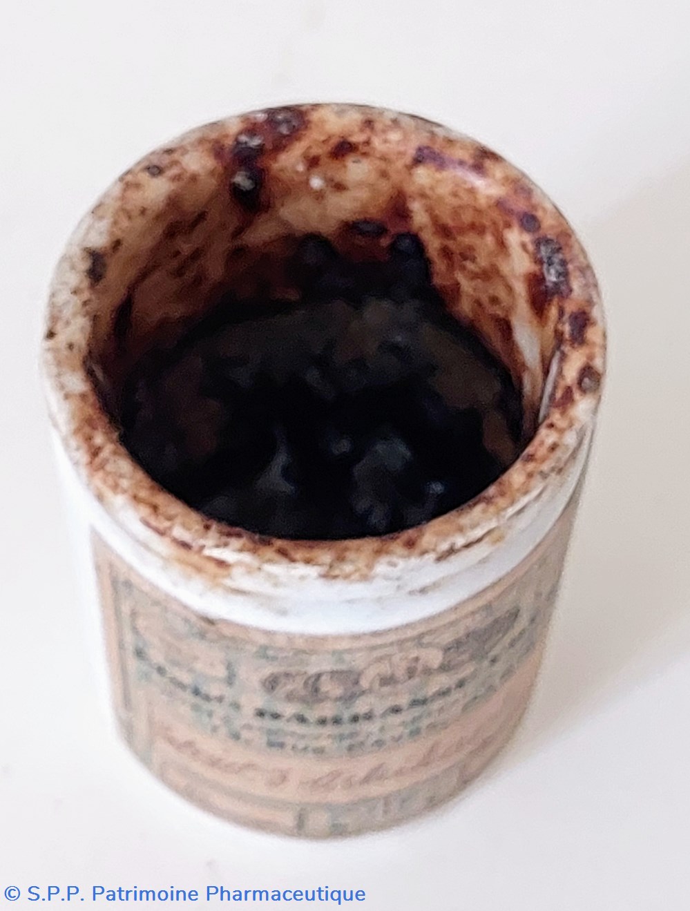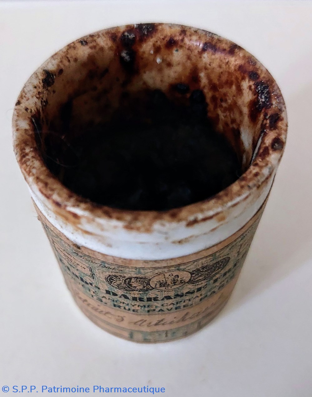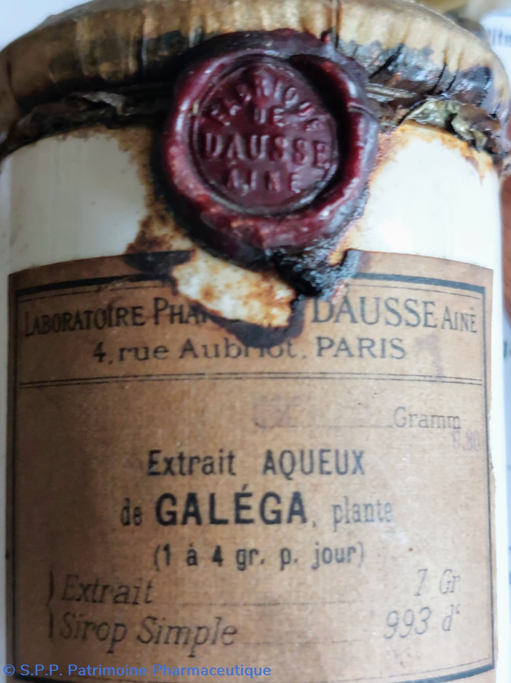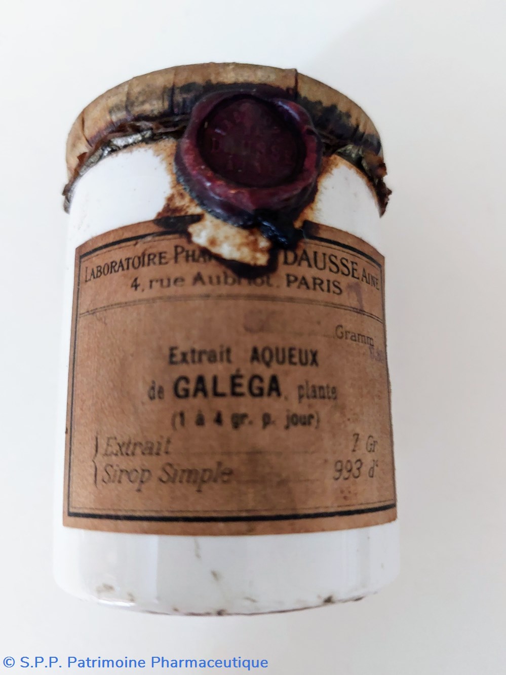 Pot cylindrique scellé d'origine par un couvercle recouvert d'une enveloppe en papier fermé par un cordon et un sceau en cire des Laboratoires DAUSSE.