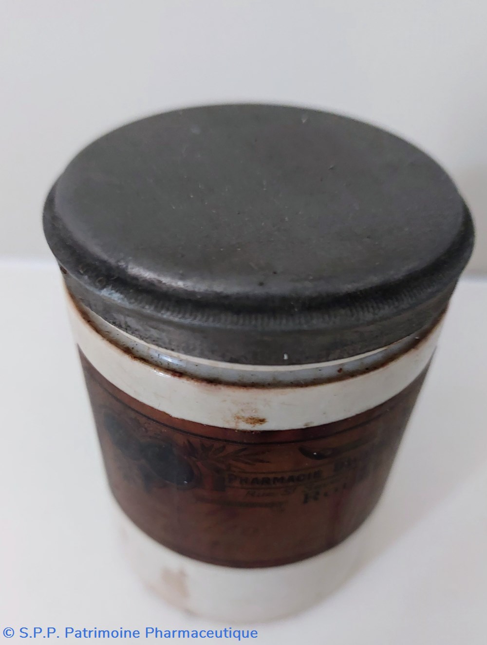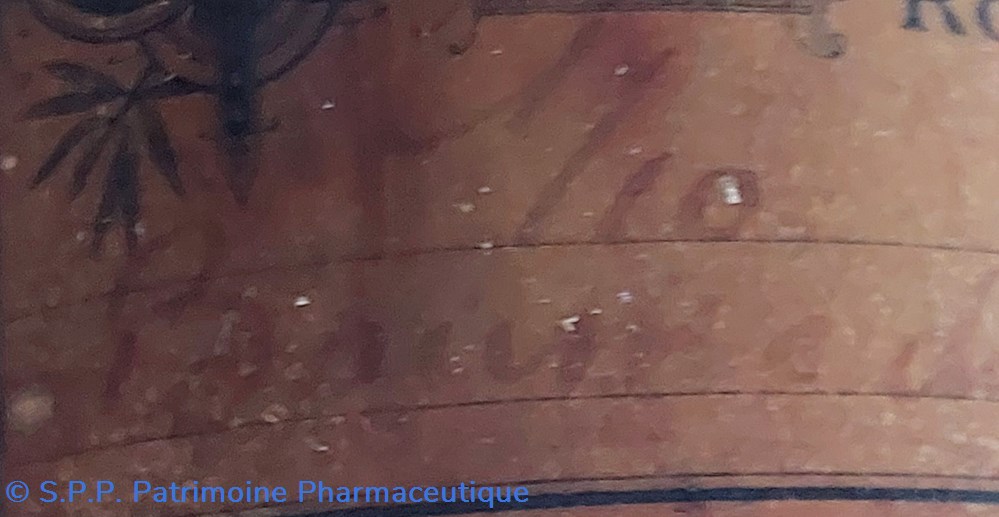 Sous le pot une étiquette peu lisible.