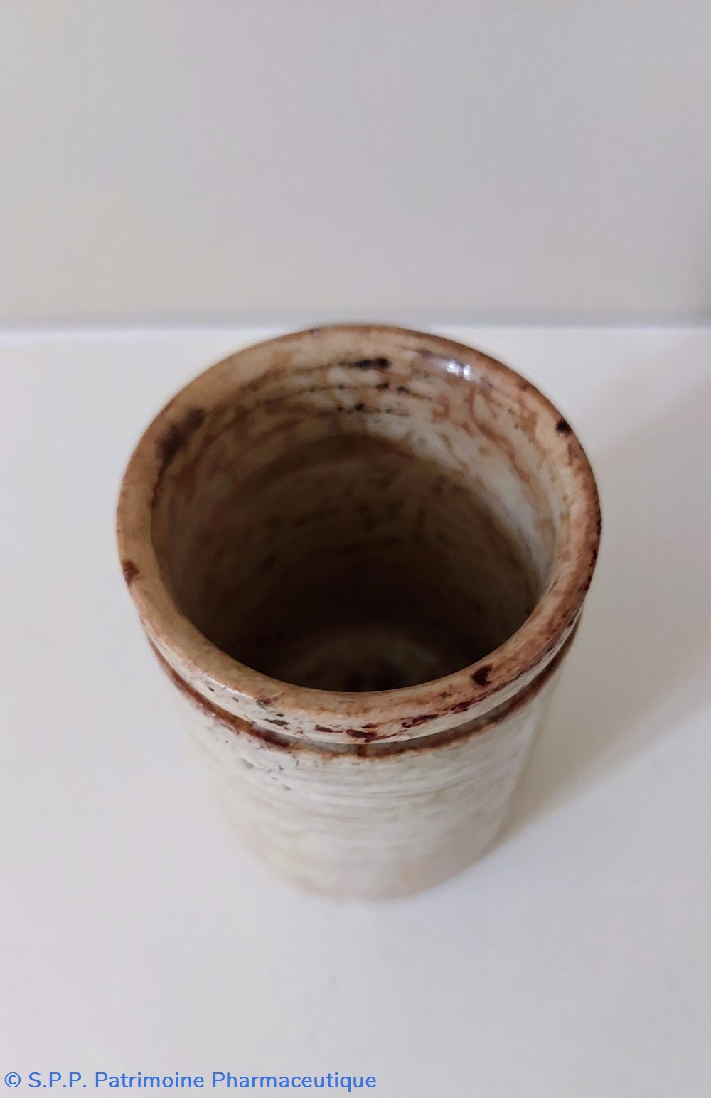 Petit pot à onguent cylindrique en céramique contenant un reste de produit. Absence de couvercle.