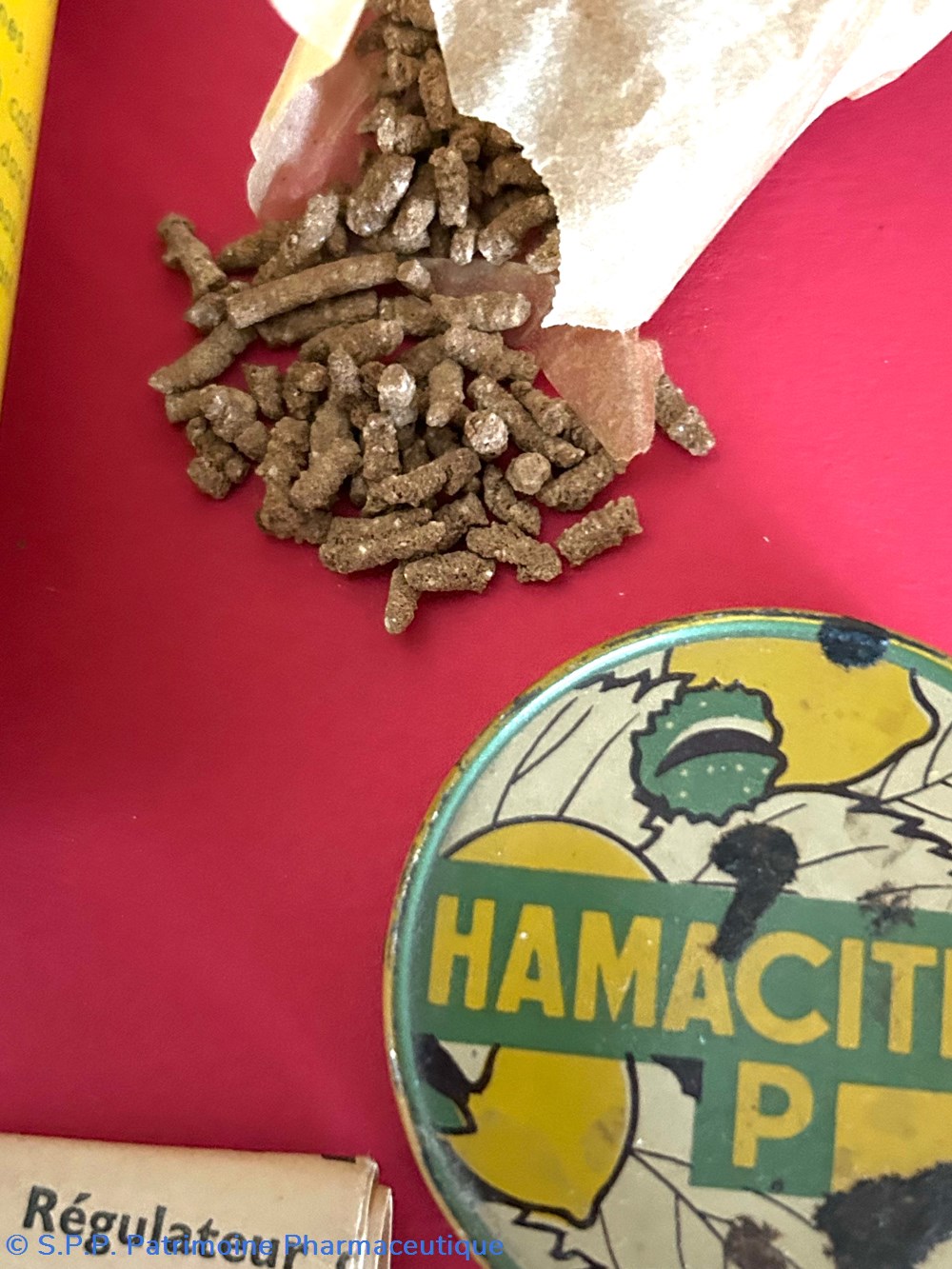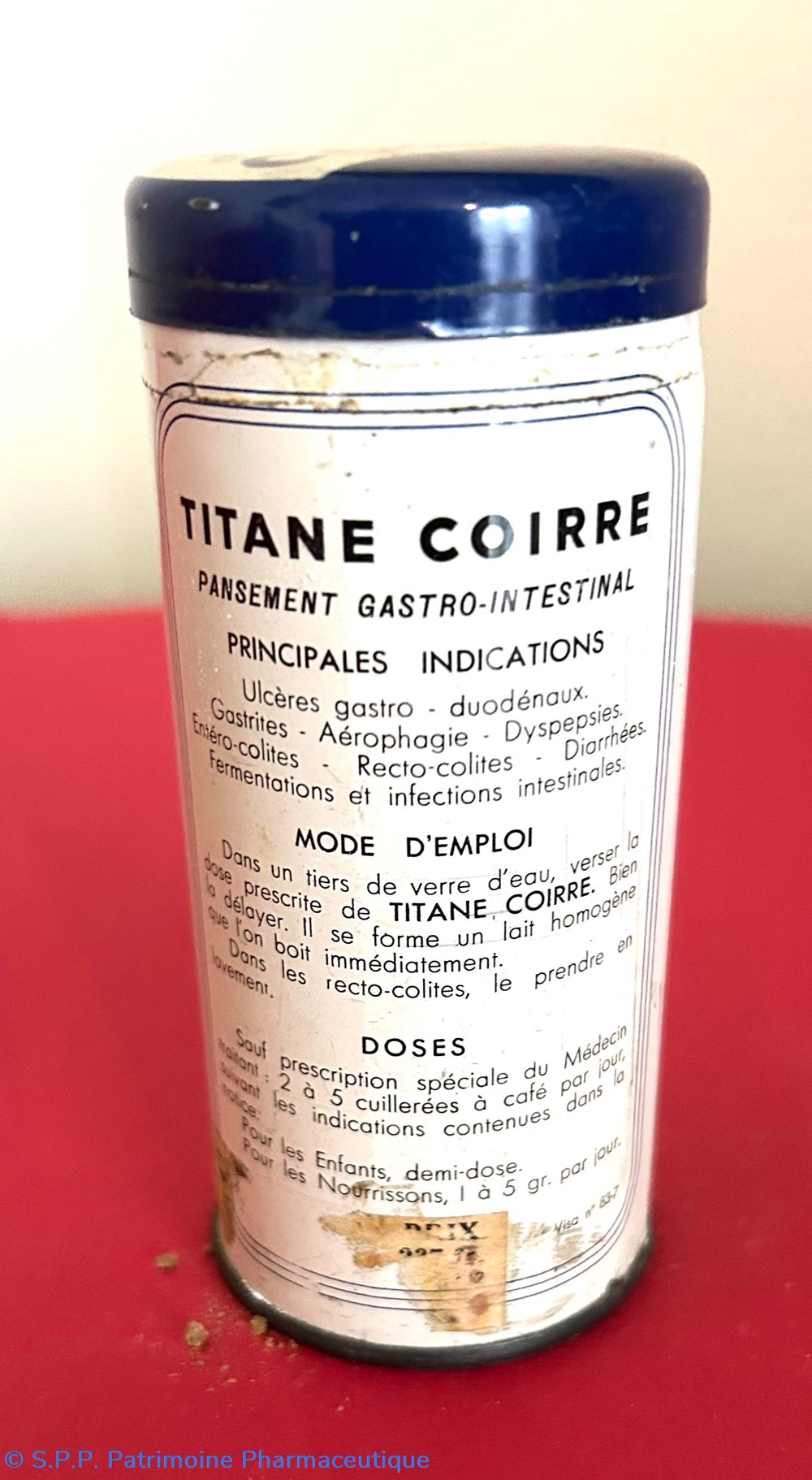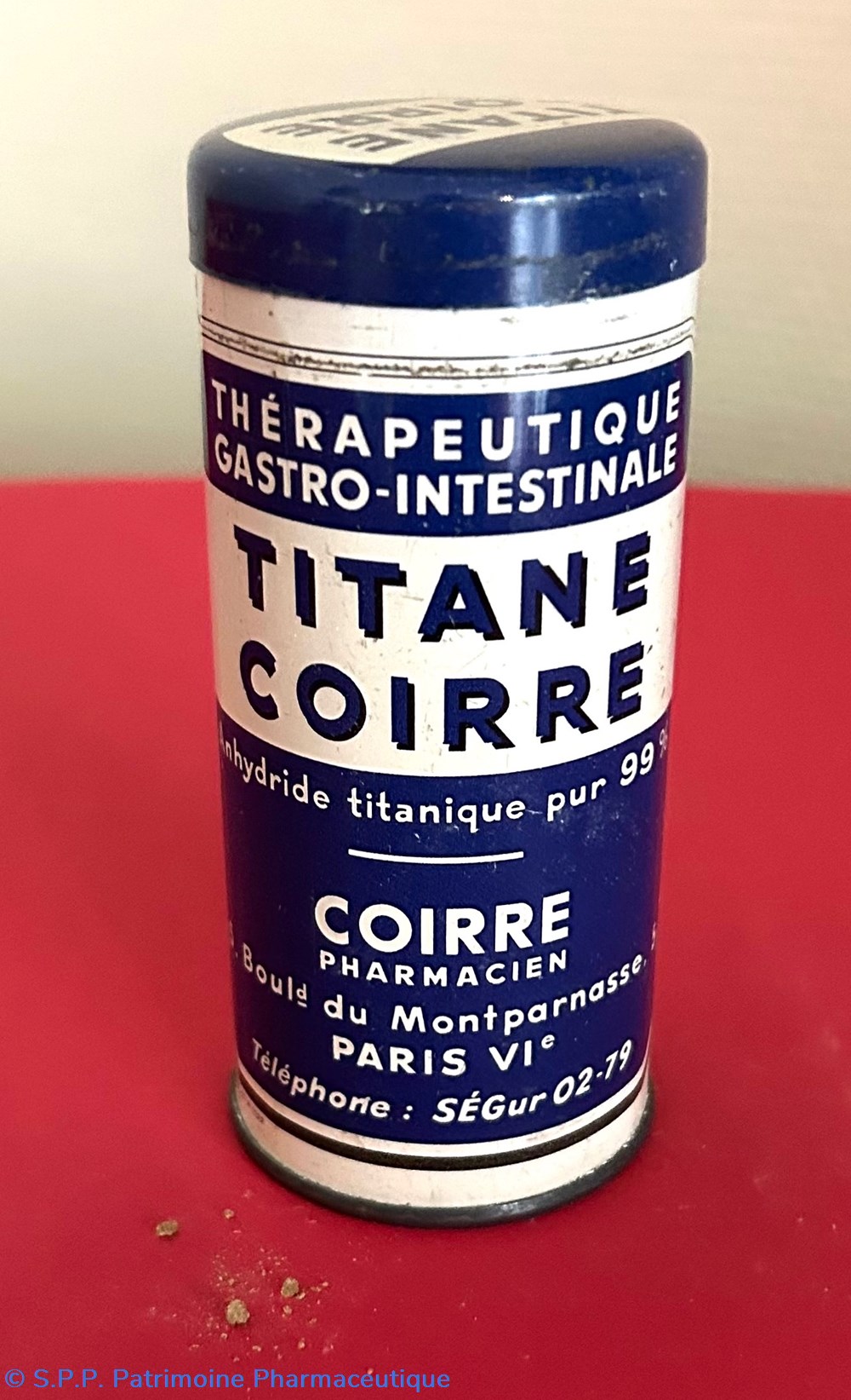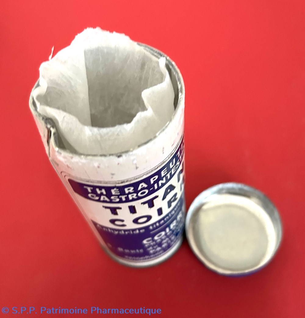 boîte métallique de forme cylindrique avec un couvercle inséré sur le dessus. Cette boîte contient un sachet de papier blanc contenant encore du médicament : une poudre blanche.