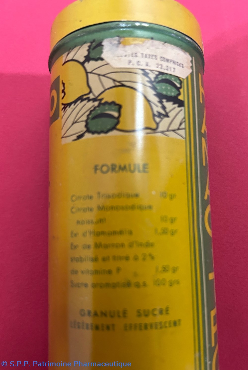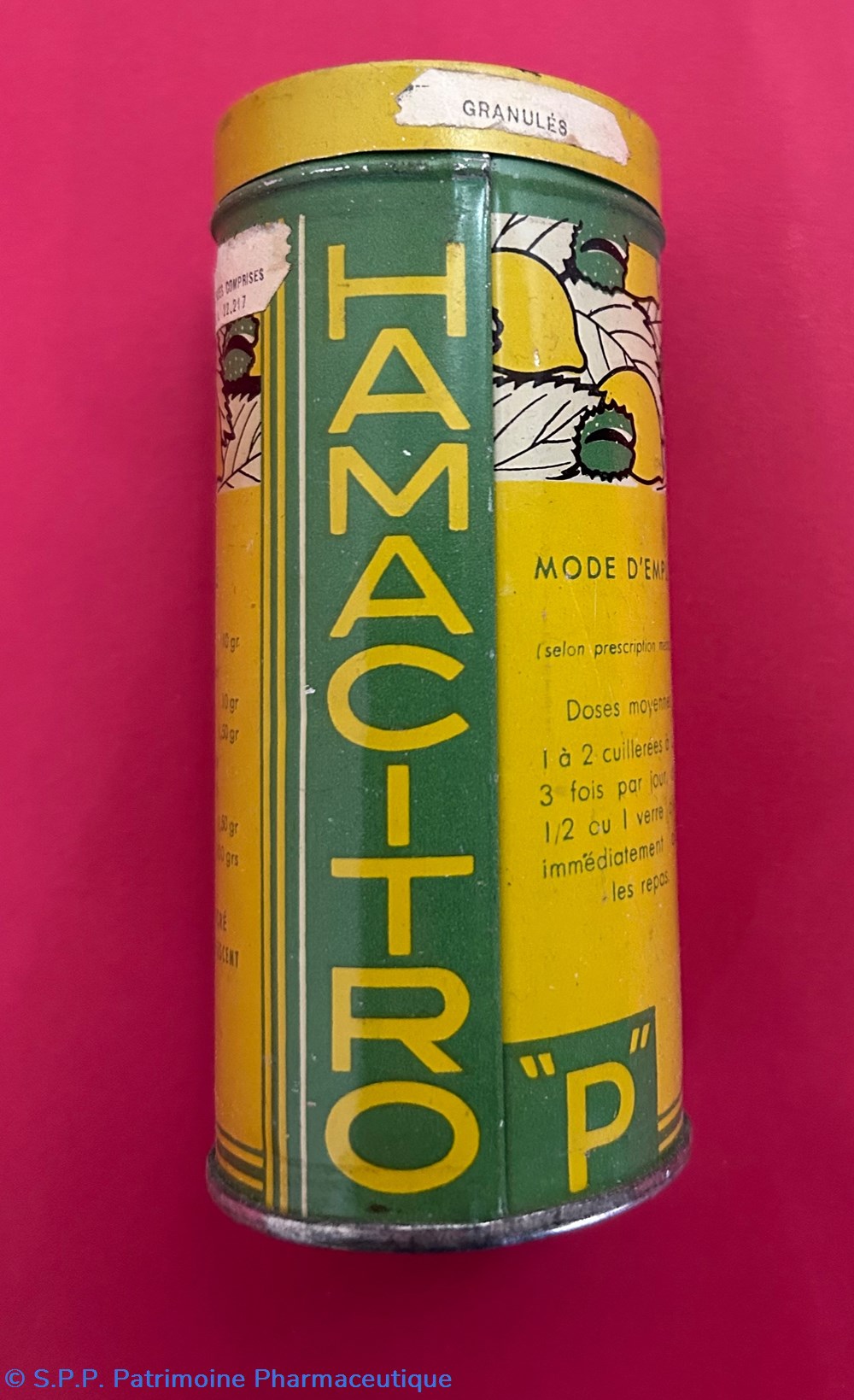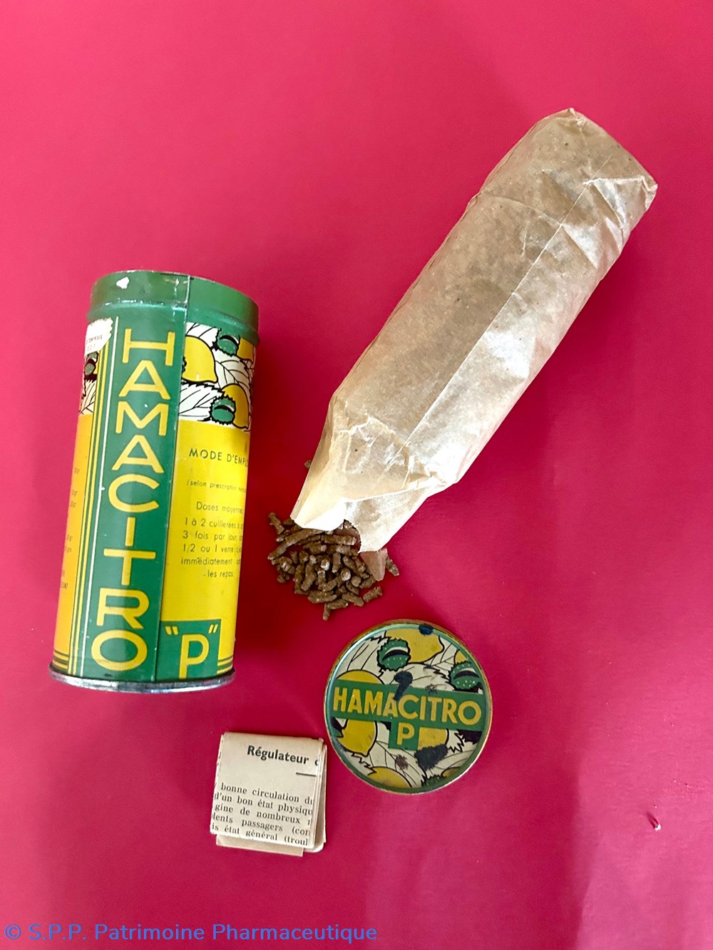 boîte métallique de forme cylindrique avec un couvercle inséré sur le dessus. Cette boîte contient un sachet de papier blanc contenant encore du médicament : une poudre blanche.