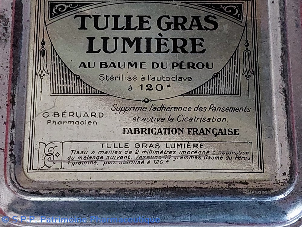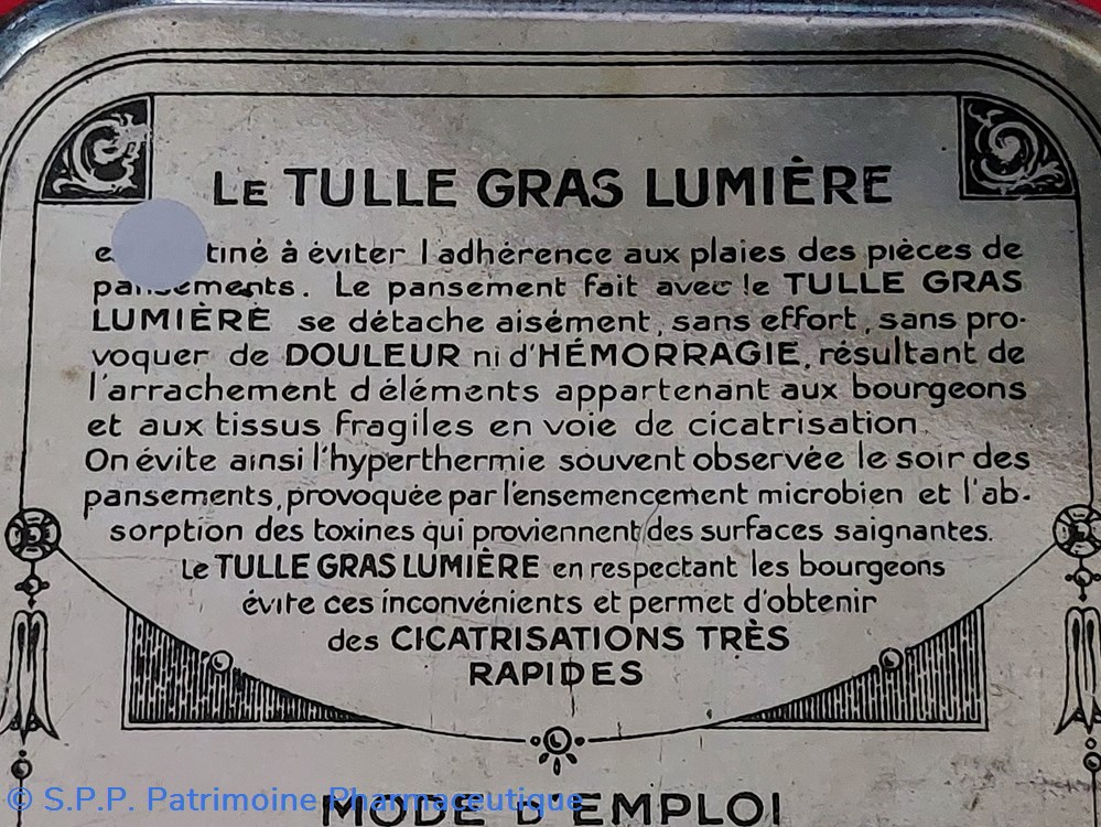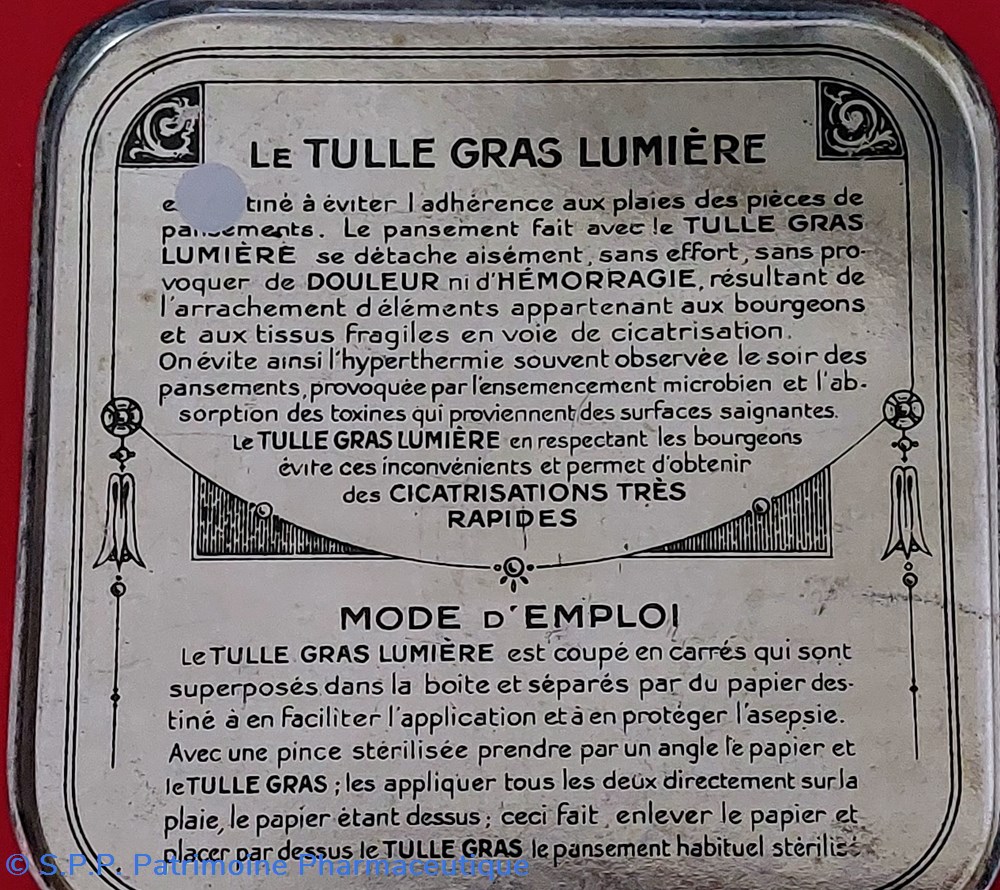 Boîte métallique scellée d'origine contenant 10 Compresses de TULLE GRAS au baume du Pérou stérilisées à l'autoclave.