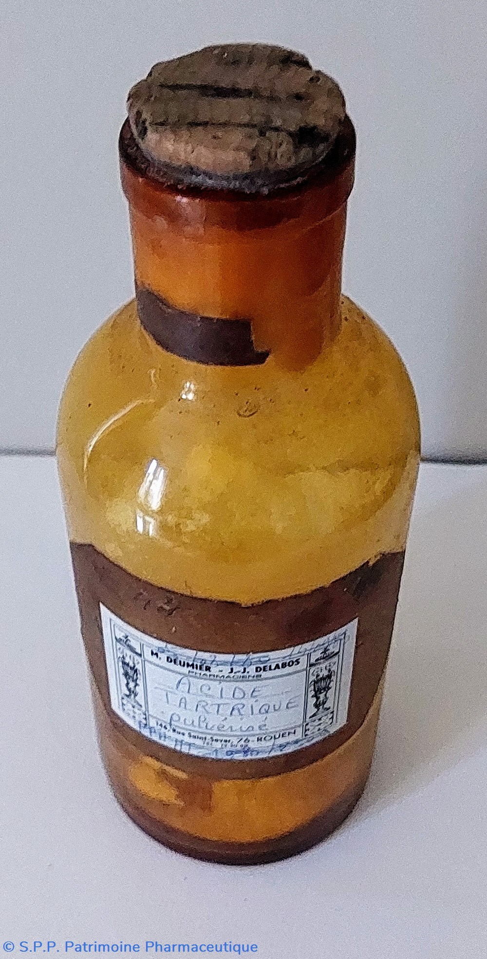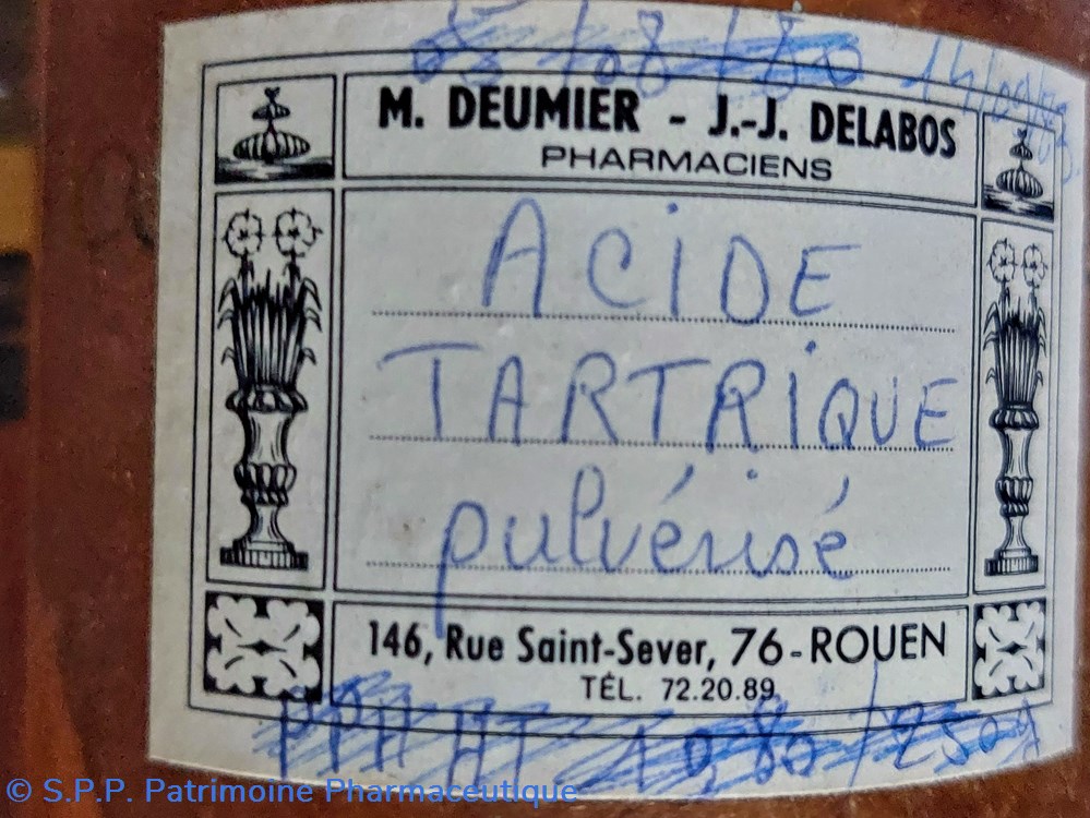 Étiquette de la Pharmacie Deumier et Delabos à Rouen " ACIDE TARTRIQUE PULVÉRISÉ"