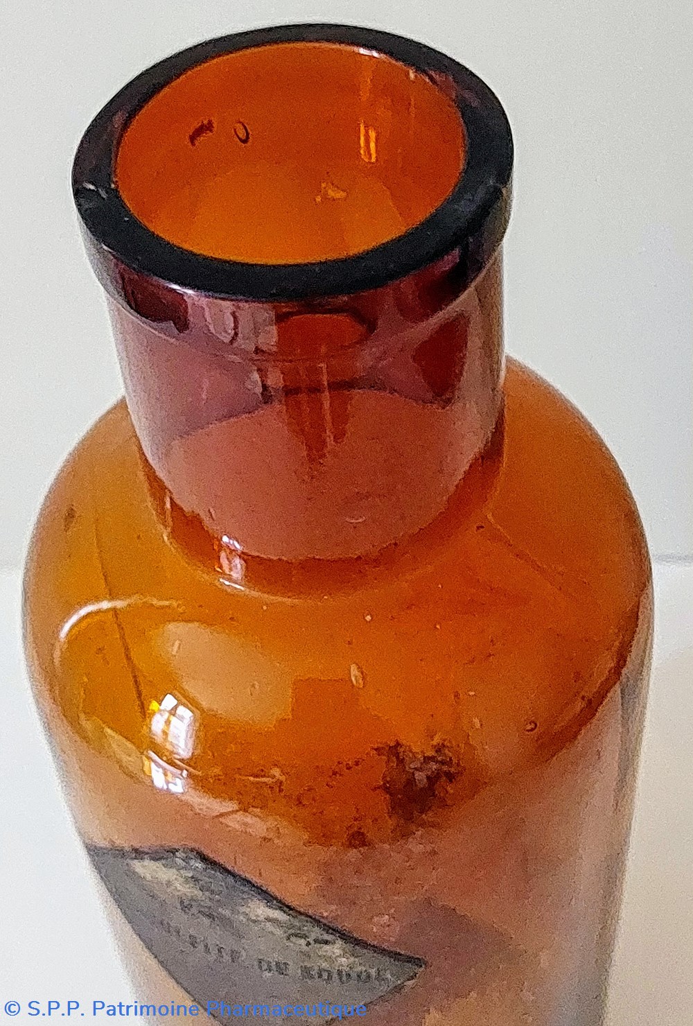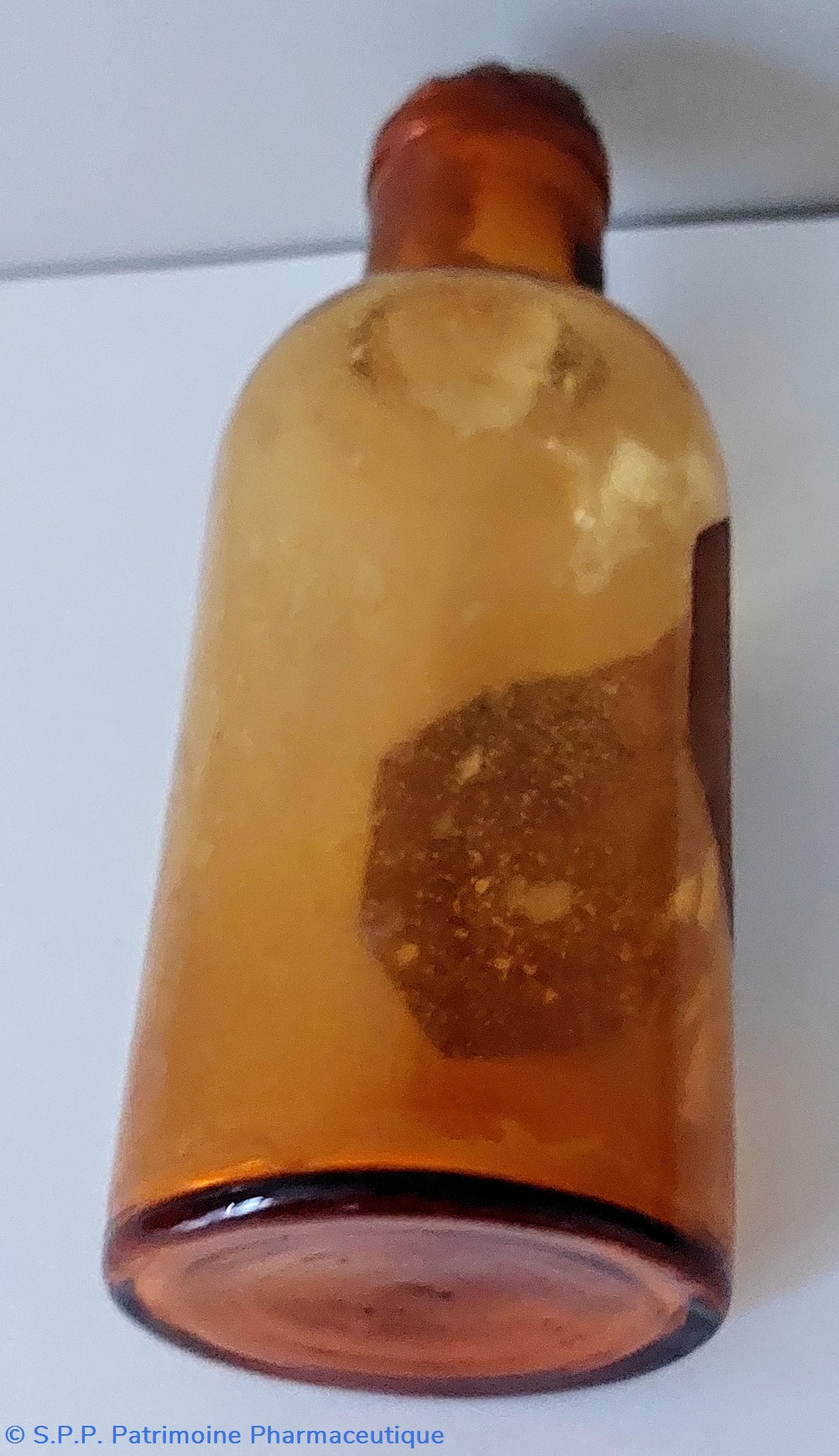 Flacon en verre ambré ayant un bouchon en plastique et montrant des traces de poudre blanche.