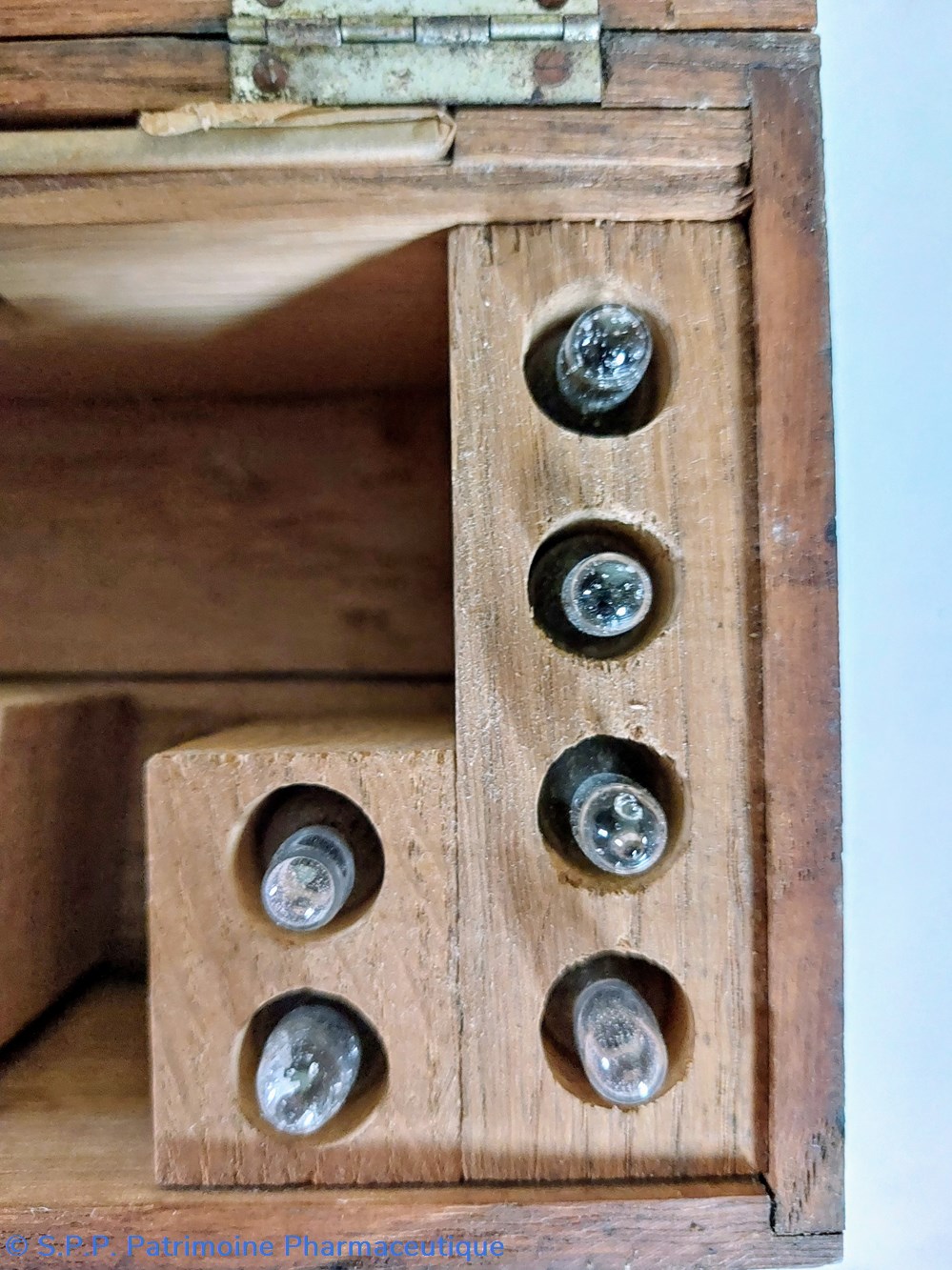 Coffret en bois compartimenté comprenant une plaque de verre coloré, Quatre "cuves de comparaison" (= petits tubes à essais à fond plat - Deux ampoules avec bouchon en liège - Six ampoules de réactifs ( nitrite d'ammonium, sulfamate, réactif IV,)