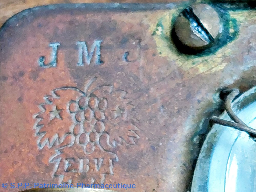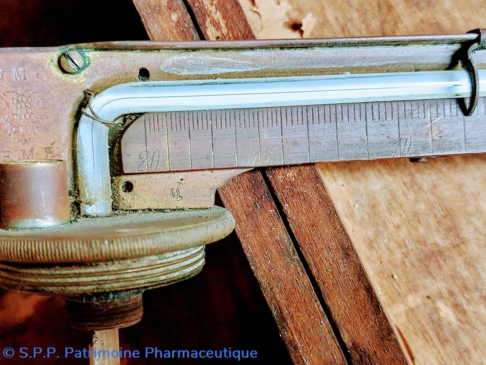 Réglette graduée indiquant " Degré réel" jusqu'à 20. On y trouve gravé une feuille de vigne et une grappe de raisin et JMJ EM ? "