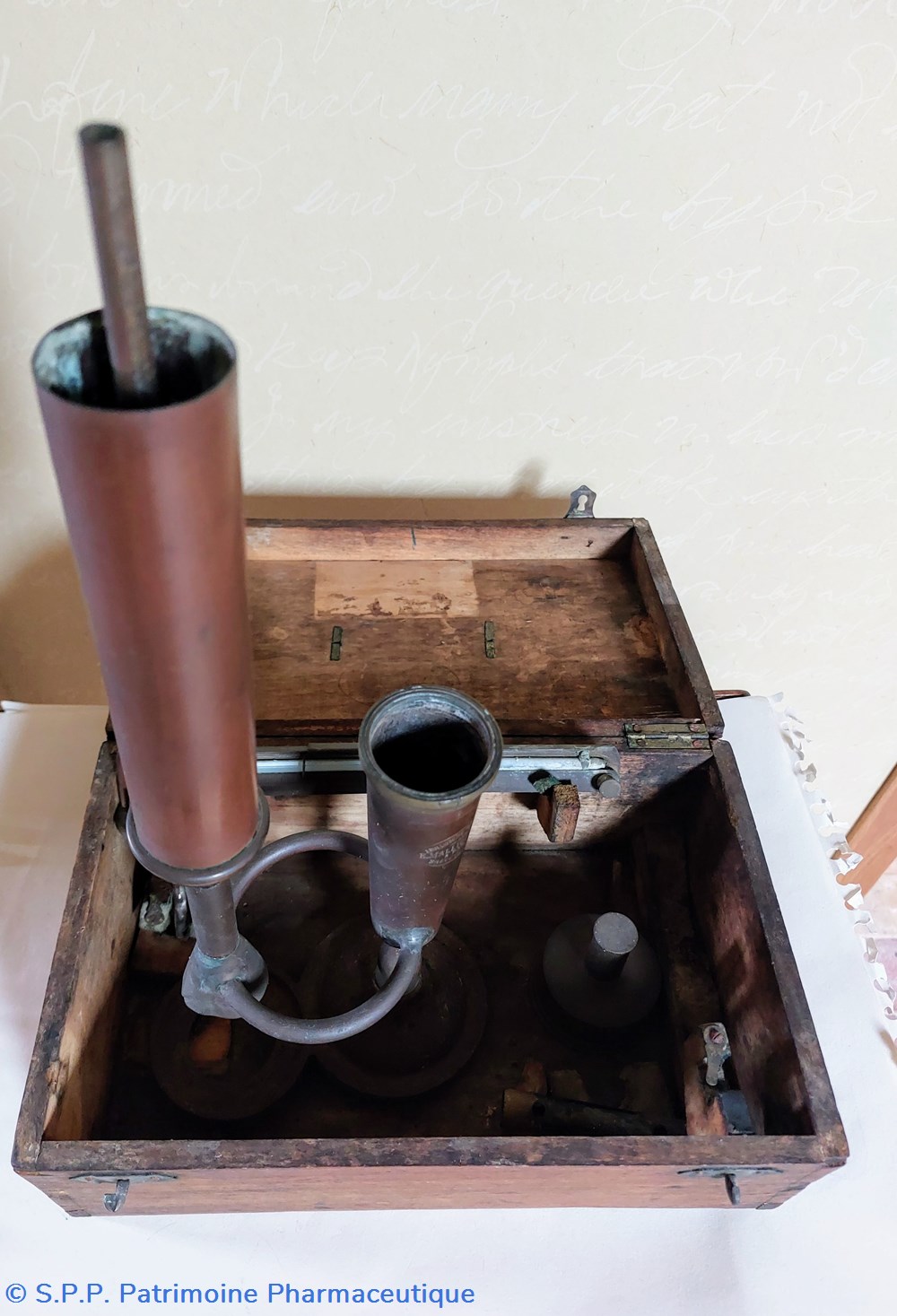 Dans une mallette en bois aménagée, un EBULLIOSCOPE en laiton. Malette avec poignée et fermoirs.