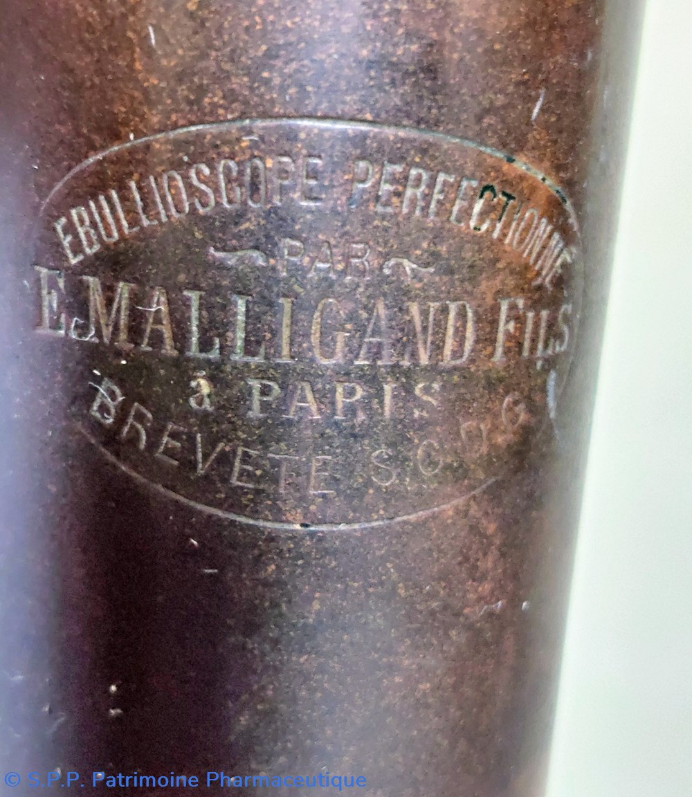 Instrument permettant de mesurer le point d'ébullition d'un 'liquide ou pour déterminer le titre alcoometrique d' un mélange. Il